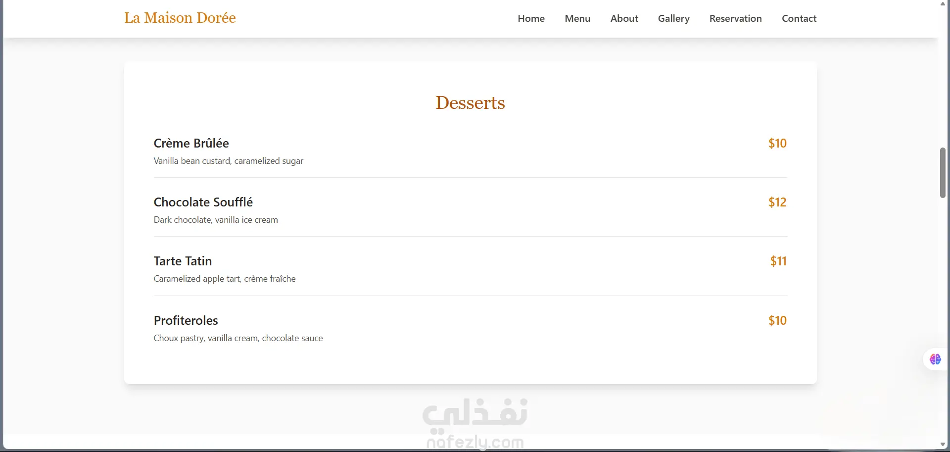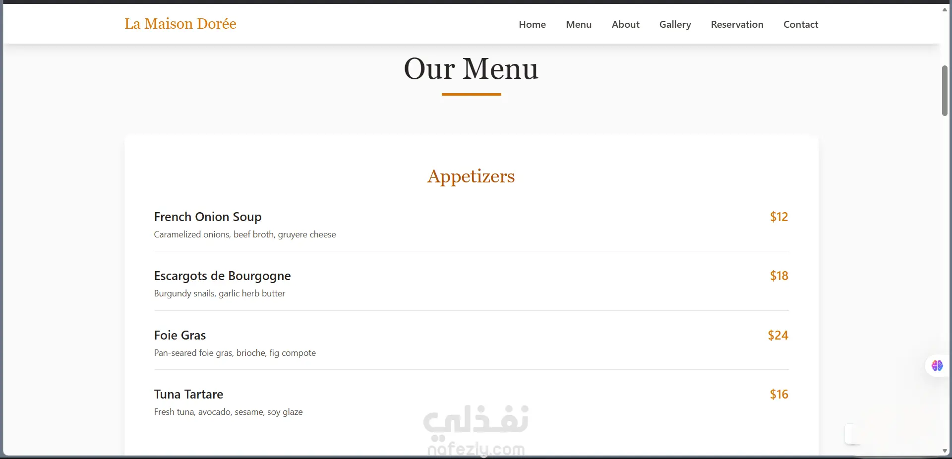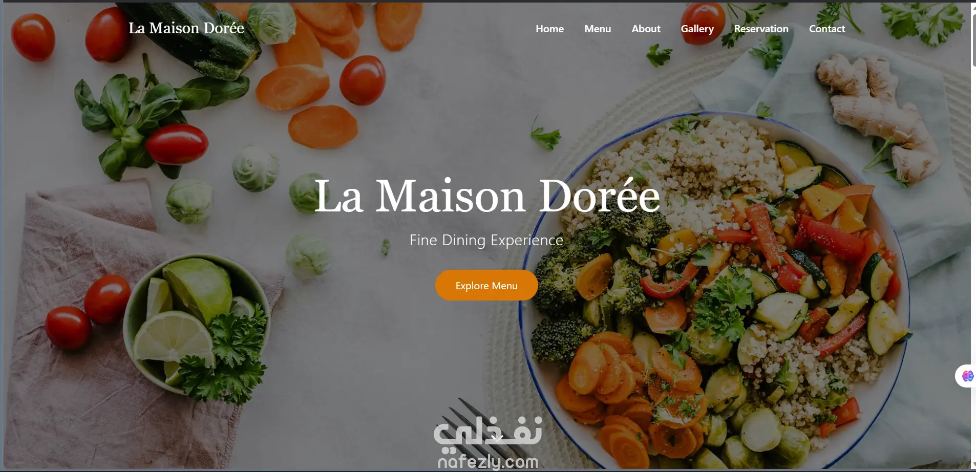 أقدم لك موقع مطعم عصري مصمم بالكامل باستخدام HTML وCSS، متجاوب على كل الأجهزة من موبايل إلى ديسكتوب. الموقع يشمل: