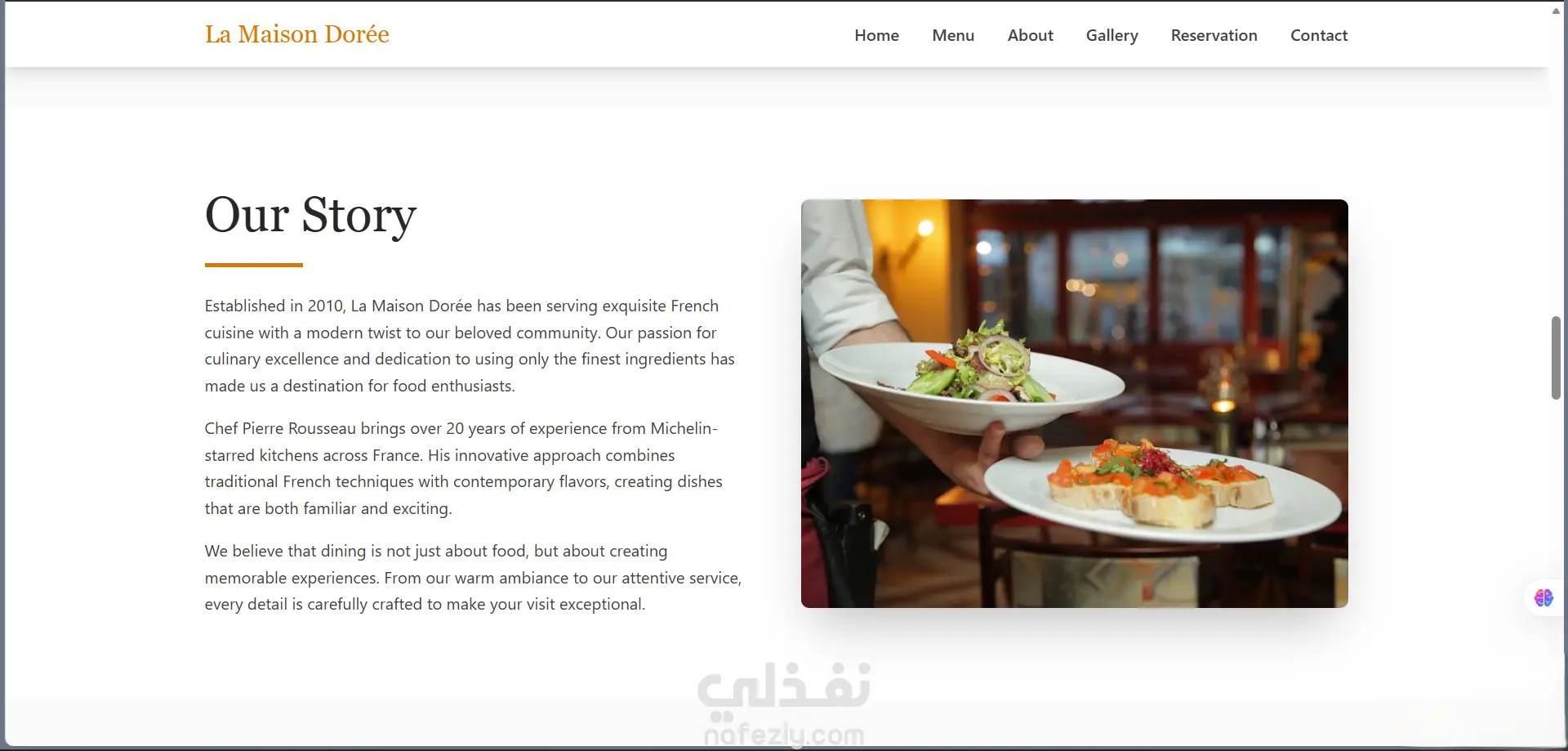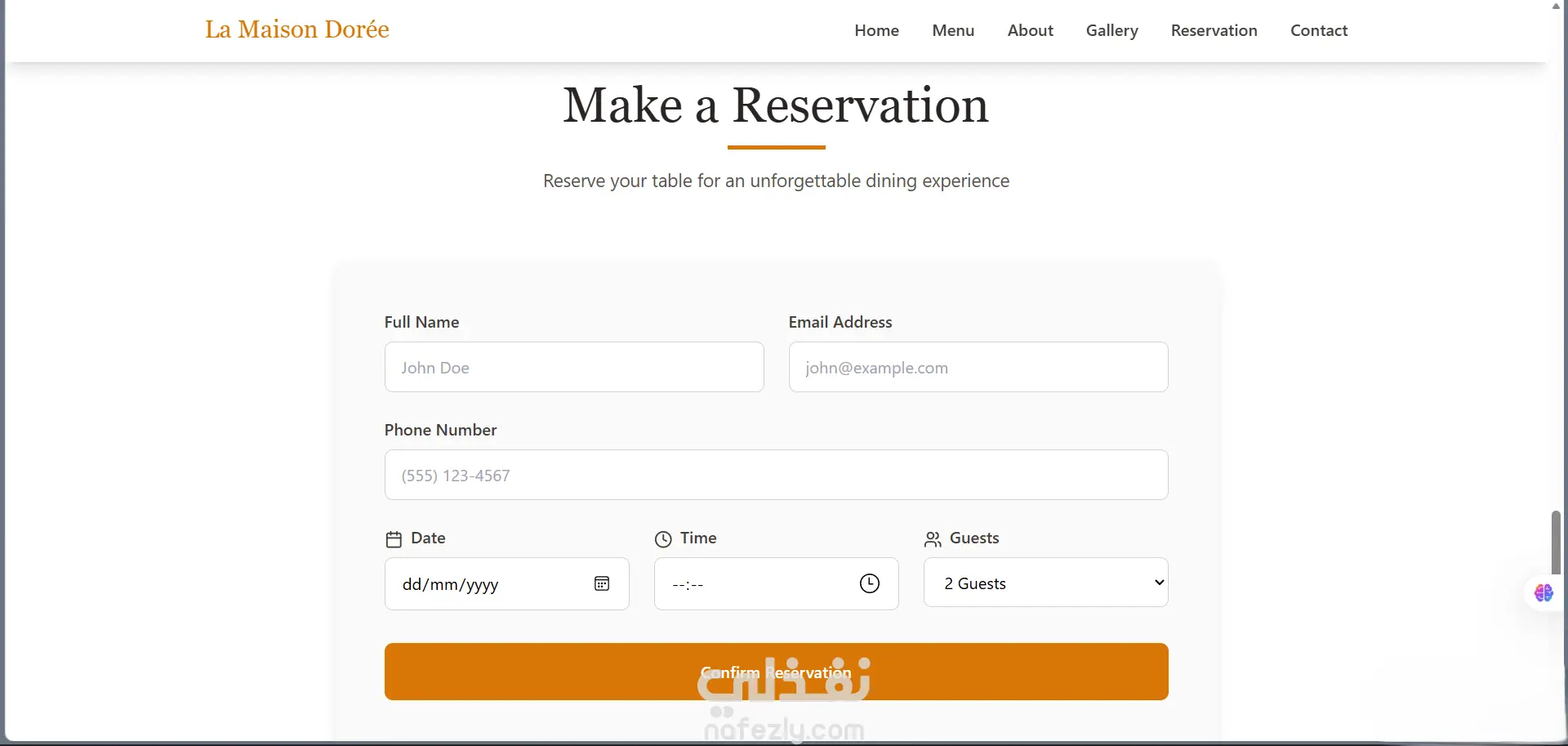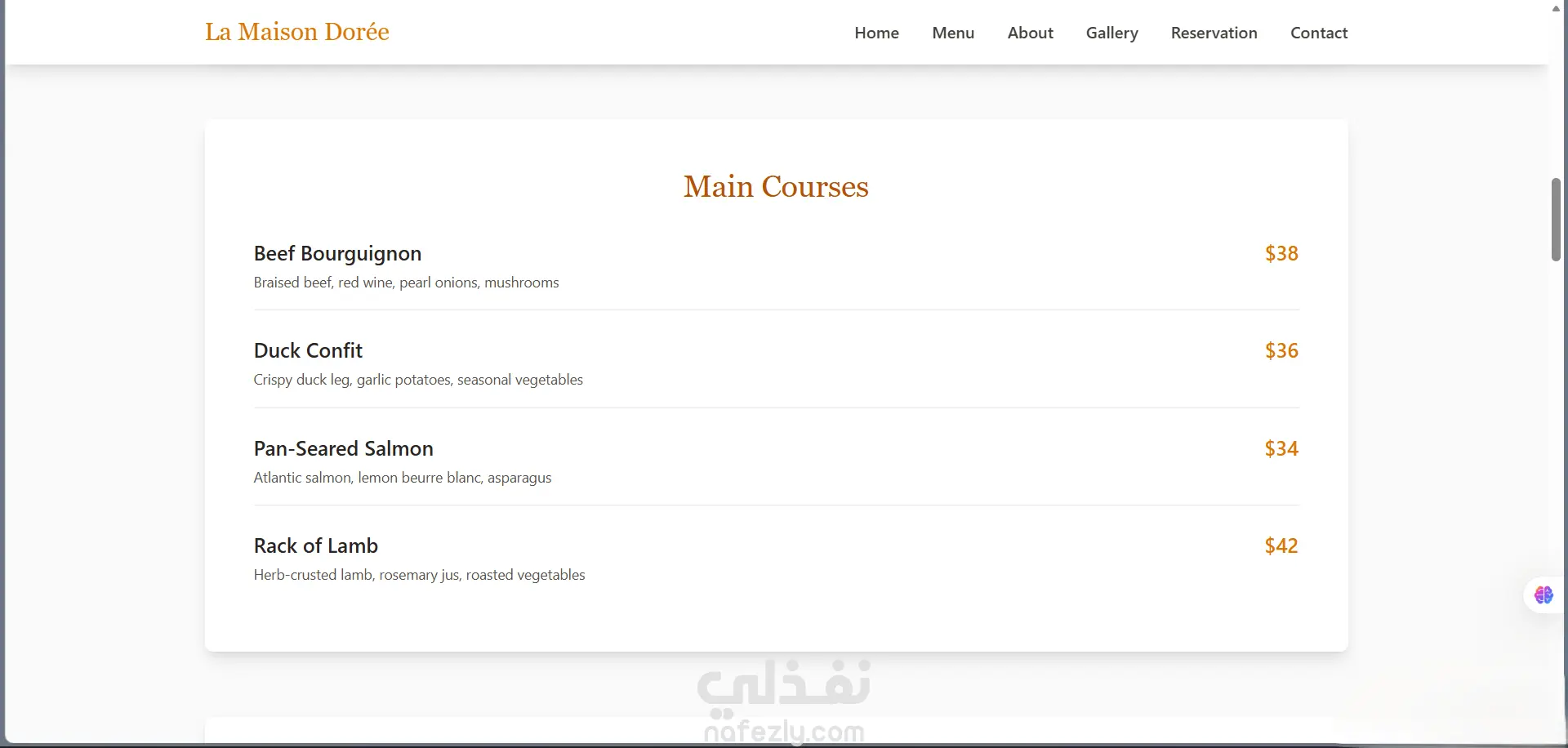 أقدم لك موقع مطعم عصري مصمم بالكامل باستخدام HTML وCSS، متجاوب على كل الأجهزة من موبايل إلى ديسكتوب. الموقع يشمل: