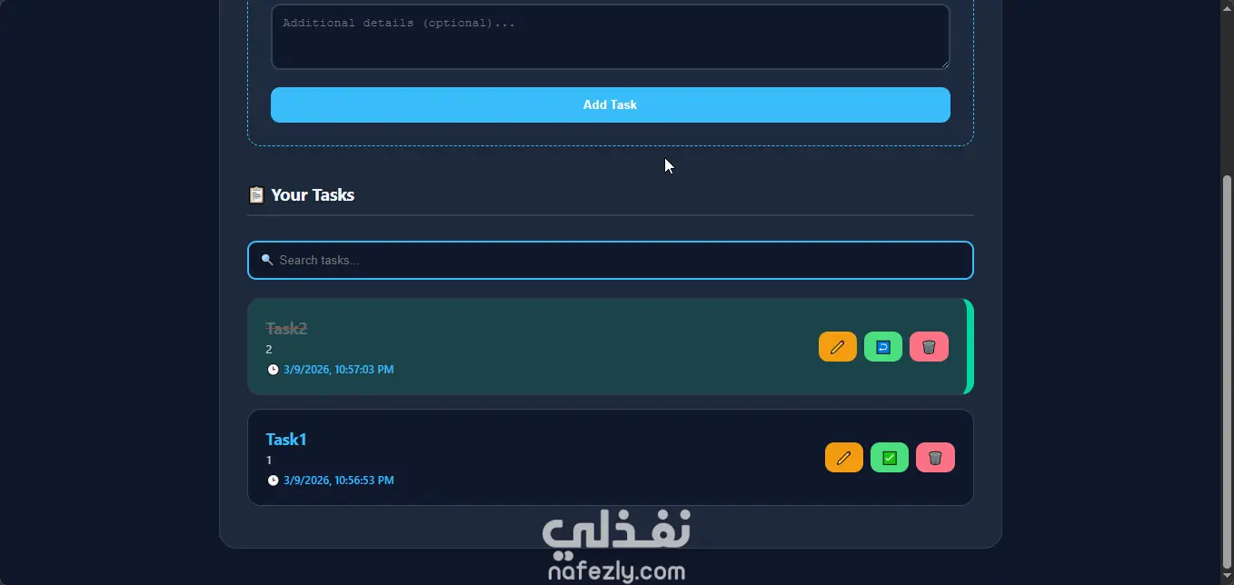 مشروع متكامل لإدارة المهام اليومية يجمع بين الأداء العالي والتصميم العصري، تم بناؤه باستخدام تقنيات مايكروسوفت الحديثة لضمان استقرار النظام وأمان البيانات. أبرز مميزات المشروع: الخلفية البرمجية (Backend): بناء API احترافي باستخدام ASP.NET Core مع نظام أمان متطور (Identity Service) لتشفير الحسابات. قاعدة البيانات: إدارة وتنظيم البيانات باستخدام SQL Server مع تقنية Entity Framework Core. تعدد اللغات والواجهة: واجهة مستخدم (Responsive) تدعم التبديل الفوري بين العربية والإنجليزية، بالإضافة للوضع الليلي (Dark Mode). الأدوات المستخدمة: C#، JavaScript، CSS، وتنسيقات Tailwind الحديثة.