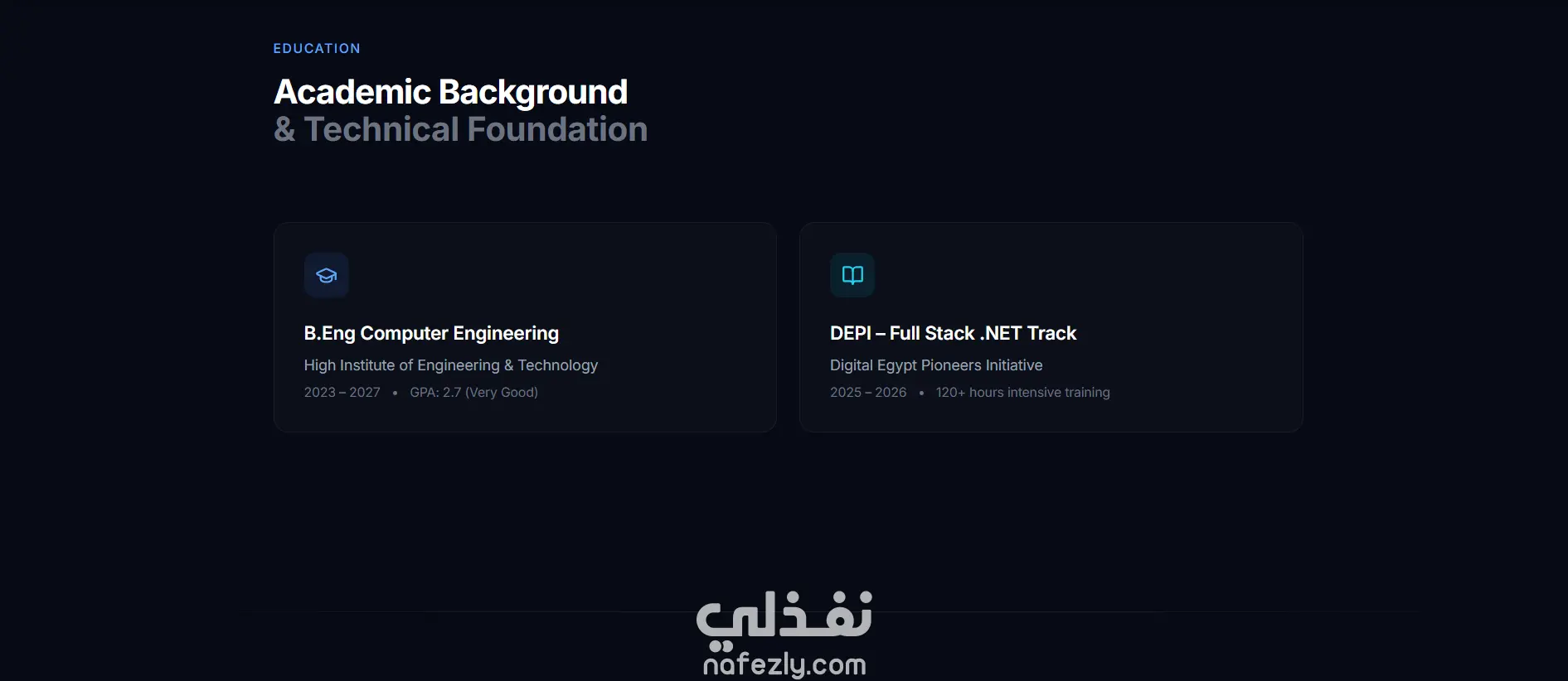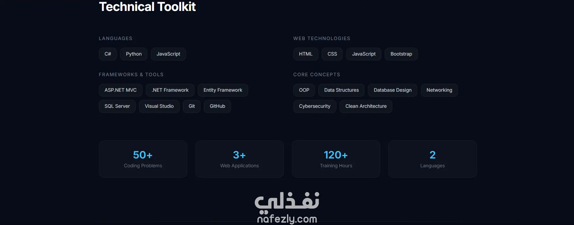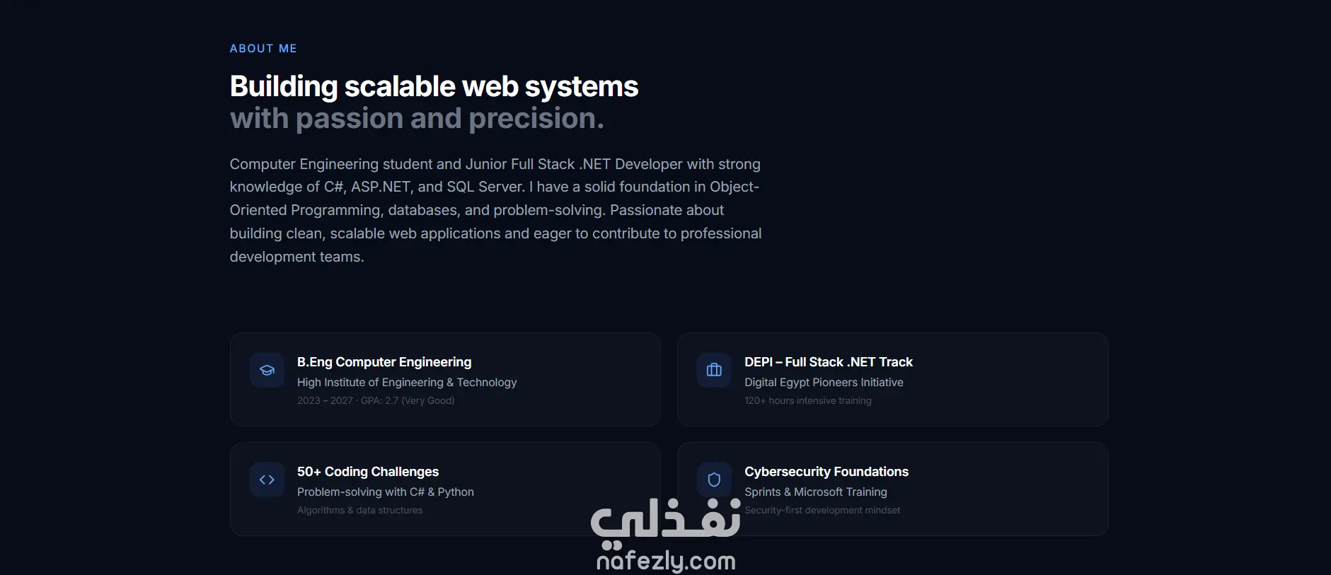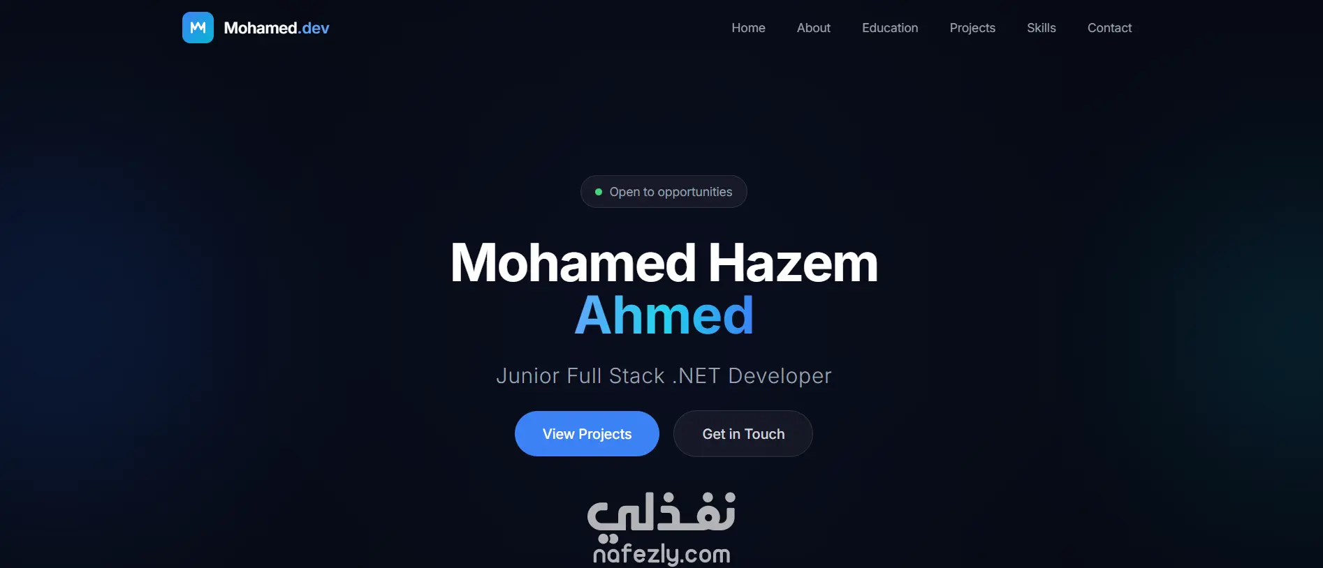 قمت بتصميم وتطوير موقع Portfolio شخصي لعرض المهارات والمشاريع بطريقة احترافية. يتضمن الموقع أقسامًا متعددة مثل نبذة عني، المهارات التقنية، المشاريع السابقة، ووسائل التواصل. تم تطوير الموقع باستخدام: HTML CSS JavaScript ويتميز التصميم بأنه: متجاوب مع جميع الأجهزة (Responsive Design) واجهة مستخدم بسيطة وسهلة الاستخدام سرعة في الأداء والتنقل بين الصفحات