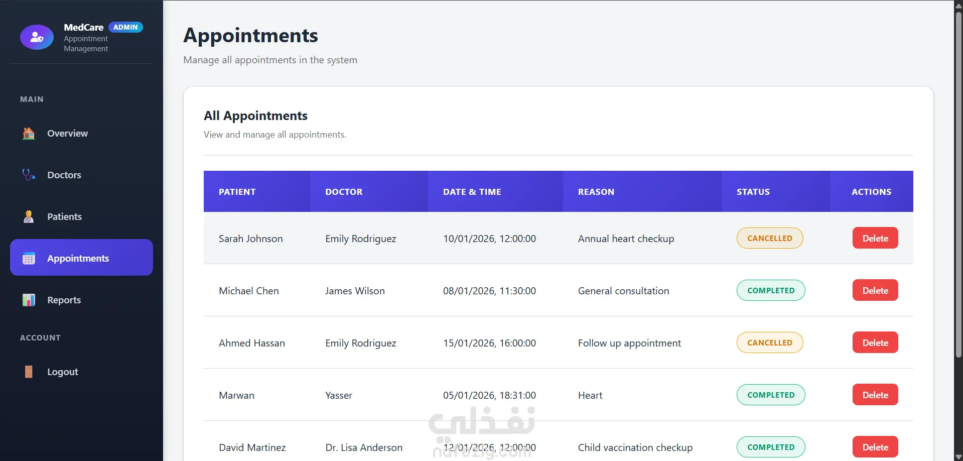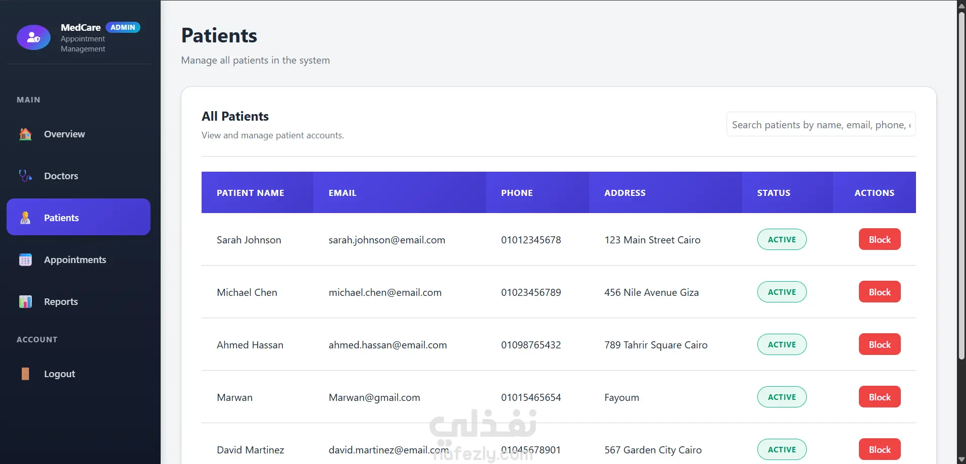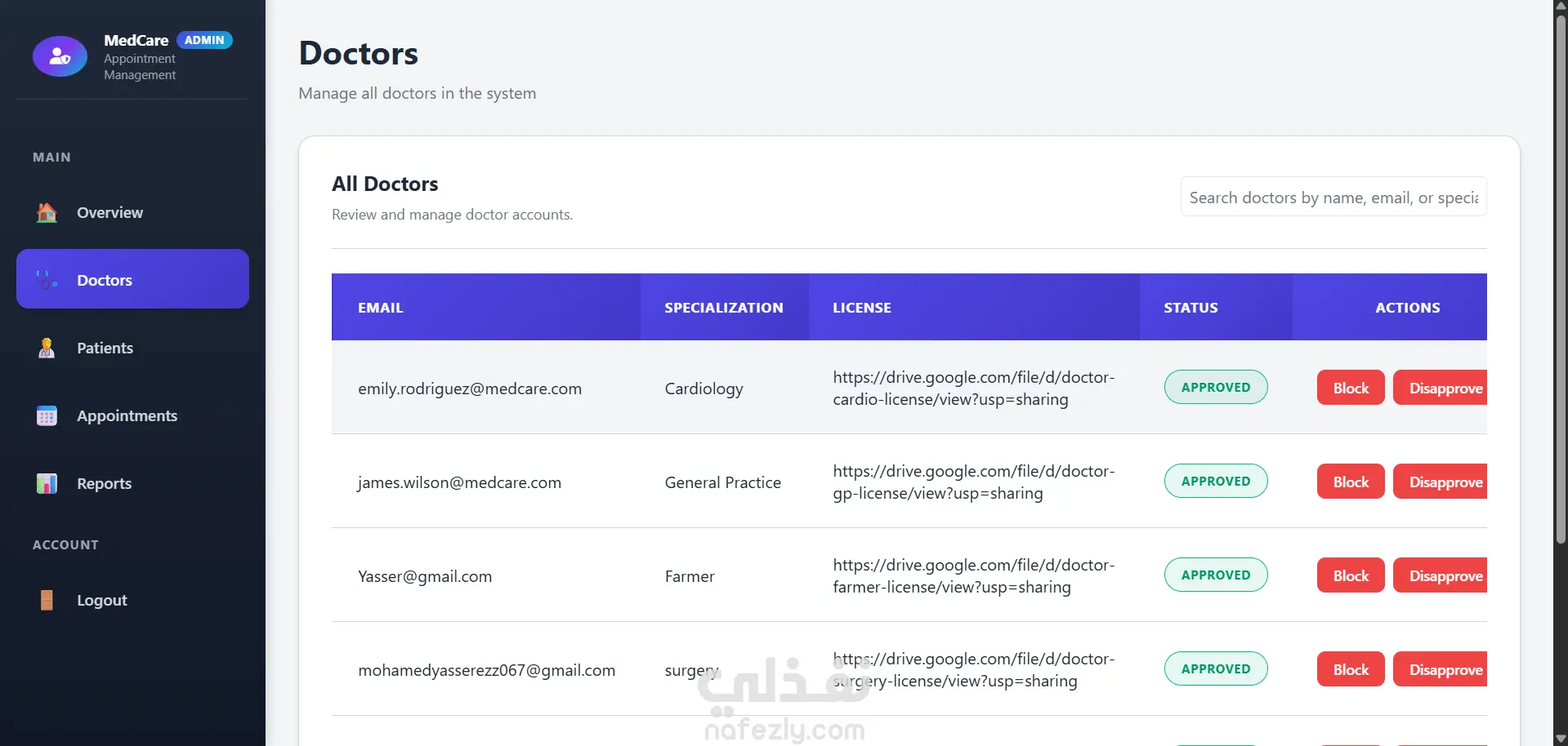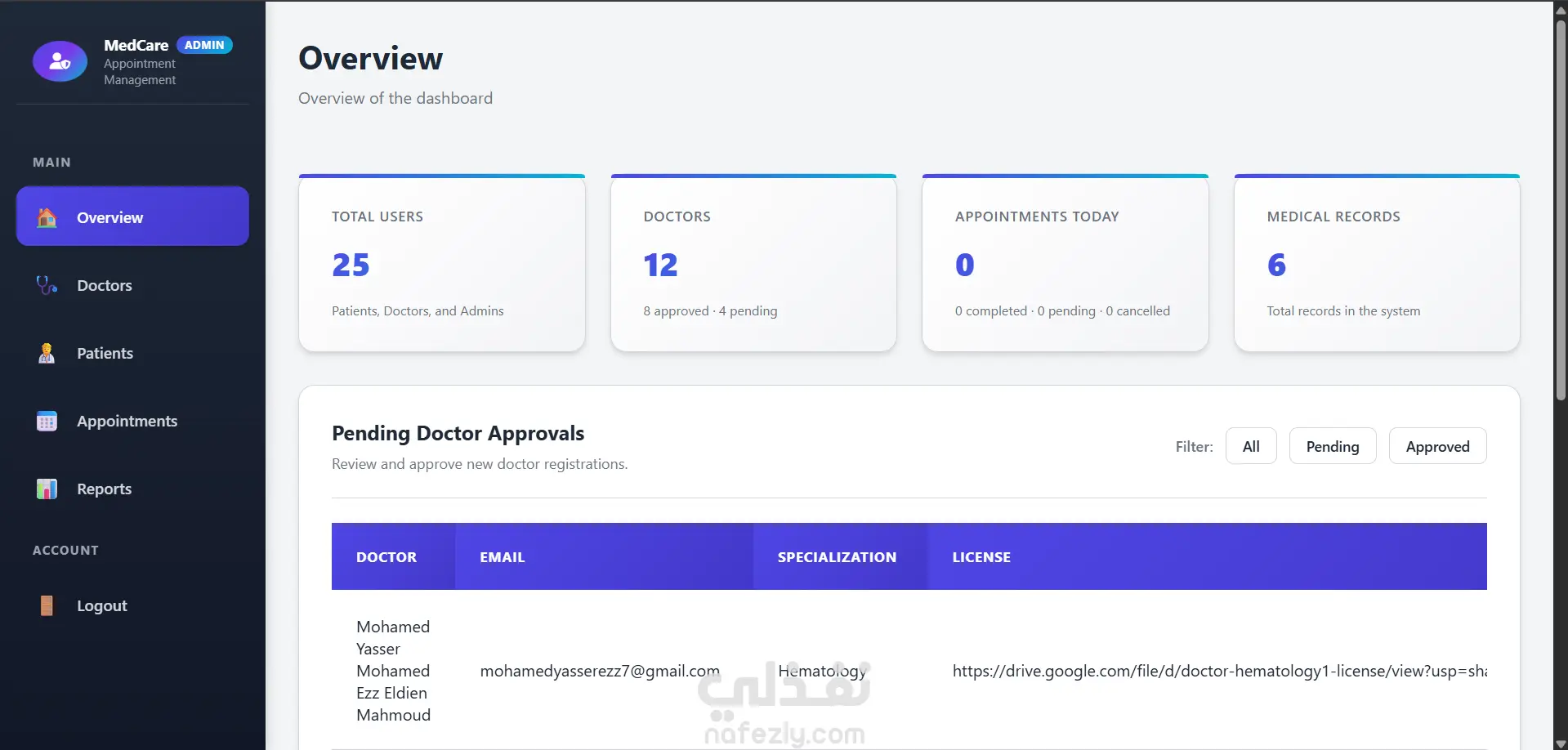 - لوحة تحكم الإدارة (Admin Dashboard) احصائيات عدد المستخدمين للموقع و عدد المستخدمين المرضي و الاطباء إدارة شاملة للمستخدمين (أطباء + مرضى) عرض ومراقبة جميع المواعيد والتطبيقات إدارة بيانات الأطباء والمرضى تفعيل وتعطيل حسابات المستخدمين متابعة جميع عمليات النظام