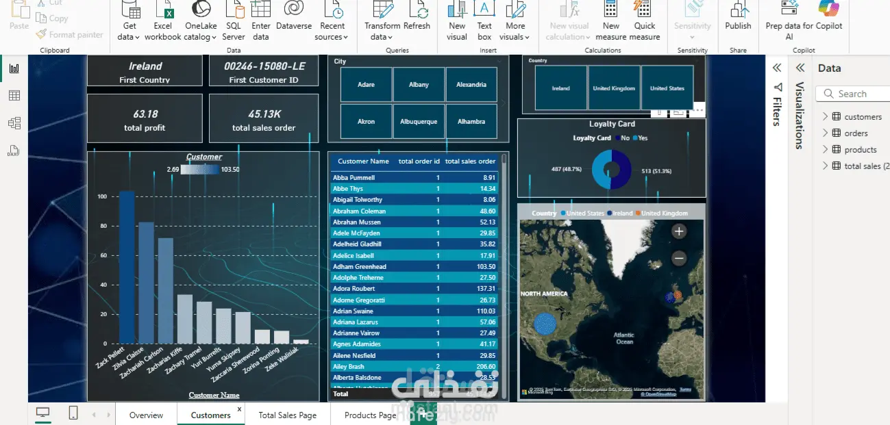 خلال هذا المشروع، قمت بتطوير تقرير تفاعلي لتحليل بيانات مبيعات القهوة، بدءًا من تنظيم البيانات في Excel وحتى تصميم لوحة معلومات شاملة في Power BI لدعم اتخاذ القرار. ? خطوات العمل: 1️⃣ تجهيز البيانات في Excel: تم استخدام ملف يحتوي على أربع جداول رئيسية: orders: تفاصيل الطلبات (التاريخ، العميل، المنتج، السعر...). customers: معلومات العملاء. products: بيانات المنتجات (الحجم، النوع، السعر، الربحية). total sales: ملخص شهري للمبيعات حسب نوع القهوة. 2️⃣ استيراد البيانات إلى Power BI: استيراد الجداول باستخدام Power Query. إنشاء العلاقات بين الجداول (Customer ID وProduct ID). التعامل مع جدول المبيعات المجملة كجدول مستقل. 3️⃣ إنشاء المقاييس باستخدام DAX: إجمالي المبيعات (Total Sales) عدد الطلبات عدد العملاء متوسط السعر والربحية أعلى المنتجات أداءً 4️⃣ تصميم صفحات التقرير التفاعلي: Overview (نظرة عامة): ملخص شامل يوضح أهم المؤشرات (المبيعات، العملاء، الطلبات، الأداء الشهري، الدول، أنواع القهوة). Customers (العملاء): تحليل تفاعلي لسلوك العملاء، أعلى العملاء من حيث الشراء، توزيع Loyalty Card، وعدد الطلبات لكل عميل. Products (المنتجات): مقارنة بين المنتجات من حيث الربحية والسعر والحجم، وتحليل حسب Roast Type. Total Sales (المبيعات الشهرية): تحليل الأداء عبر الزمن باستخدام الرسوم البيانية والخطية والمصفوفات.