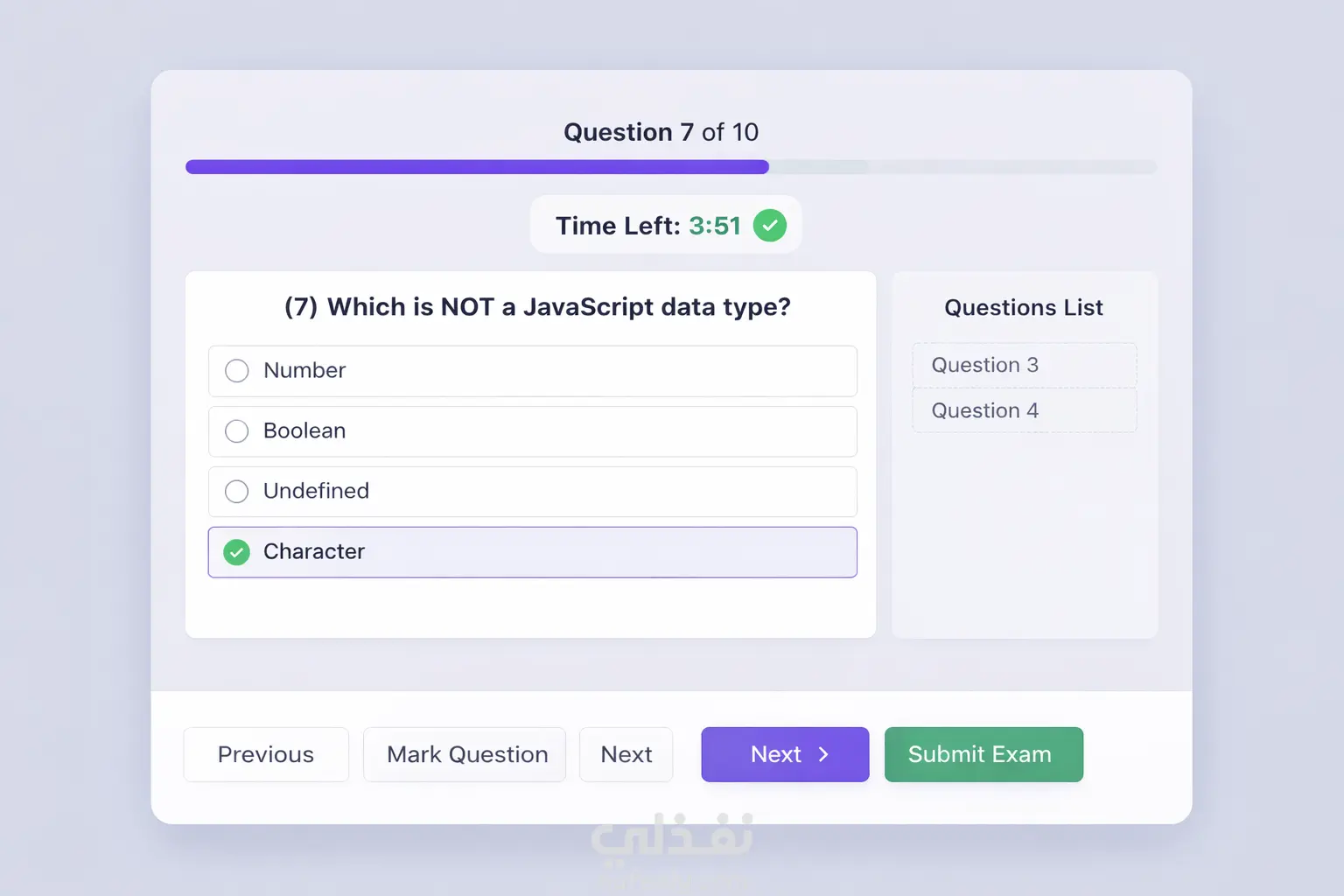 - واجهة امتحان أونلاين تحتوي على:
