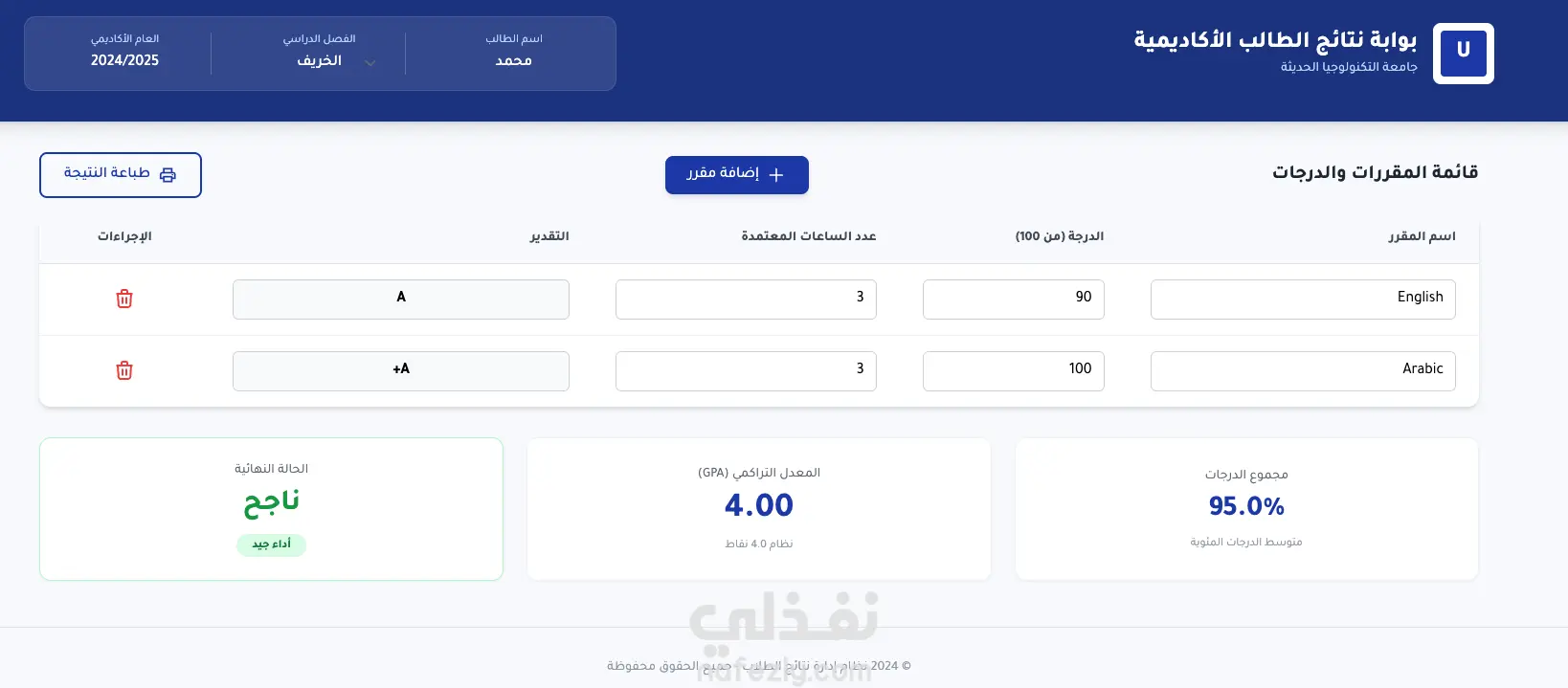 التفاعل الذكي (JS): الصفحة مبرمجة لحساب مجموع الدرجات، المعدل التراكمي (GPA)، والحالة النهائية (ناجح/راسب) تلقائياً بمجرد إدخال الدرجة وعدد الساعات.