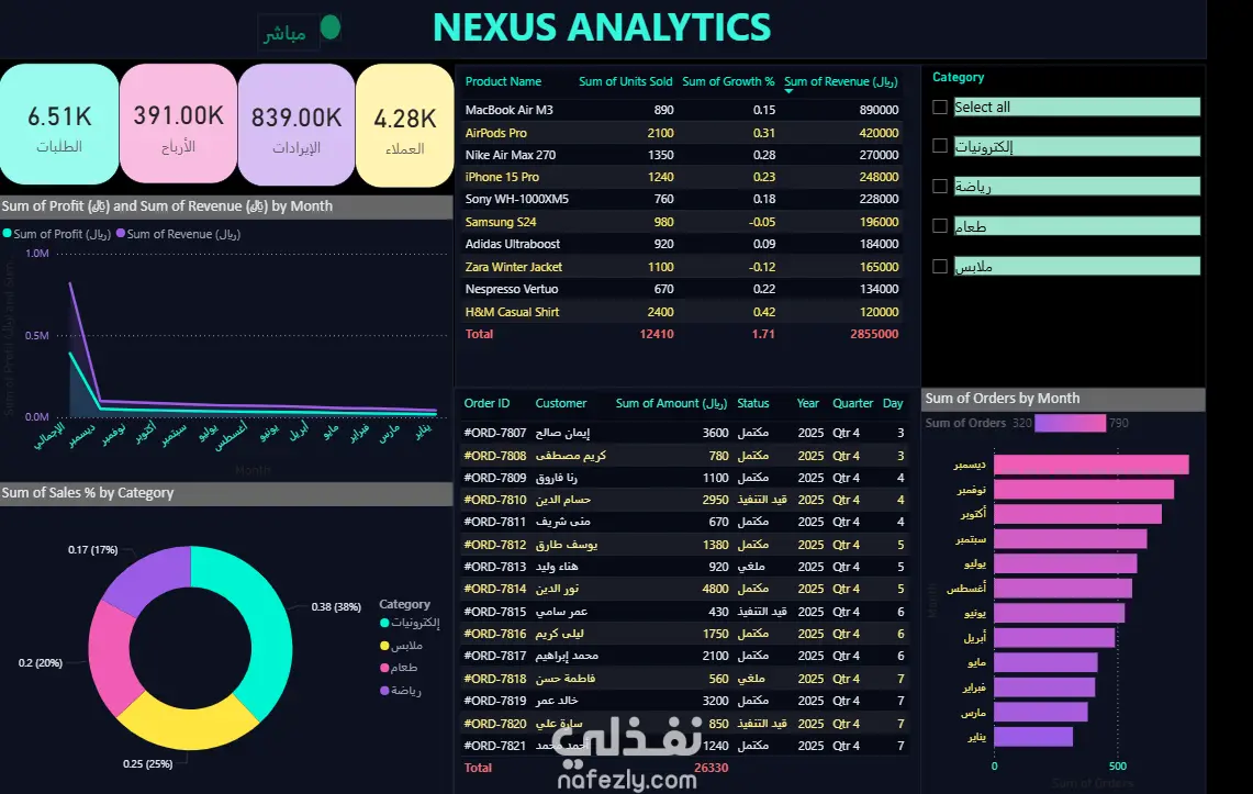 أنشأتُ لوحة تحليلات مبيعات لشركة تجزئة لتتبع الإيرادات والطلبات وأداء المنتجات عبر فئات متعددة. استبدلتُ تقارير Excel المتفرقة بعرض موحد في الوقت الفعلي، وحددتُ المنتجات ذات الأداء الضعيف، ومكّنتُ من تتبع الإيرادات مقارنةً بالأهداف السنوية.