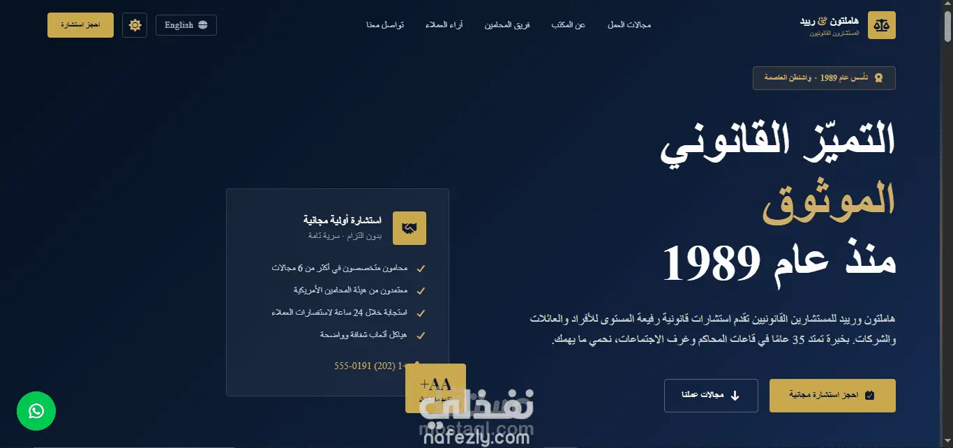 قمت بتصميم وتطوير واجهة موقع عربي احترافية لمكتب هاملتون ورييد للمستشارين القانونيين، مع التركيز على إبراز الهوية المؤسسية للمكتب وعرض الخدمات القانونية بشكل واضح ومنظم. يشمل الموقع أقسامًا متكاملة مثل مجالات الممارسة القانونية، نبذة عن المكتب، فريق المحامين، أبرز القضايا والإنجازات، آراء العملاء، ومعلومات التواصل وحجز الاستشارات.