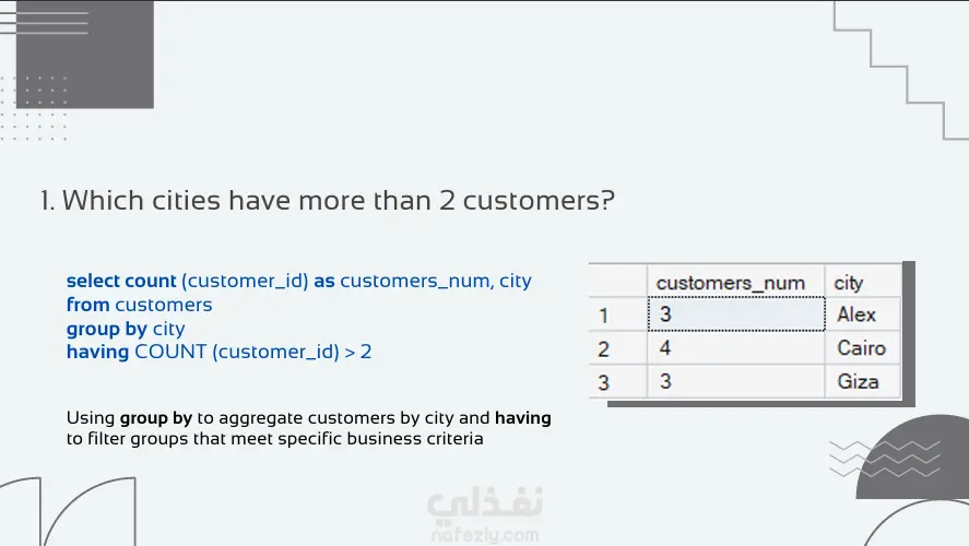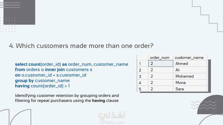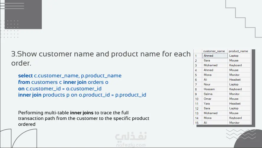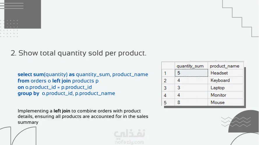 قمت في هذا المشروع ببناء نظام استعلامات متقدم للإجابة على 7 تساؤلات تجارية حول بيانات مبيعات. المشروع يركز على استخراج تقارير دقيقة تساعد في فهم السوق وتحديد نقاط القوة والضعف في الأداء المالي. باستخدام برنامج SQL server قمت بتصميم قاعدة البيانات: بناء الجداول والعلاقات بين المنتجات، العملاء، والطلبات لضمان تكامل البيانات الاستعلامات : استخدام الـ Joins لربط البيانات من جداول مختلفة واستخراج تقارير شاملة التحليل المالي: حساب إجمالي الإيرادات لكل منتج ولكل عميل باستخدام الدوال الحسابية والـ Aggregations. فلترة وتصنيف النتائج: استخدام الـ Grouping والـ Having لتحديد العملاء الأكثر تفاعلاً والمدن الأعلى مبيعاً . ترتيب الأولويات: تحديد أفضل 10 منتجات مبيعاً وأكثر العملاء تحقيقاً للأرباح لدعم استراتيجيات التسويق.