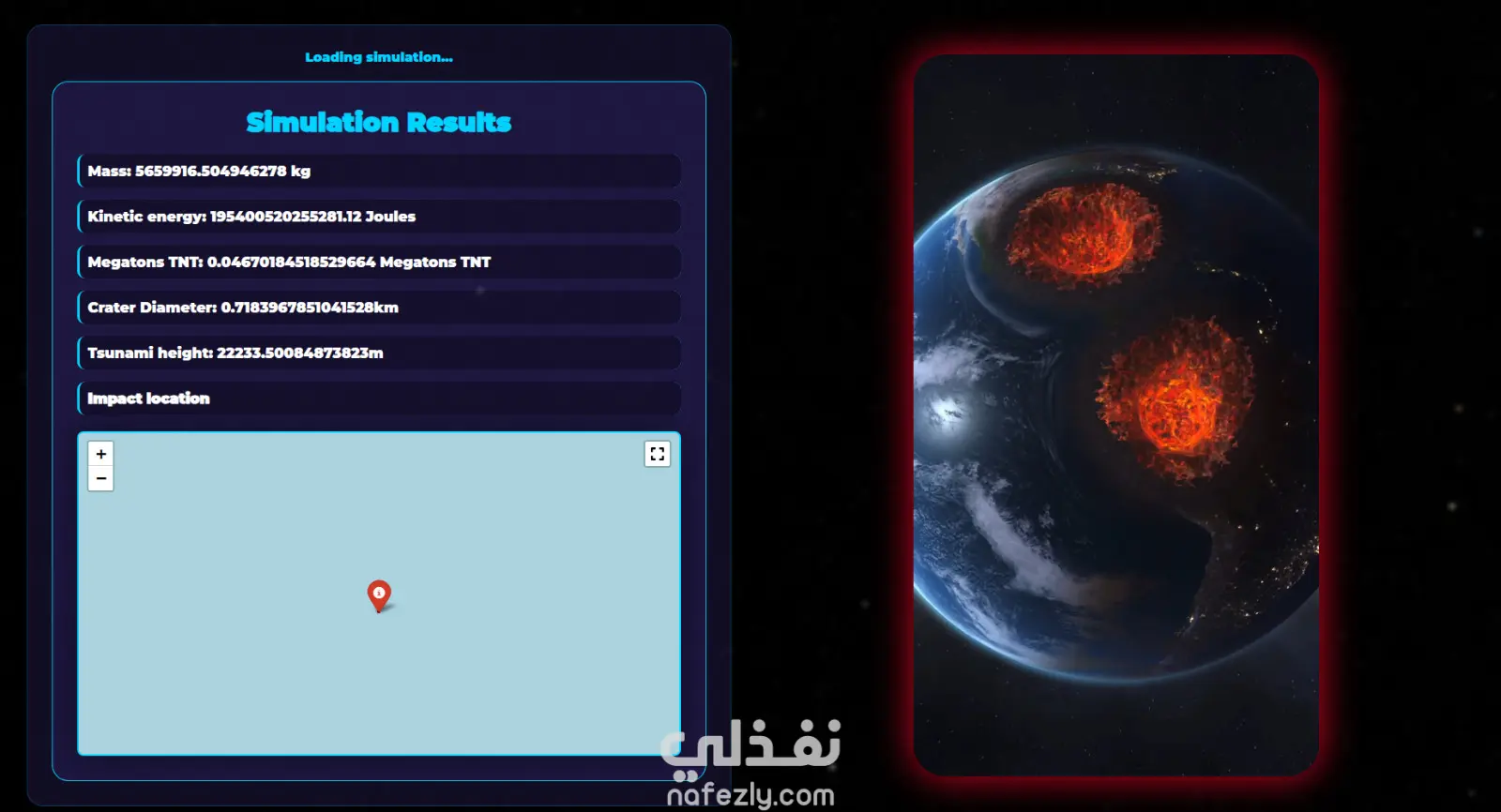 Complex Scenarios: القدرة على التنبؤ بنتائج مختلفة بناءً على موقع الاصطدام (يابسة أو محيط)، مع حساب تأثيرات تسونامي وقوة الزلازل.