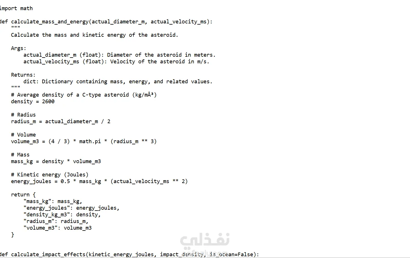 Comprehensive Metrics: الكود لا يحسب الطاقة فقط، بل يحولها لمقاييس مفهومة مثل (قطر الفوهة بالكيلومتر، طاقة الـ TNT، وكتلة الجرم بالطن).