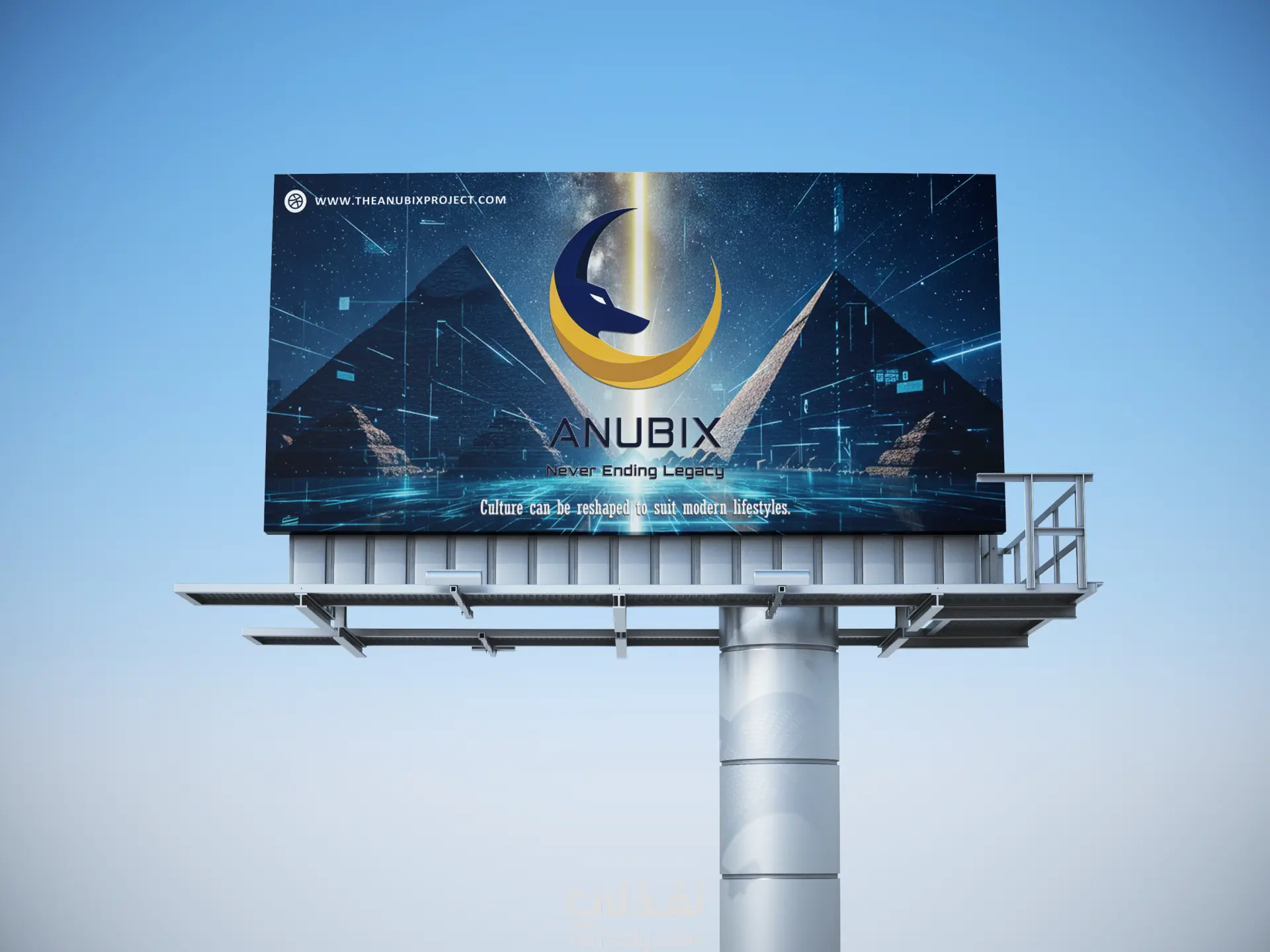 في هذا المشروع، قمت بتصميم لوحة إعلانية (Billboard) لبراند ANUBIX تحت شعار "Never Ending Legacy". الفكرة الأساسية كانت خلق تباين بصري يجمع بين عراقة الماضي المصري القديم وبين التطور التكنولوجي المستقبلي.