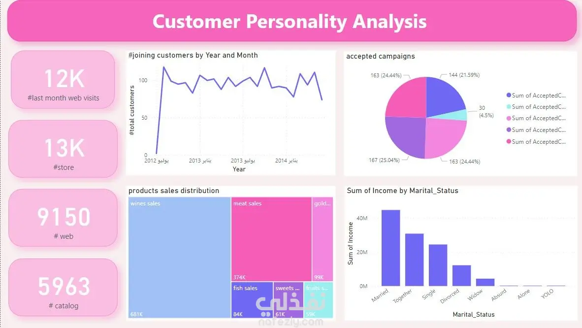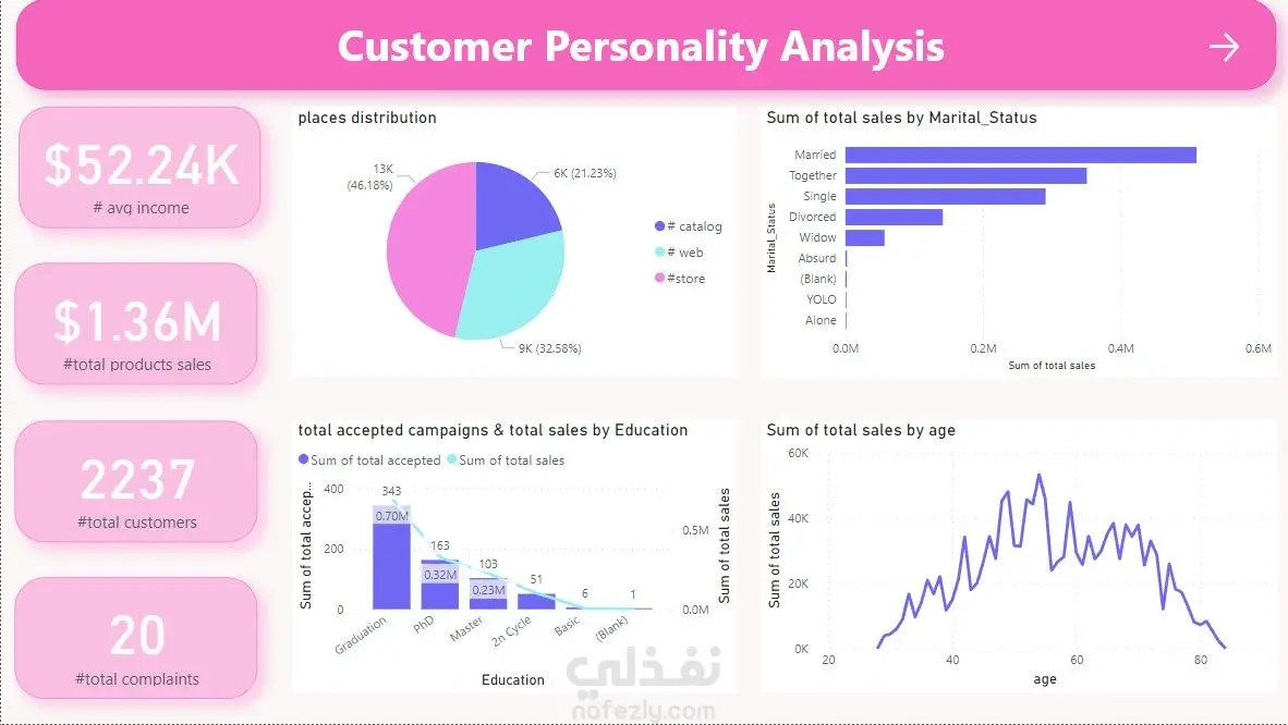 وصف المشروع: تحليل تفصيلي لقاعدة بيانات عملاء تهدف إلى فهم خصائصهم الديموغرافية (العمر، التعليم، الحالة الاجتماعية) وربطها بسلوكهم الشرائي. يساعد هذا المشروع الشركات على تخصيص حملاتهم التسويقية للفئات الأكثر تفاعلاً وربحية (Insights): تحليل القنوات البيعية (Places Distribution): تبين أن "المتجر - Store" هو القناة الأكثر مبيعاً بنسبة 46.18%، يليه الموقع الإلكتروني والكتالوج. تأثير الحالة الاجتماعية: المتزوجون (Married) هم الفئة الأكثر شراءً وإسهاماً في إجمالي المبيعات بقيمة تقترب من 0.6 مليون دولار. التعليم والحملات التسويقية: الفئة الحاصلة على "Graduation" هي الأكثر تجاوباً مع الحملات التسويقية والأعلى شراءً بإجمالي مبيعات 0.7 مليون دولار. الارتباط بالعمر: تتبع توزيع المبيعات حسب السن أظهر أن الفئة العمرية بين 45 و 55 عاماً هي الأكثر نشاطاً في الشراء. المقاييس الرئيسية (KPIs): رصد متوسط دخل العملاء المقدر بـ 52.24 ألف دولار، ومتابعة نسبة الشكاوى الضئيلة (20 شكوى فقط من أصل 2237 عميلاً). الأدوات والتقنيات: Power BI / Excel (Data Visualization): لبناء التقارير التفاعلية والرسوم البيانية المتقدمة. Data Cleansing: التعامل مع القيم المفقودة (مثل الفراغات في الحالة الاجتماعية والتعليم) لضمان دقة التحليل. Business Analytics: استخدام البيانات لدعم القرارات التسويقية (Target Marketing)