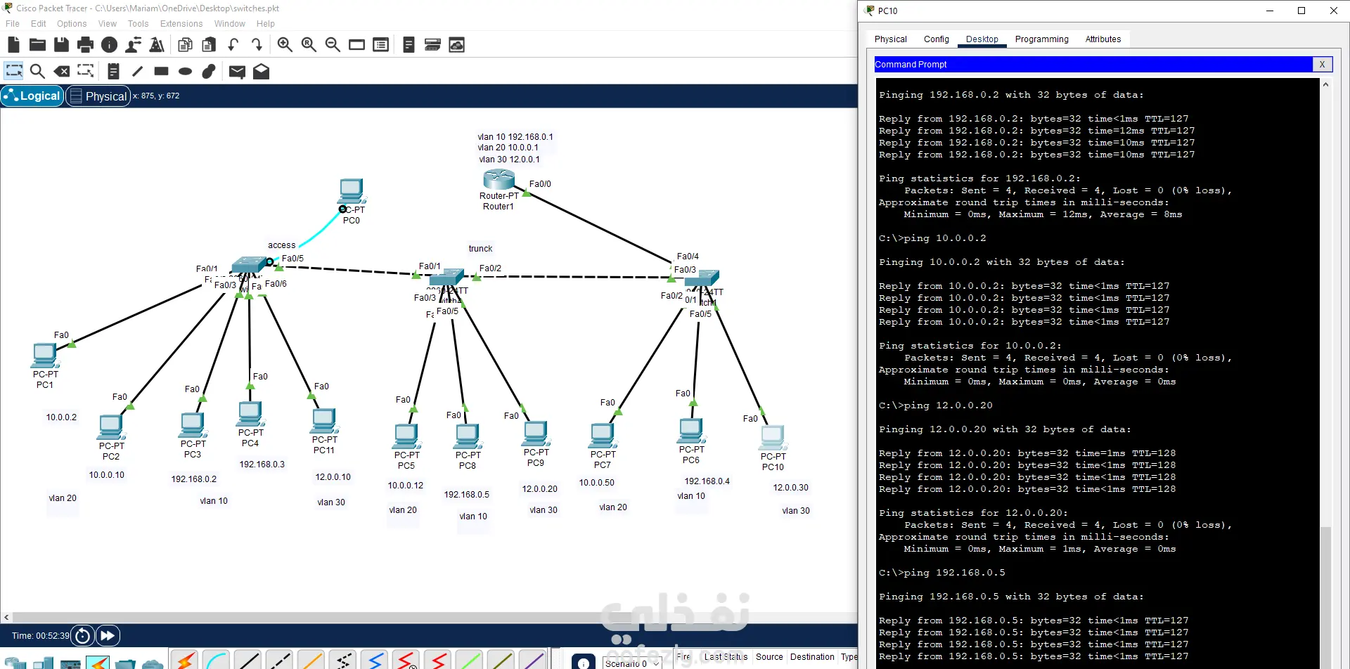 تصميم وتنفيذ شبكة متعددة VLANs باستخدام Cisco Packet Tracer