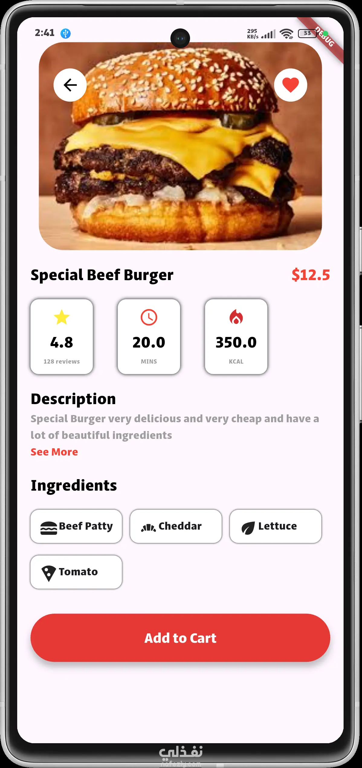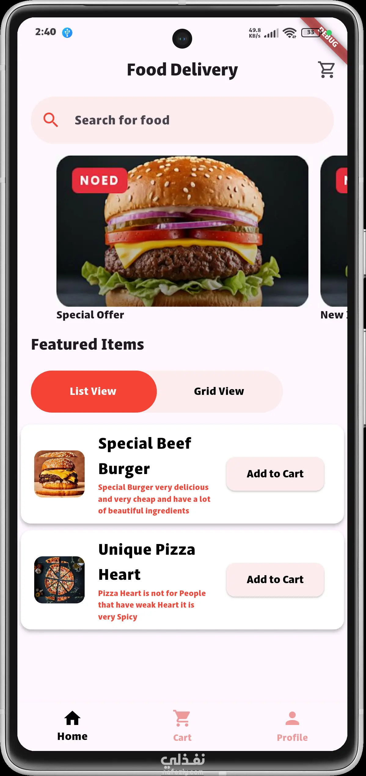 الصفحة الرئيسية (Home): تحتوي على شريط بحث ذكي، وعروض مميزة (Slider)، وقائمة "Featured Items" مع إمكانية التبديل بين عرض القائمة (List View) والشبكة (Grid View). تفاصيل المنتج (Product Details): صفحة مخصصة لكل وجبة تعرض المكونات، السعرات الحرارية، وقت التحضير، والتقييمات، مع زر سريع للإضافة إلى السلة. نظام السلة (Cart Management): واجهة بسيطة لإدارة الطلبات، تعديل الكميات، وحساب الإجمالي والضرائب وتكلفة التوصيل بشكل تلقائي. تجربة المستخدم (UX): تم اختيار ألوان حيوية (الأحمر والأبيض) لفتح الشهية وتحفيز المستخدم على اتخاذ قرار الشراء، مع توزيع متناسق للعناصر لضمان سهولة الاستخدام بيد واحدة. التقنيات المستخدمة: