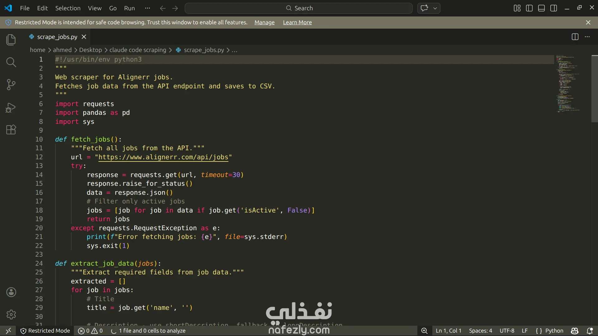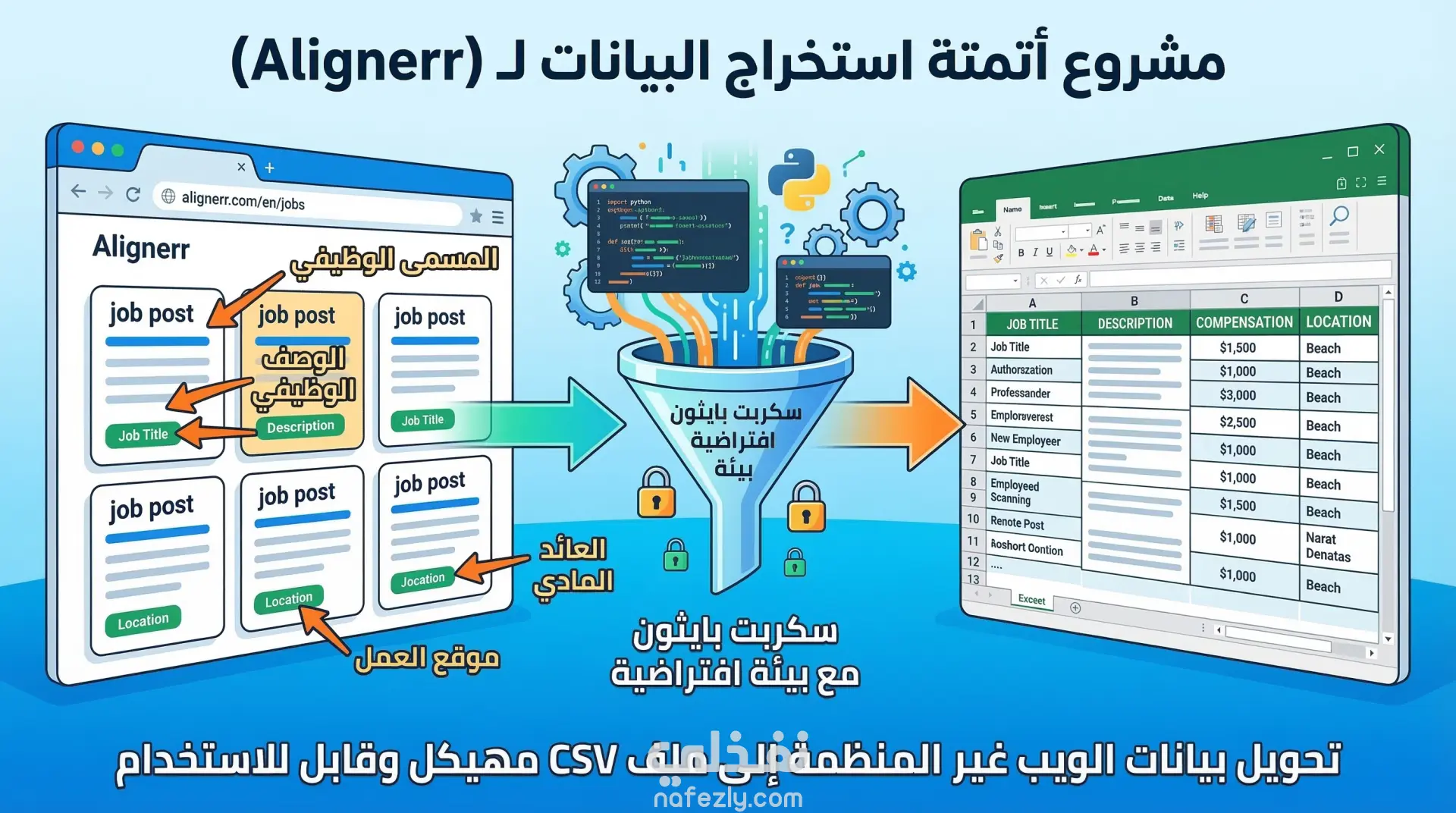 قمت في هذا المشروع بتنفيذ عملية استخراج بيانات (Web Scraping) دقيقة ومهيكلة من موقع التوظيف "Alignerr". الهدف من المشروع هو أتمتة عملية جمع المعلومات الخاصة بالوظائف المتاحة وتحويلها من صفحات ويب غير منظمة إلى قاعدة بيانات مصغرة وجاهزة للاستخدام والتحليل.