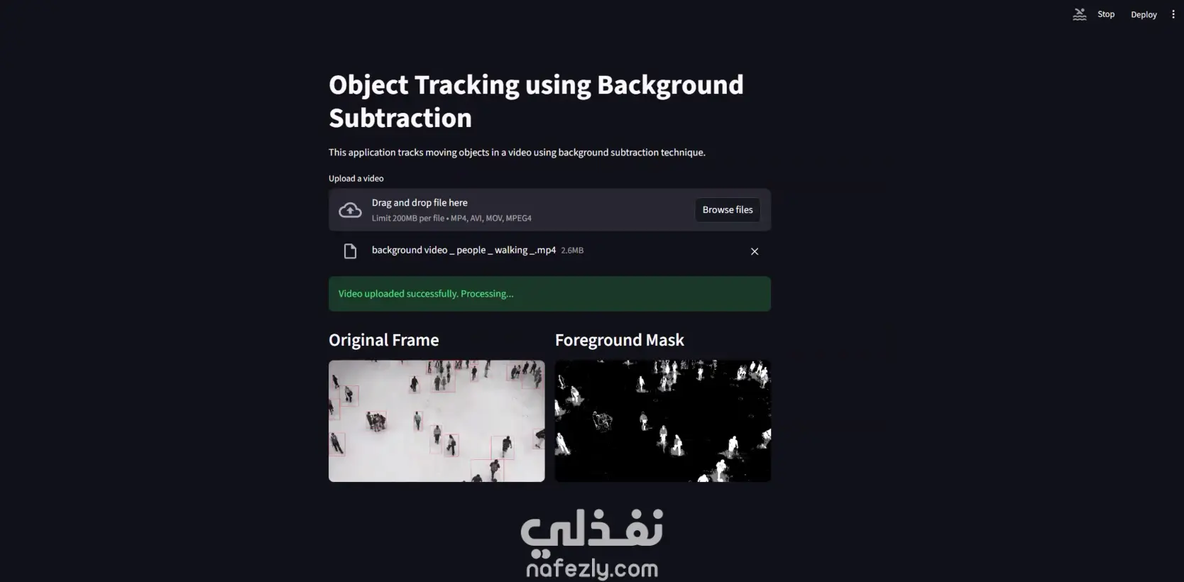 تم تطوير نظام لتتبع الأجسام المتحركة في الفيديو باستخدام تقنية إزالة الخلفية (Background Subtraction) بلغة Python ومكتبة OpenCV. يقوم النظام بمعالجة الفيديو مباشرة (real-time)، وعزل الأجسام المتحركة عن الخلفية الثابتة، وإظهار النتيجة في قناع أبيض وأسود (Foreground Mask) يوضح الأجسام المتحركة بدقة.