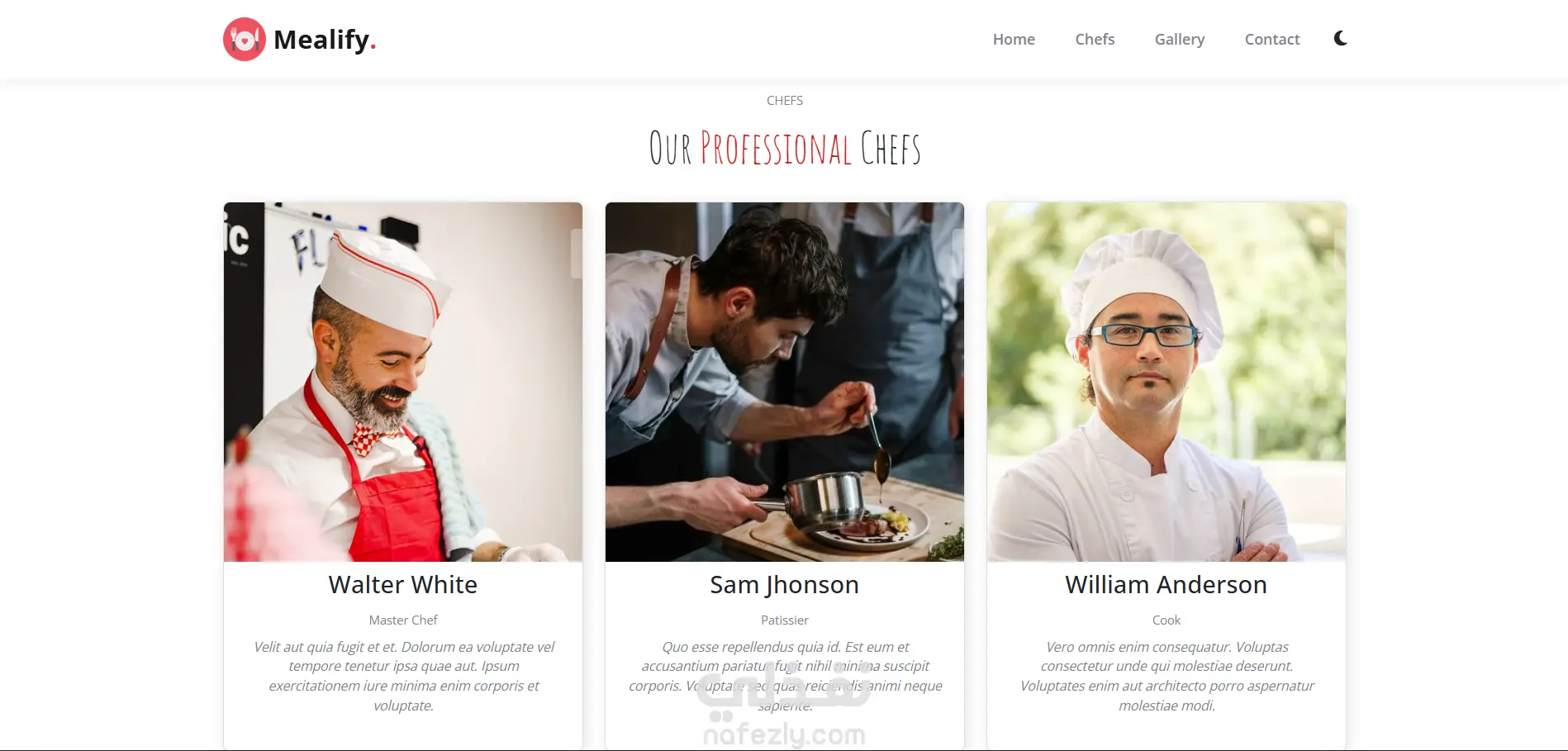Interactive UI Elements: Includes smooth scrolling navigation, hover effects on chef cards and gallery images, and a sticky navigation bar.