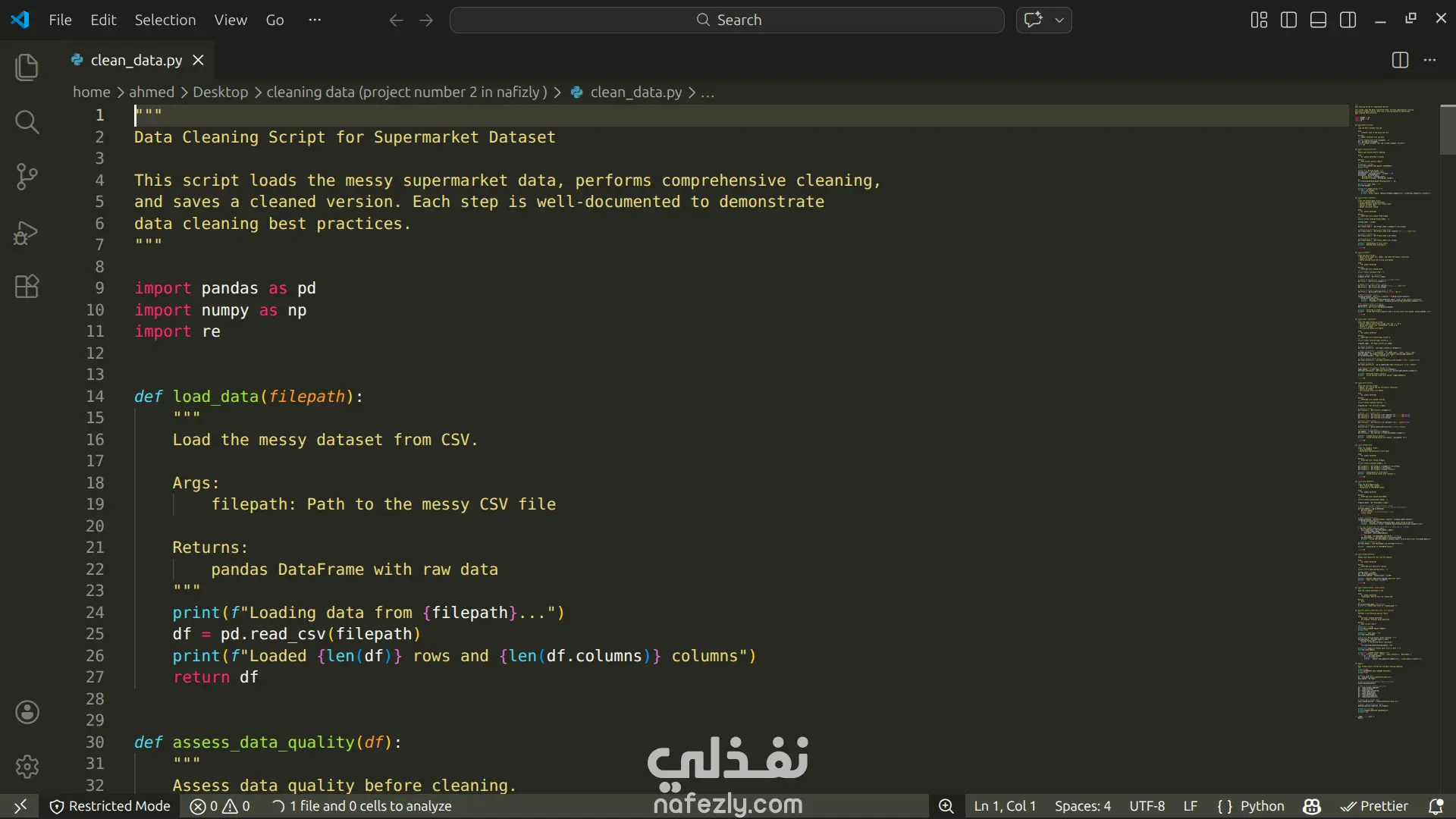 وصف المشروع: قمت في هذا المشروع ببناء خط أنابيب (Pipeline) متكامل لتنظيف ومعالجة البيانات باستخدام لغة Python ومكتبة Pandas. الهدف من المشروع هو التعامل مع بيانات غير منظمة (Messy Data) تحتوي على أخطاء وشوائب شائعة في بيئات العمل الحقيقية، وتحويلها إلى بيانات نظيفة ومهيكلة جاهزة للتحليل (Data Analysis) أو الإدخال في قواعد البيانات. المشاكل التي تمت معالجتها برمجياً في هذا المشروع: القيم المفقودة (Missing Values): الكشف عن الخلايا الفارغة في مختلف الأعمدة ومعالجتها بذكاء (إما بملئها بالمتوسط الحسابي للأرقام، أو بقيم افتراضية للنصوص). تنظيف النصوص (Text Standardization): إزالة المسافات الزائدة، وتوحيد حالة الأحرف (Title Case) لأسماء المنتجات والتصنيفات. تنظيف الأرقام (Numeric Extraction): إزالة الرموز والعملات والنصوص المدمجة مع الأرقام (مثل تحويل "$15.50" أو "12g" إلى أرقام صحيحة قابلة للحساب). توحيد التواريخ (Date Formatting): قراءة التواريخ المكتوبة بصيغ مختلفة وعشوائية وتوحيدها إلى صيغة قاعدة البيانات القياسية (YYYY-MM-DD). إزالة التكرار (Deduplication): فحص البيانات وحذف الصفوف المكررة تماماً لضمان دقة الإحصائيات. النتيجة النهائية: استخراج ملف CSV نظيف 100%، وتوليد تقرير جودة (Quality Report) يوضح حالة البيانات قبل وبعد المعالجة. أنا جاهز لاستلام ملفات البيانات الخاصة بك (مهما كانت فوضوية أو كبيرة الحجم) وتسليمها لك نظيفة، مرتبة، وخالية من الأخطاء في أسرع وقت.