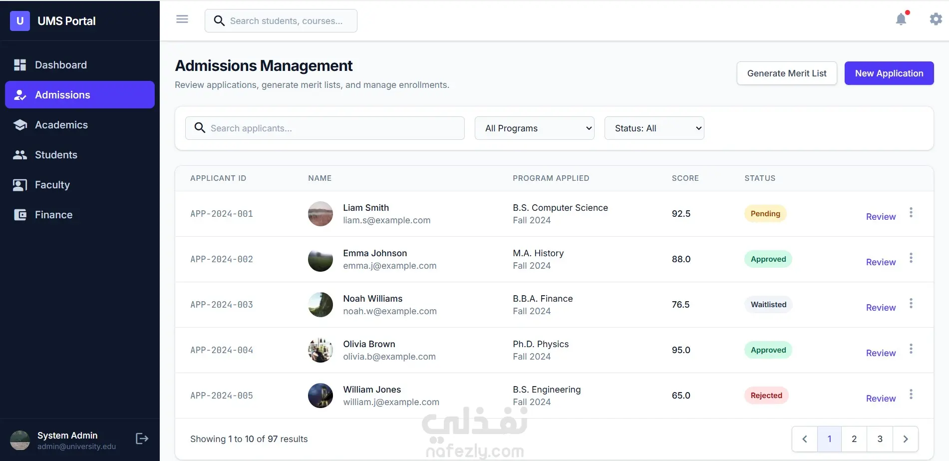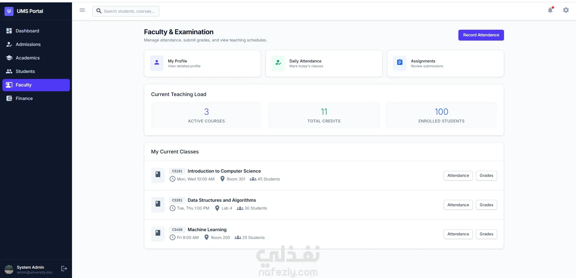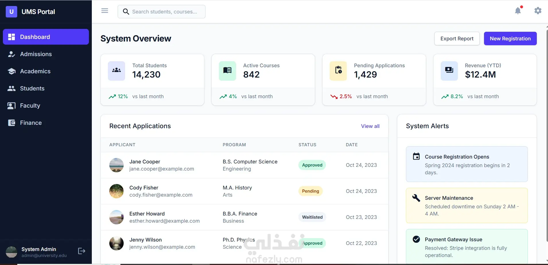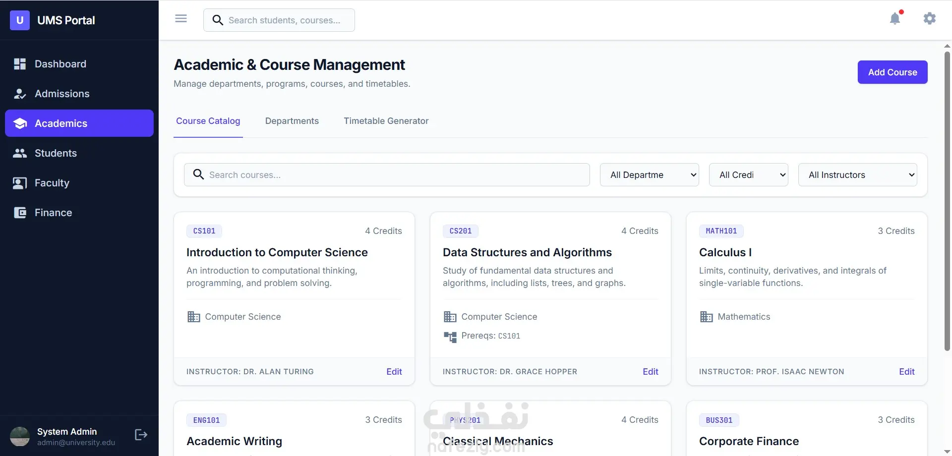 هذا المشروع عبارة عن نظام إدارة جامعي متكامل (University Management System) مصمم لرقمنة وتسهيل العمليات الإدارية والأكاديمية داخل المؤسسات التعليمية. يوفر النظام لوحة تحكم ذكية وشاملة تتيح لمديري النظام، أعضاء هيئة التدريس، والطلاب التفاعل مع البيانات في وقت حقيقي. يغطي النظام دورة حياة الطالب كاملة، بدءاً من تقديم طلبات الالتحاق وتتبعها، مراراً بإدارة المقررات الدراسية والجداول الزمنية، وصولاً إلى إدارة الشؤون المالية ورصد الدرجات والحضور، كل ذلك من خلال واجهة مستخدم (UI) عصرية، منظمة، وسهلة الاستخدام.