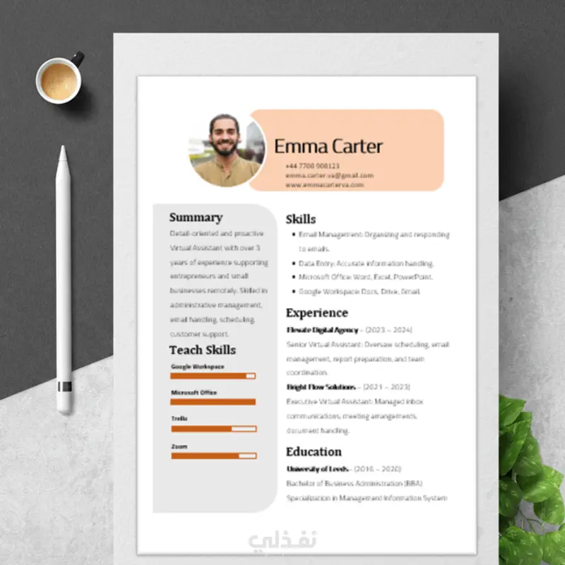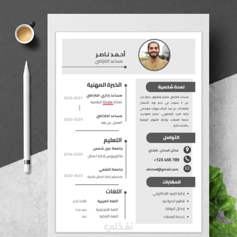 أصمم لك سيرة ذاتية احترافية وجذابة تساعدك على ترك انطباع قوي لدى أصحاب العمل، بأسلوب حديث ومنظم. تصميم متناسق وعصري اختيار ألوان وخطوط مناسبة واحترافية تنسيق محتوى خبراتك ومهاراتك بشكل جذاب إضافة صور أو أيقونات إذا رغبت لتوضيح الخبرات ملفات قابلة للتعديل والتحديث بسهولة مناسب لجميع التخصصات والمجالات الوظيفية تسليم الملف بصيغتي Word + PDF كل التفاصيل التي تقدمها قبل البدء تساعدني على إعداد سيرة ذاتية دقيقة واحترافية تعكس مهاراتك بشكل واضح.