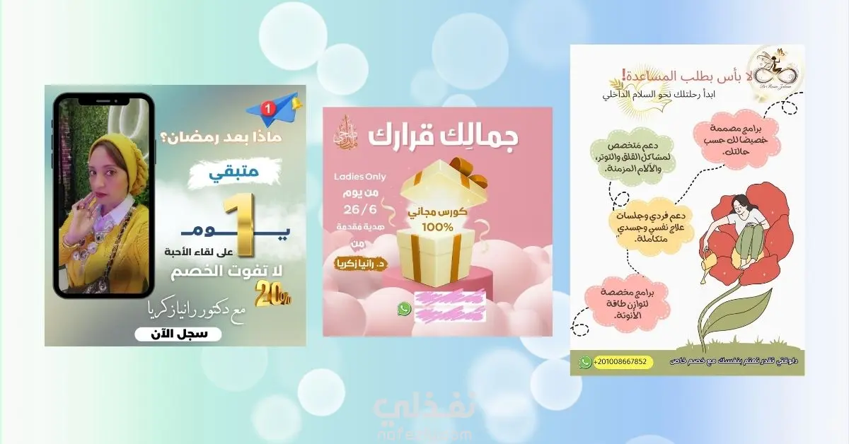 تم تصميم المنشورات لتناسب منصات التواصل الاجتماعي مثل فيسبوك وإنستجرام، مع مراعاة إبراز العناوين والعروض بشكل ملفت، واستخدام عناصر بصرية تدعم المحتوى وتجعله أكثر جاذبية للمستخدمين.