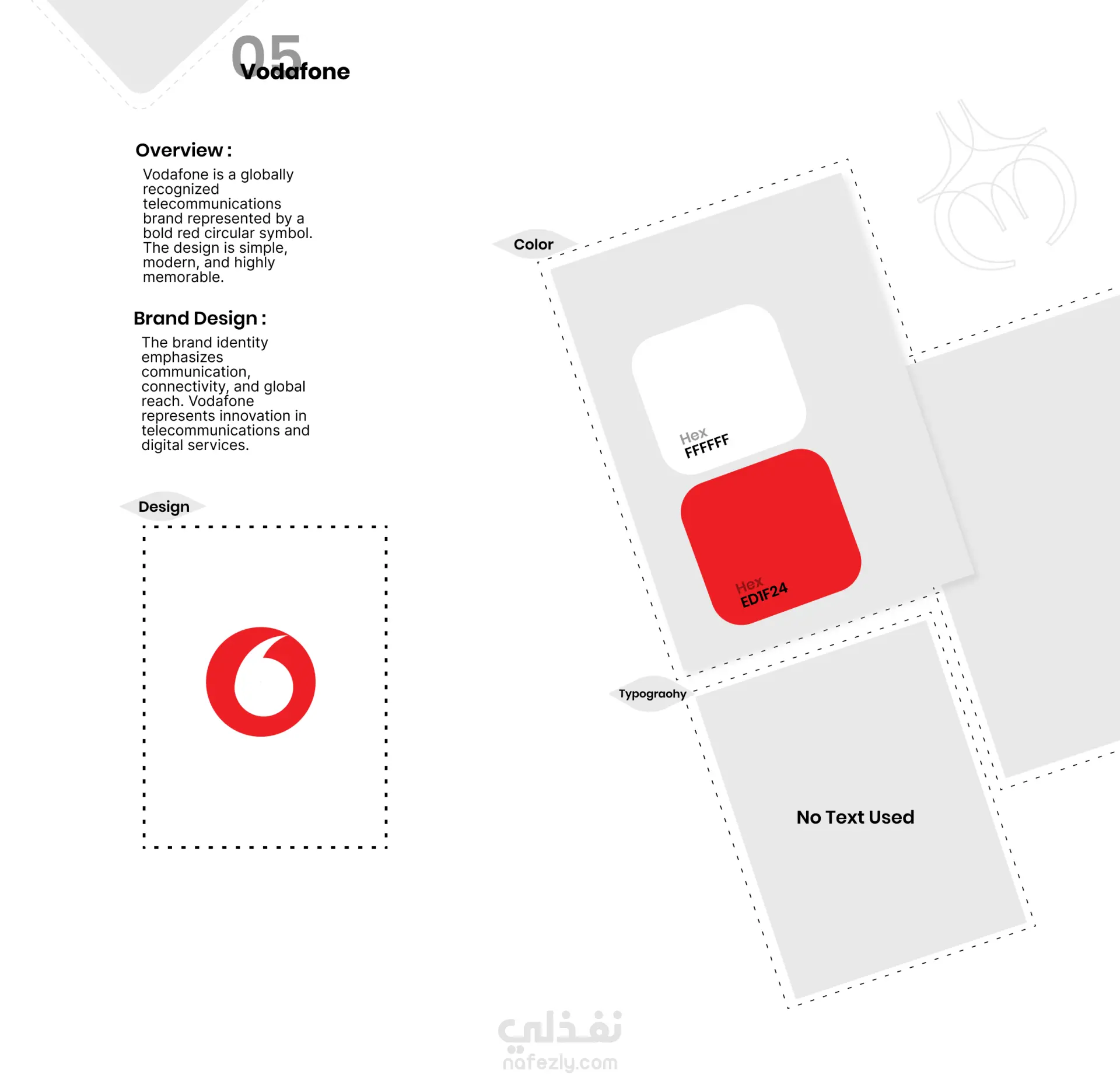 Vodafone Vodafone is a globally recognized telecommunications brand represented by a bold red circular symbol. The design is simple, modern, and highly memorable. Brand Design: The brand identity emphasizes communication, connectivity, and global reach. Vodafone represents innovation in telecommunications and digital services.