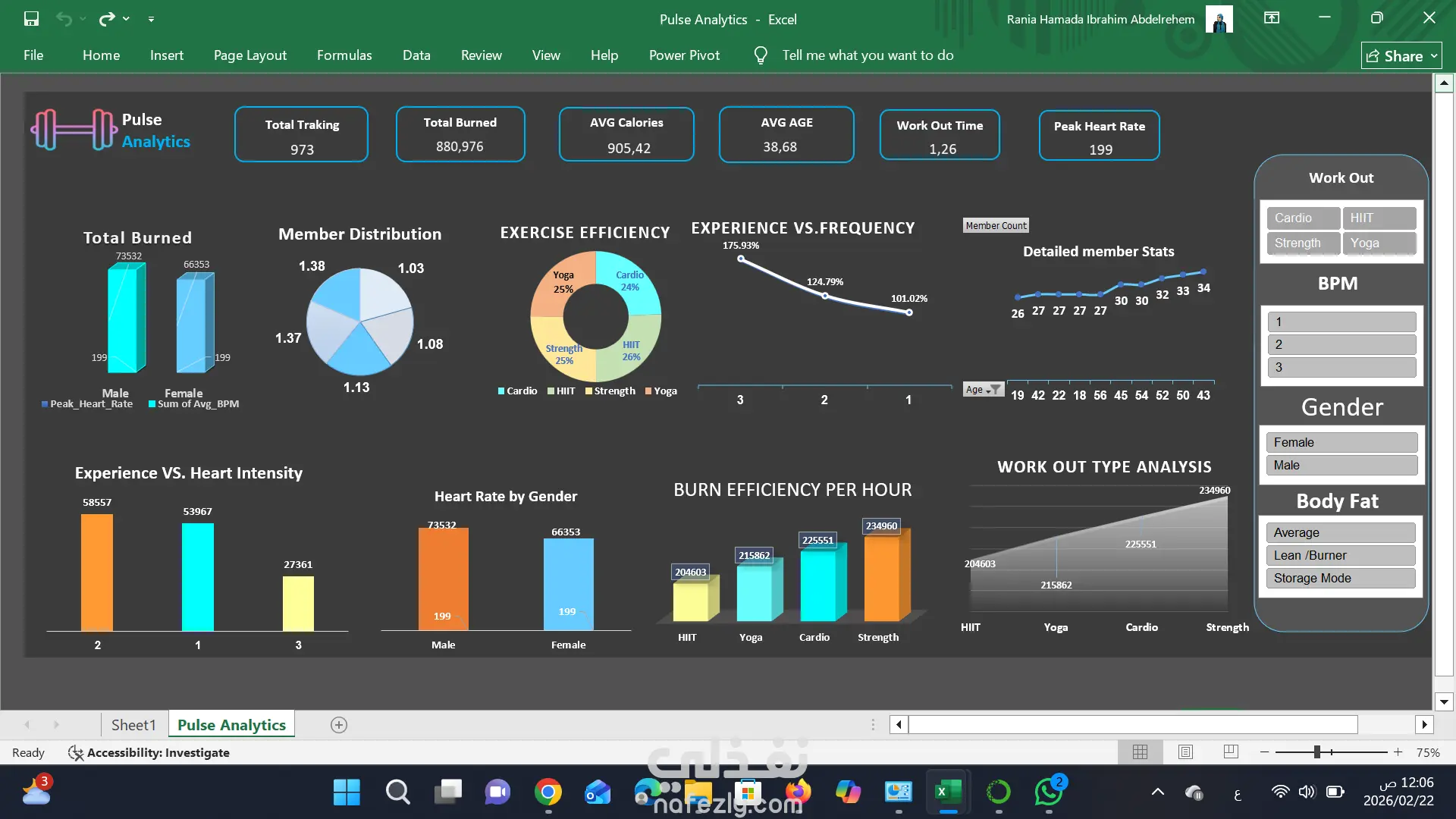 هل تبحث عن تحويل بياناتك الخام إلى تقارير تفاعلية تساعدك في اتخاذ قرارات دقيقة؟ أقدم لك خدمة تصميم لوحات تحكم (Dashboards) احترافية باستخدام Excel، مصممة خصيصاً لتناسب احتياجات مشروعك. في هذا المشروع (Pulse Analytics)، قمت بتحليل بيانات اللياقة البدنية والتمارين الرياضية، حيث تشمل اللوحة: تحليل كفاءة الحرق (Burn Efficiency) لمختلف أنواع التمارين. متابعة المؤشرات الحيوية مثل معدل ضربات القلب (Heart Rate) وتوزيع المشتركين. ربط البيانات بـ Slicers تفاعلية لسهولة الفلترة حسب (الجنس، نوع التمرين، مستوى الدهون). تصميم واجهة مستخدم (UI) مريحة وعصرية بنظام الـ Dark Mode.