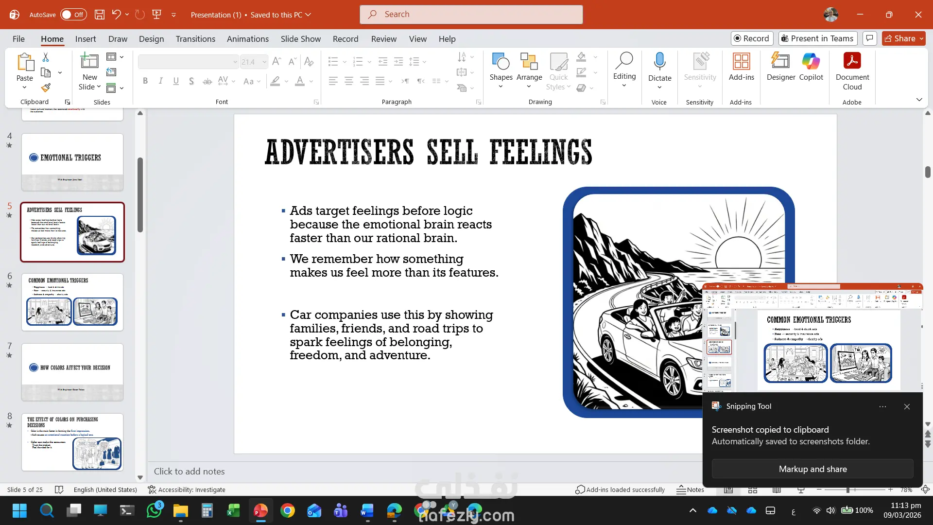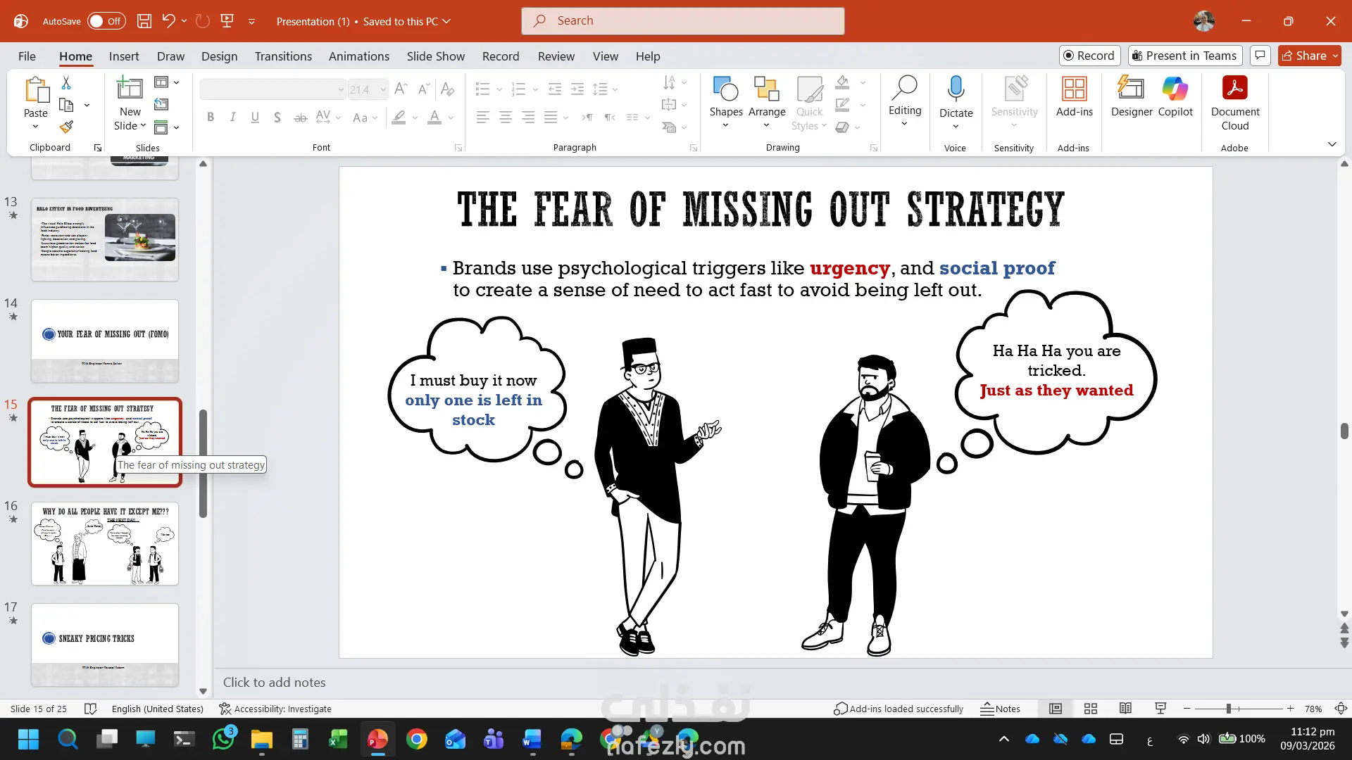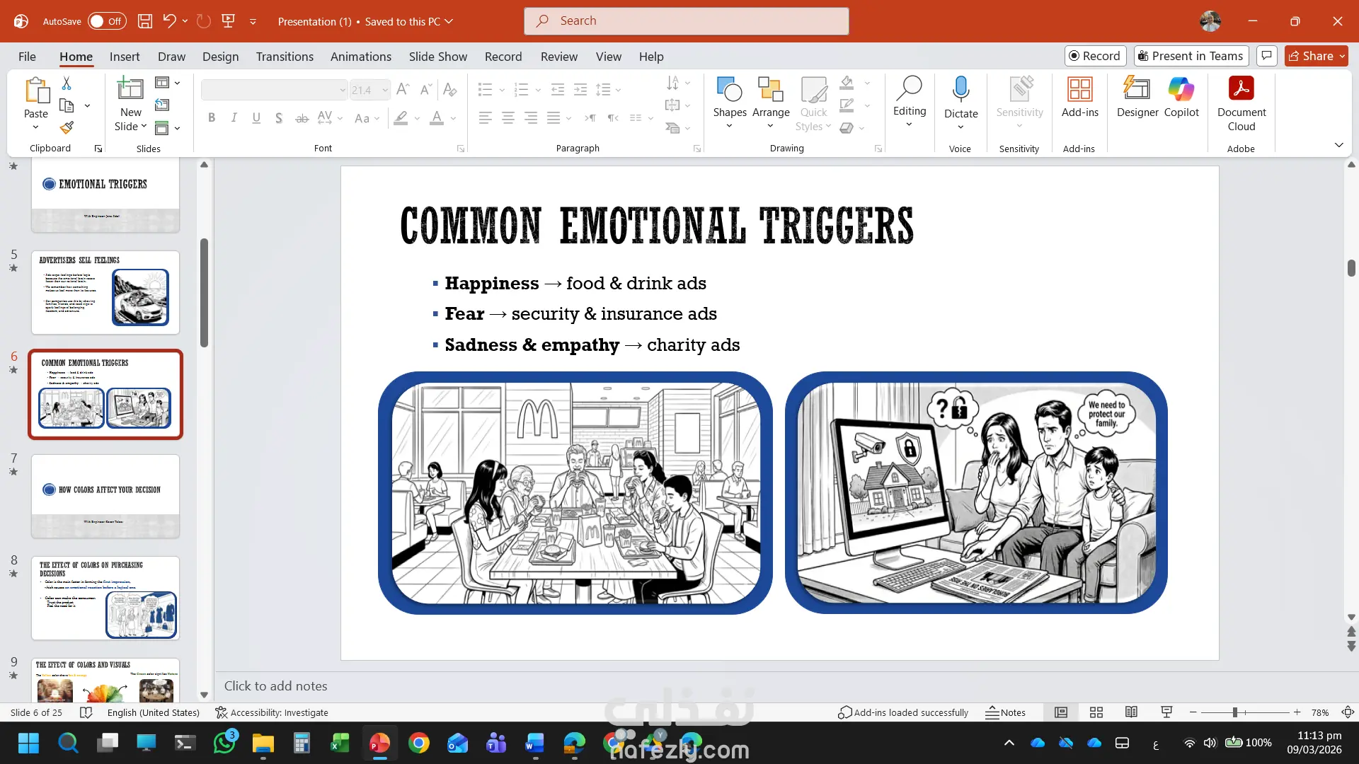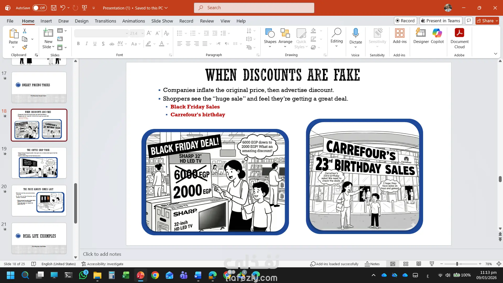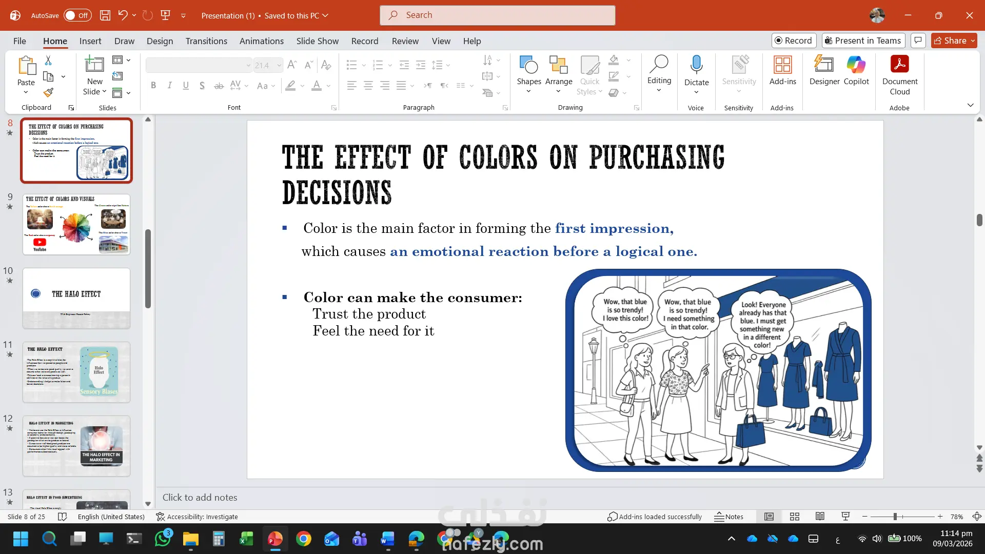 تصميم شرائح عرض احترافية ومنظمة استخدام الألوان والرسوم المناسبة لجعل العرض أكثر وضوحًا ترتيب المعلومات بطريقة سهلة الفهم إضافة أيقونات ورسوم بيانية