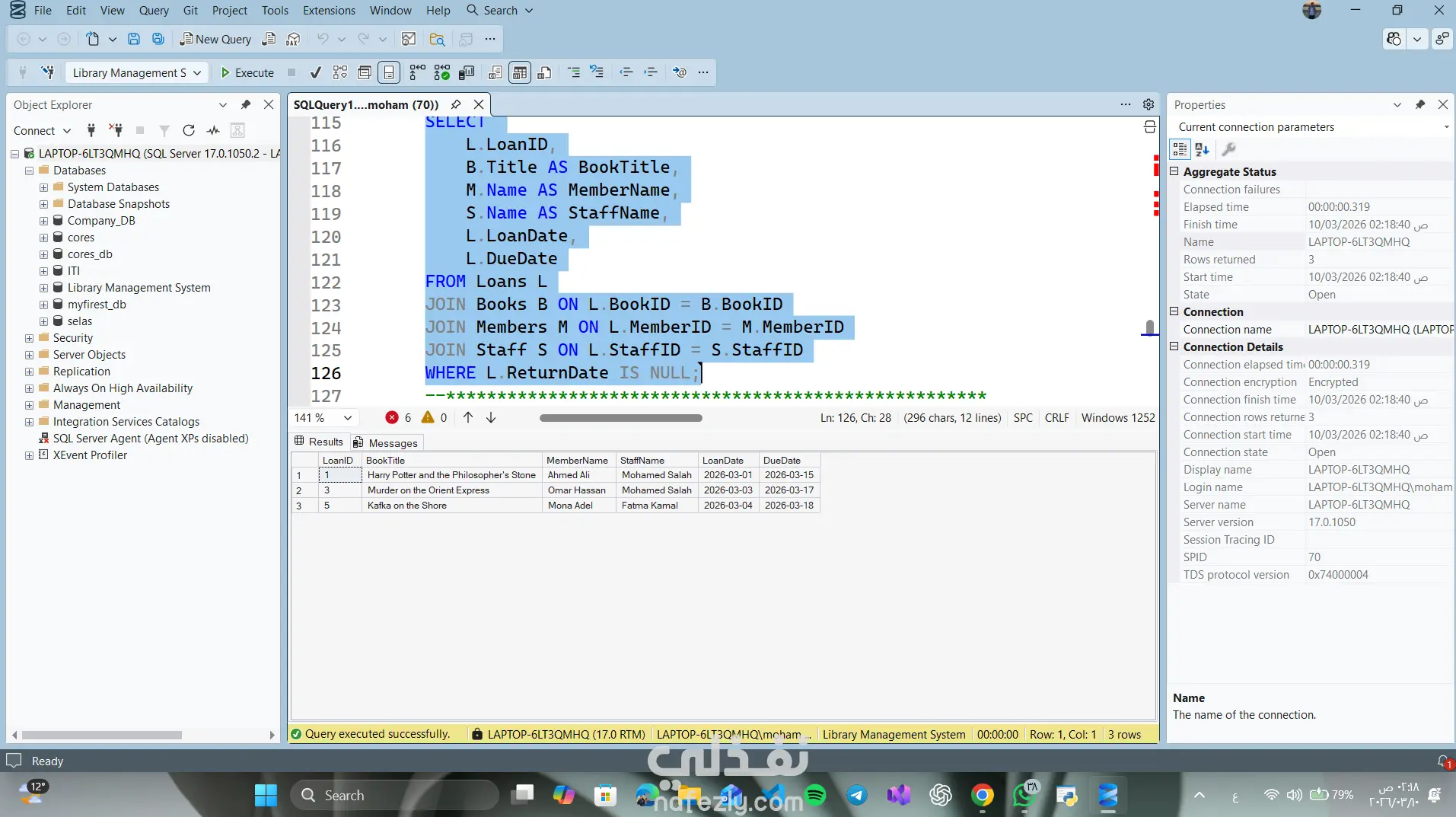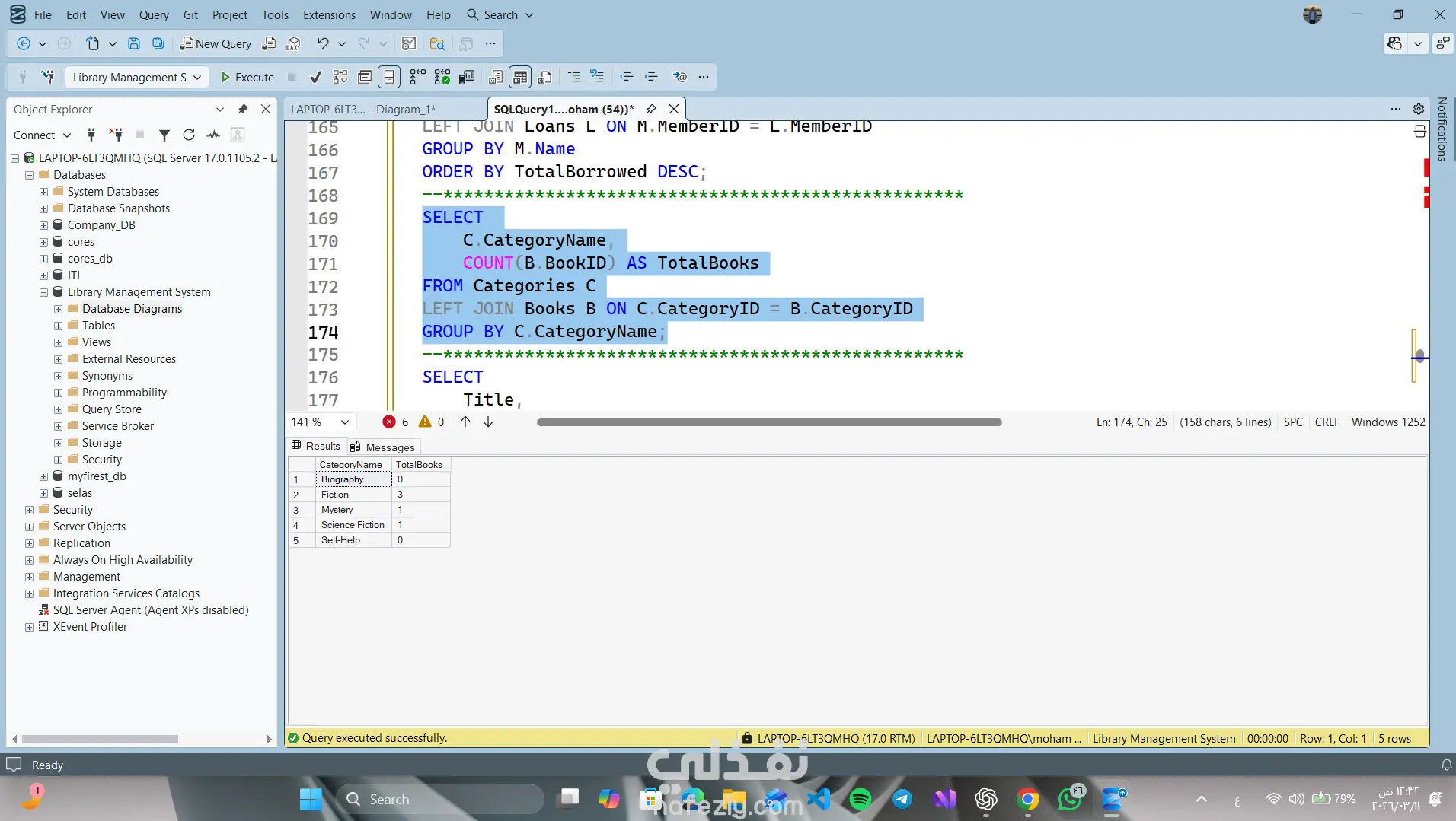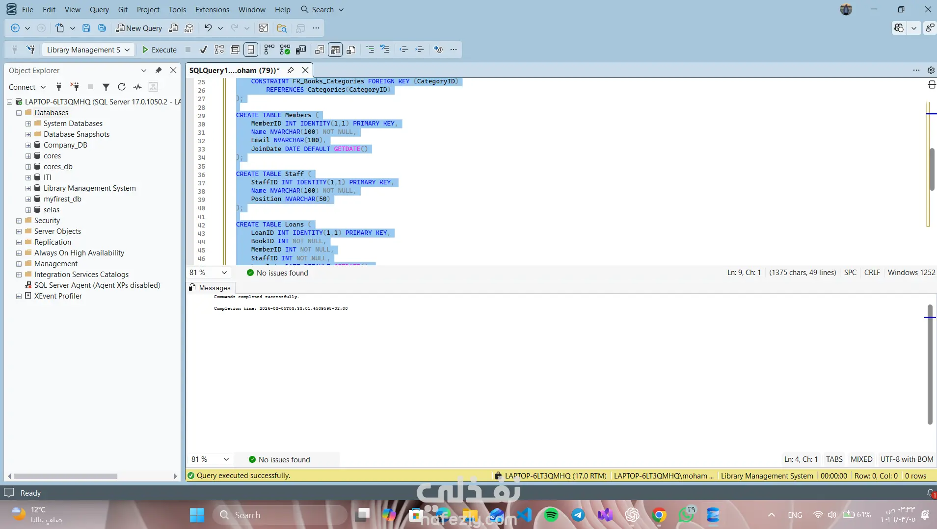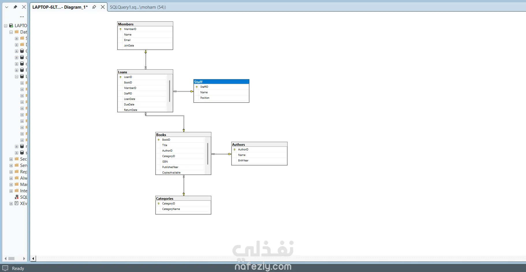 Library Management System – SQL Database Project This project is a relational database designed to manage a library system using SQL Server. The system manages: Books Authors Categories Library Members Staff Book Loans Features • Track books and their authors • Organize books by categories • Manage library members • Record borrowing and returning books • Track overdue books • Analyze staff activity and member borrowing history Database Tables Authors Categories Books Members Staff Loans Technologies SQL Server T-SQL Relational Database Design Joins and Aggregation Queries