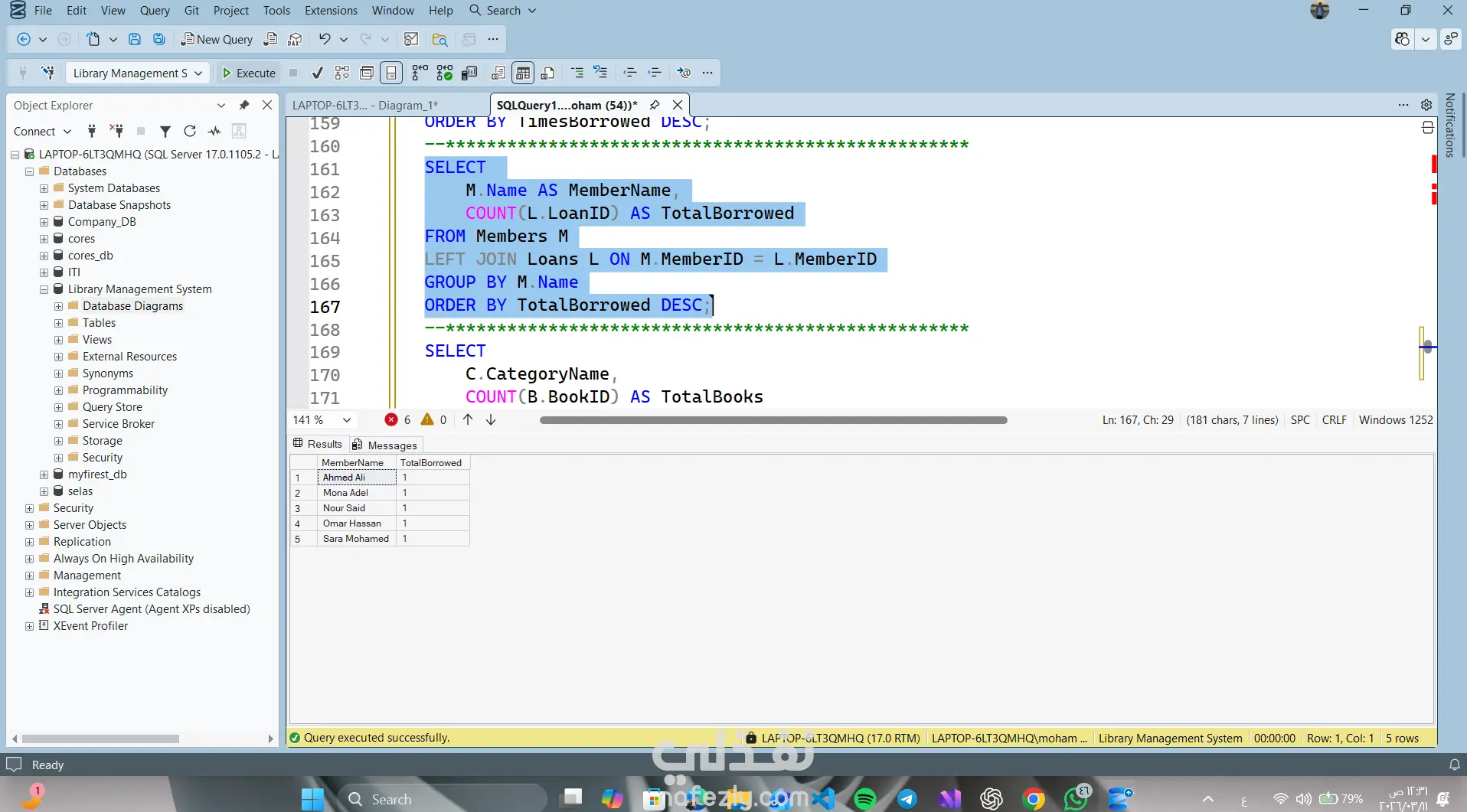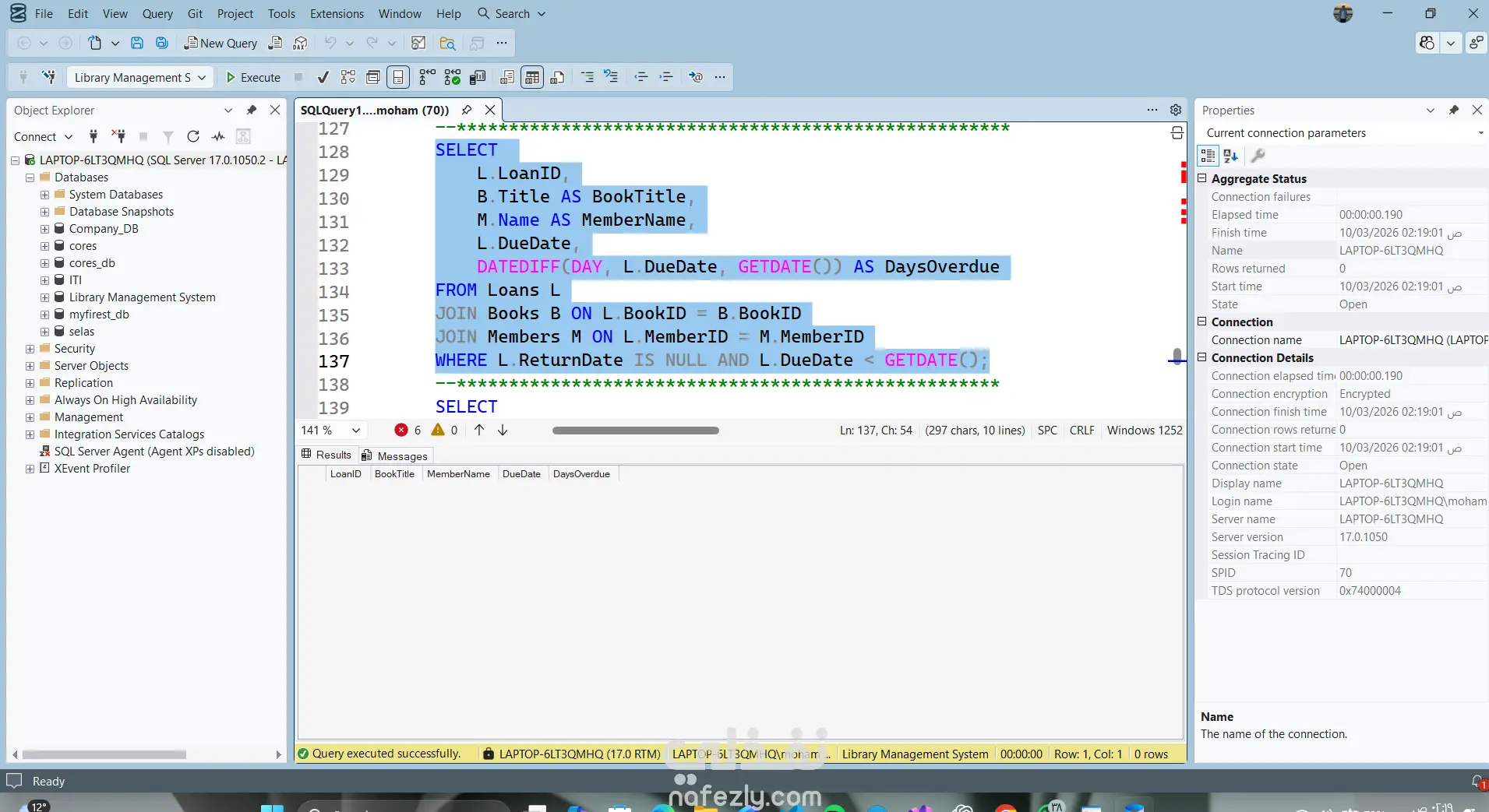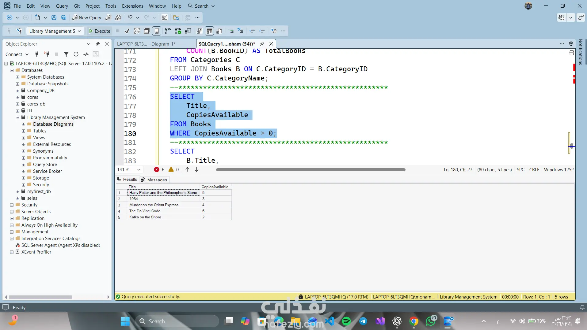Library Management System – SQL Database Project This project is a relational database designed to manage a library system using SQL Server. The system manages: Books Authors Categories Library Members Staff Book Loans Features • Track books and their authors • Organize books by categories • Manage library members • Record borrowing and returning books • Track overdue books • Analyze staff activity and member borrowing history Database Tables Authors Categories Books Members Staff Loans Technologies SQL Server T-SQL Relational Database Design Joins and Aggregation Queries