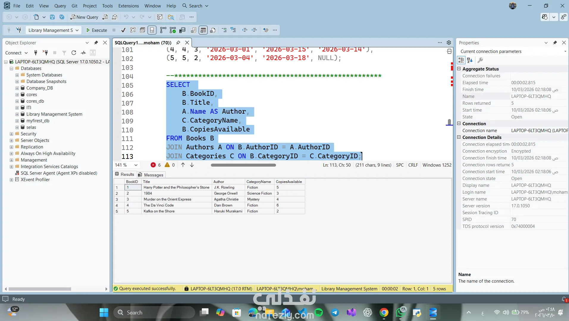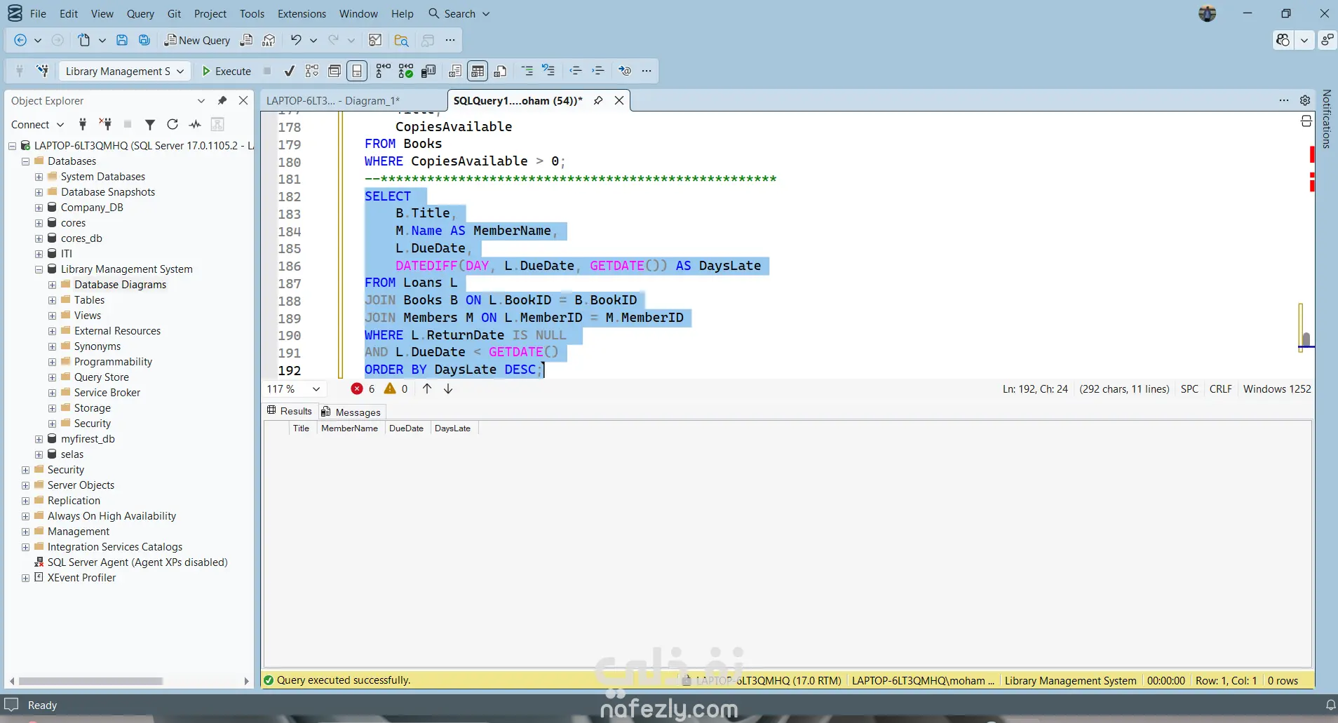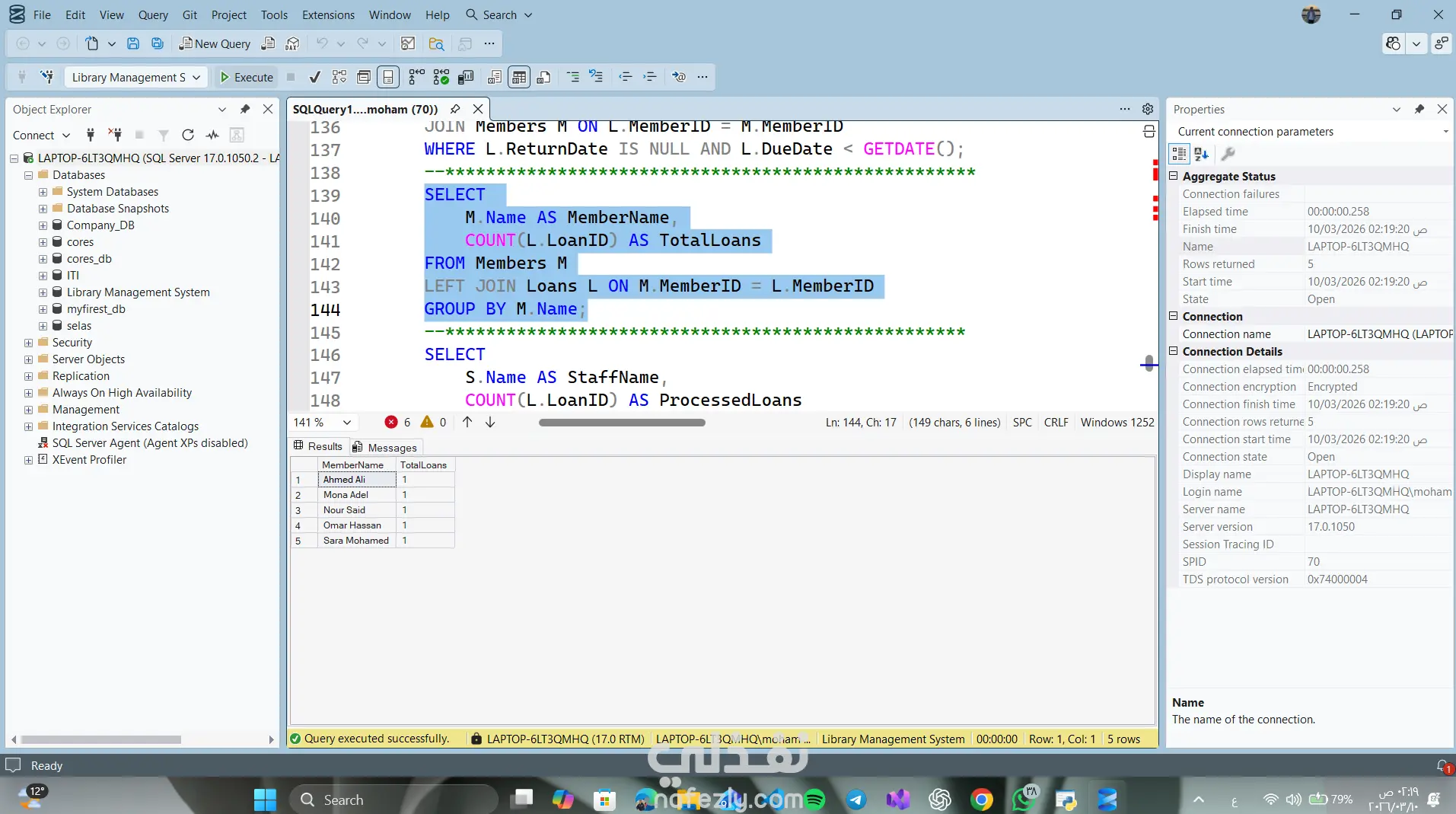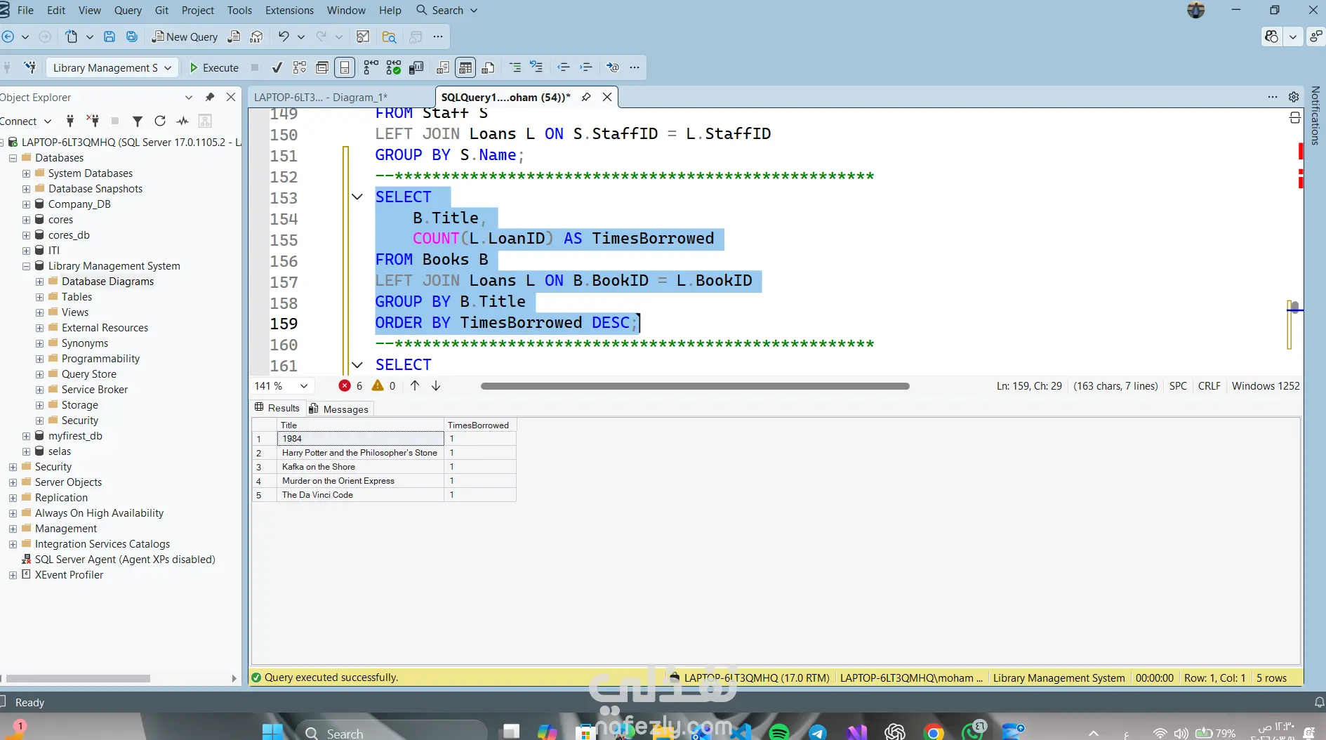 Library Management System – SQL Database Project This project is a relational database designed to manage a library system using SQL Server. The system manages: Books Authors Categories Library Members Staff Book Loans Features • Track books and their authors • Organize books by categories • Manage library members • Record borrowing and returning books • Track overdue books • Analyze staff activity and member borrowing history Database Tables Authors Categories Books Members Staff Loans Technologies SQL Server T-SQL Relational Database Design Joins and Aggregation Queries