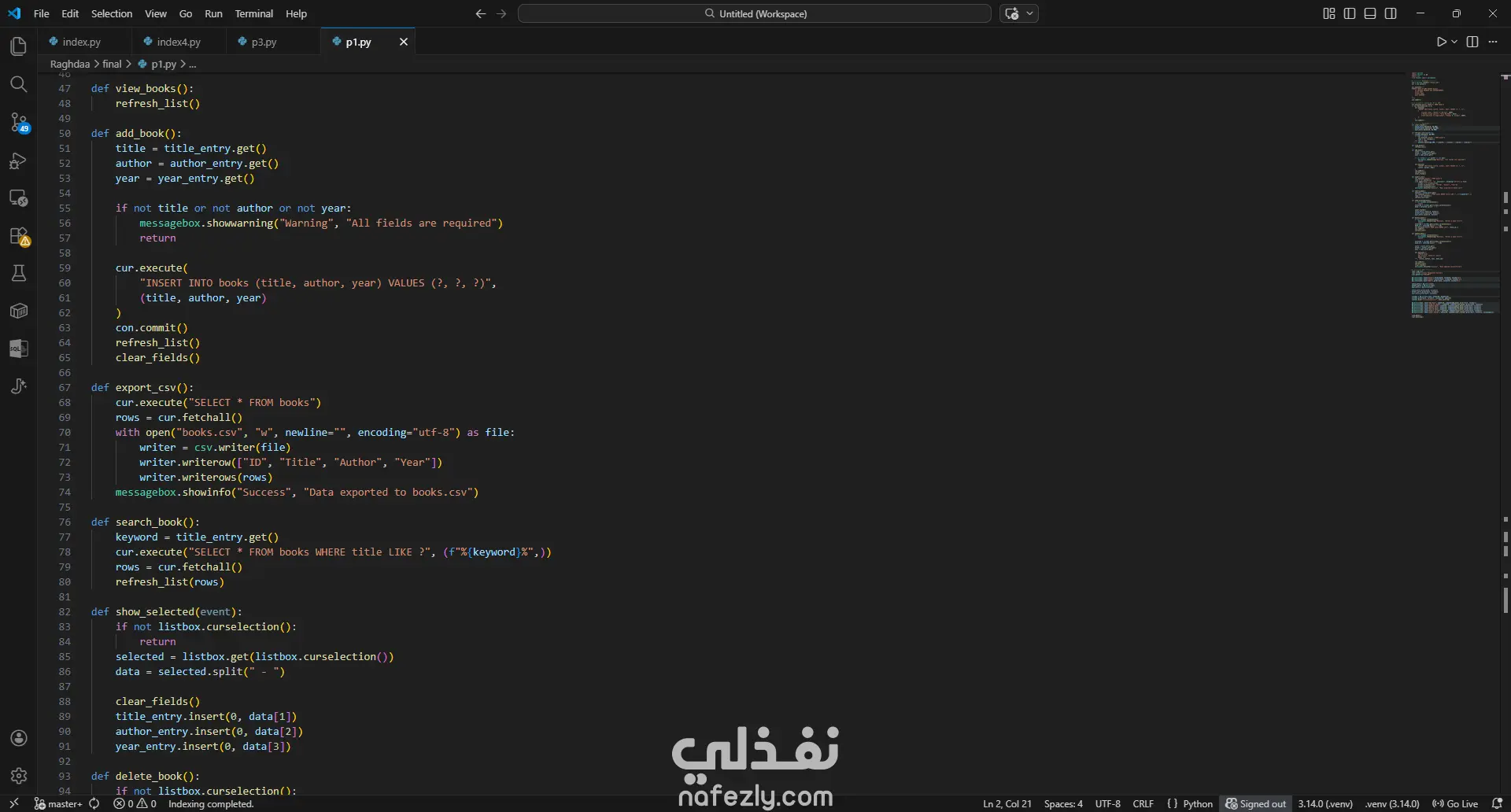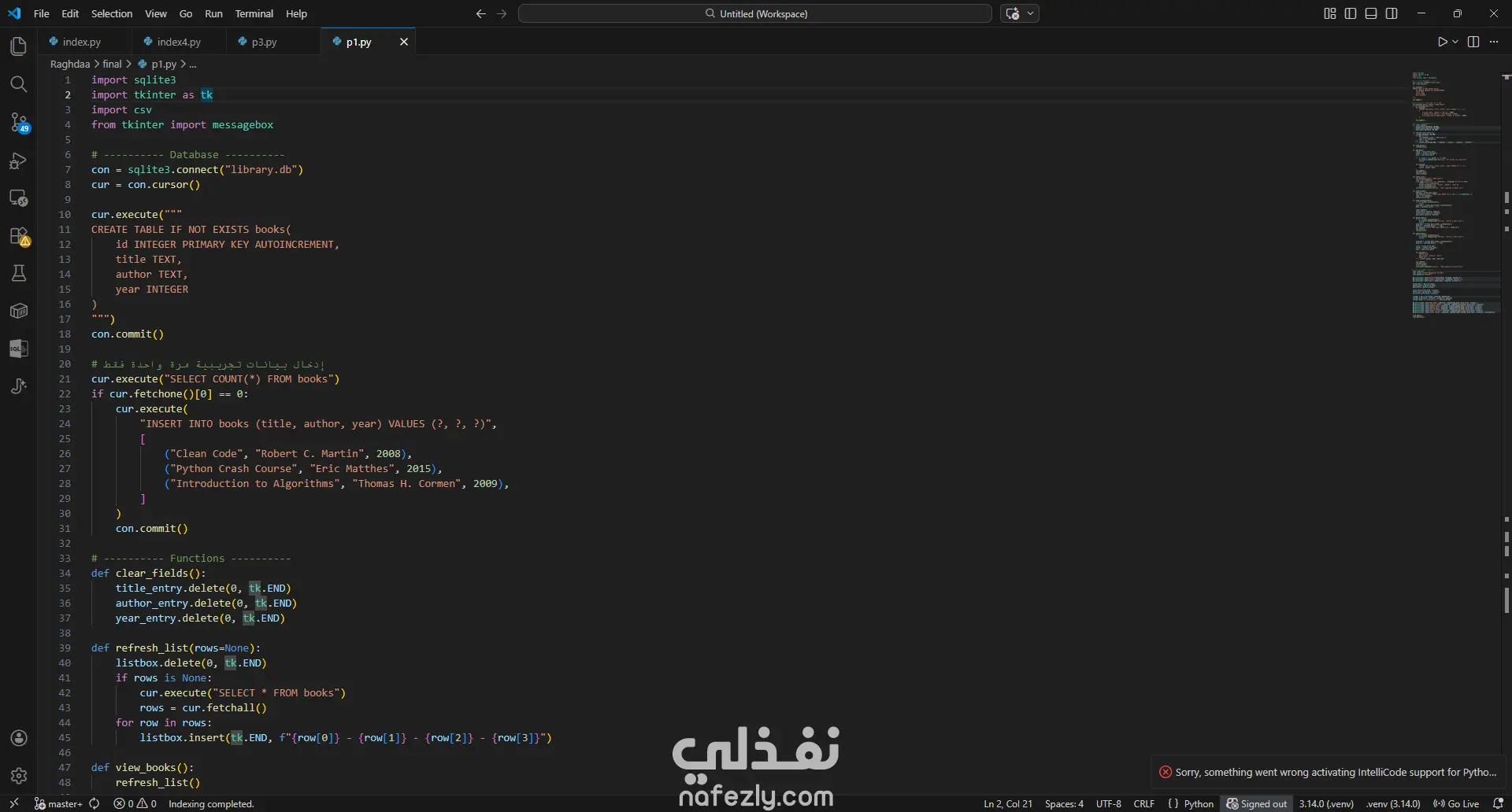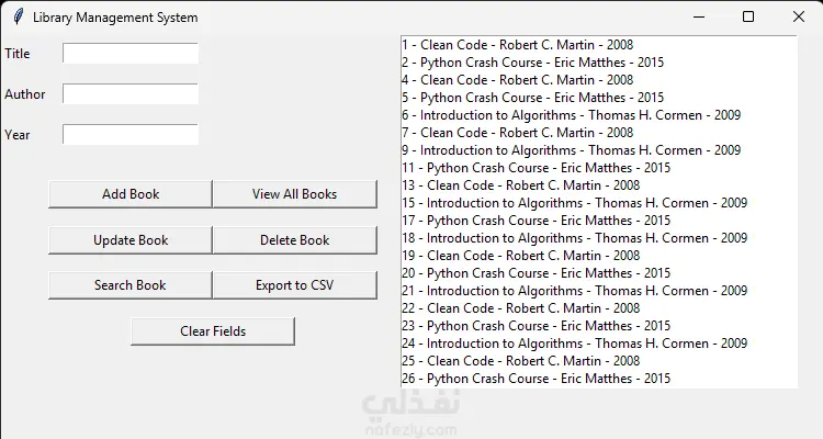 برنامج لإدارة مكتبة بسيطة بواجهة رسومية باستخدام مكتبة Tkinter، ويستخدم قاعدة بيانات SQLite لحفظ الكتب، مع إمكانية إضافة الكتب – عرضها – تعديلها – حذفها – البحث عنها – وتصديرها إلى ملف CSV
