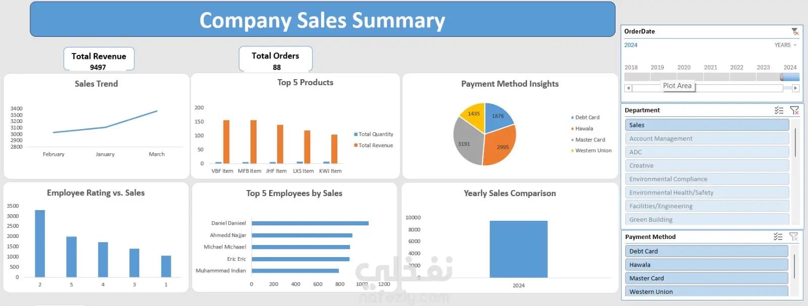 An interactive 2024 Sales Dashboard designed to track revenue, employee performance, and payment trends through professional data visualization
