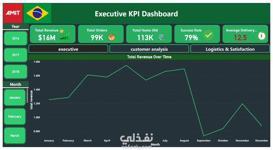 الهدف من المشروع: تحليل أكثر من 100 ألف طلب في الفترة بين 2016 و2018 لتحسين العمليات اللوجستية، وفهم سلوك العملاء، وتطبيق استراتيجية تقسيم العملاء (RFM) لتحسين الاستهداف التسويقي.