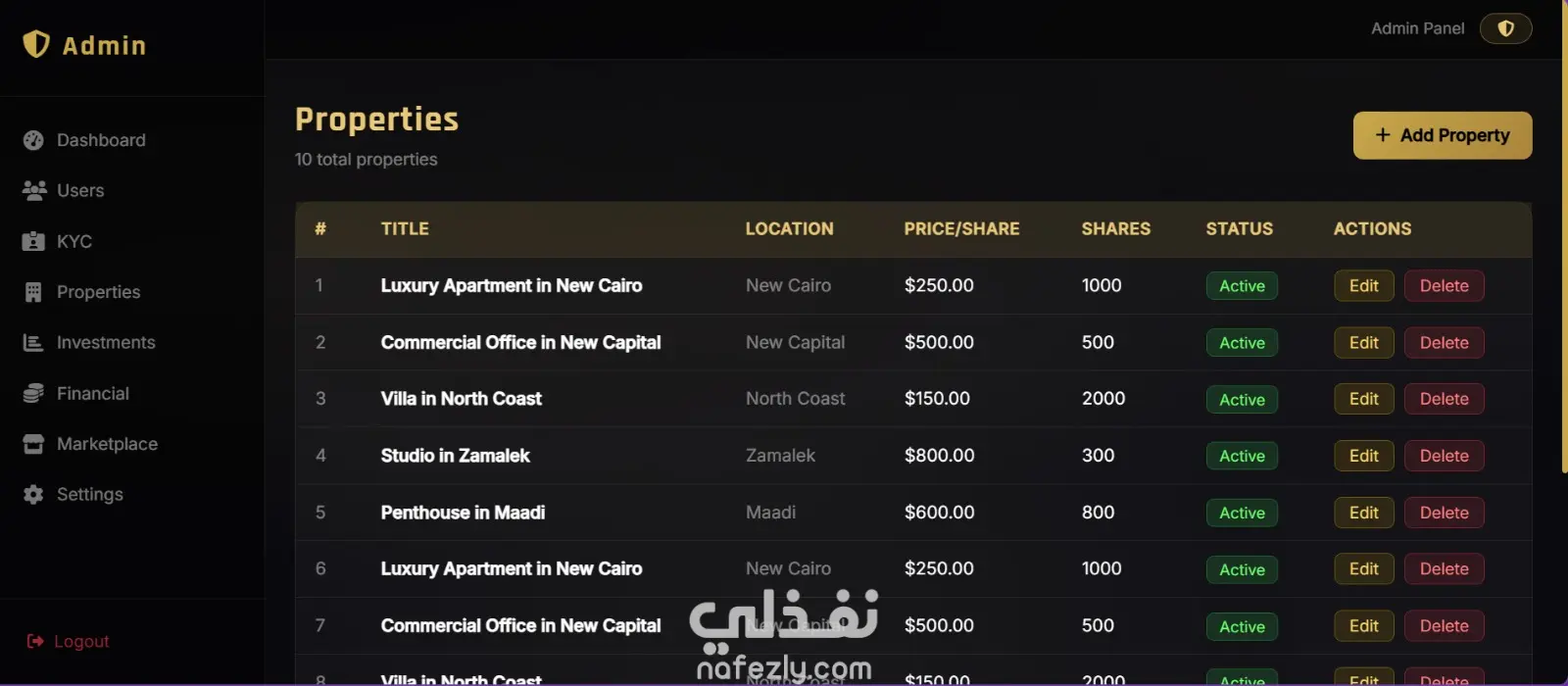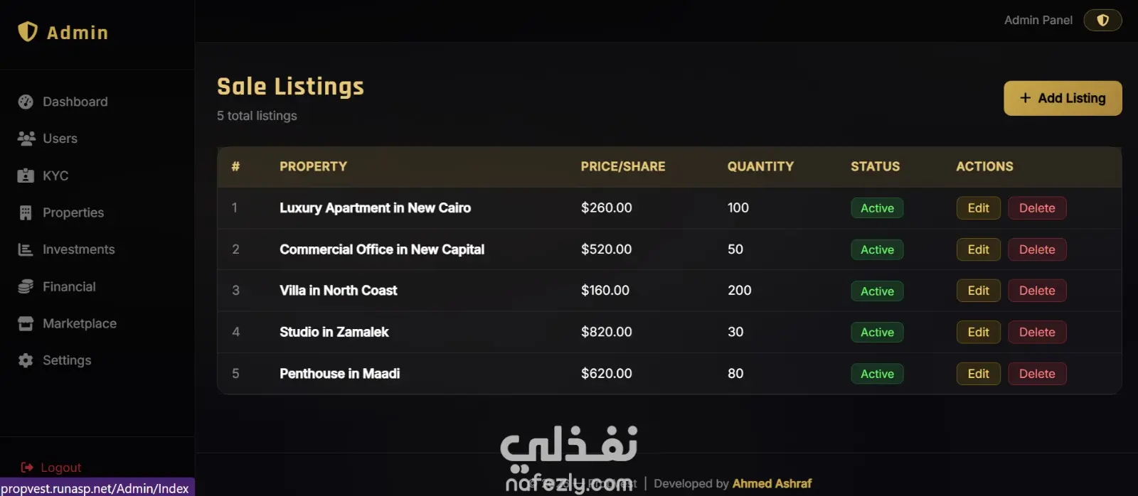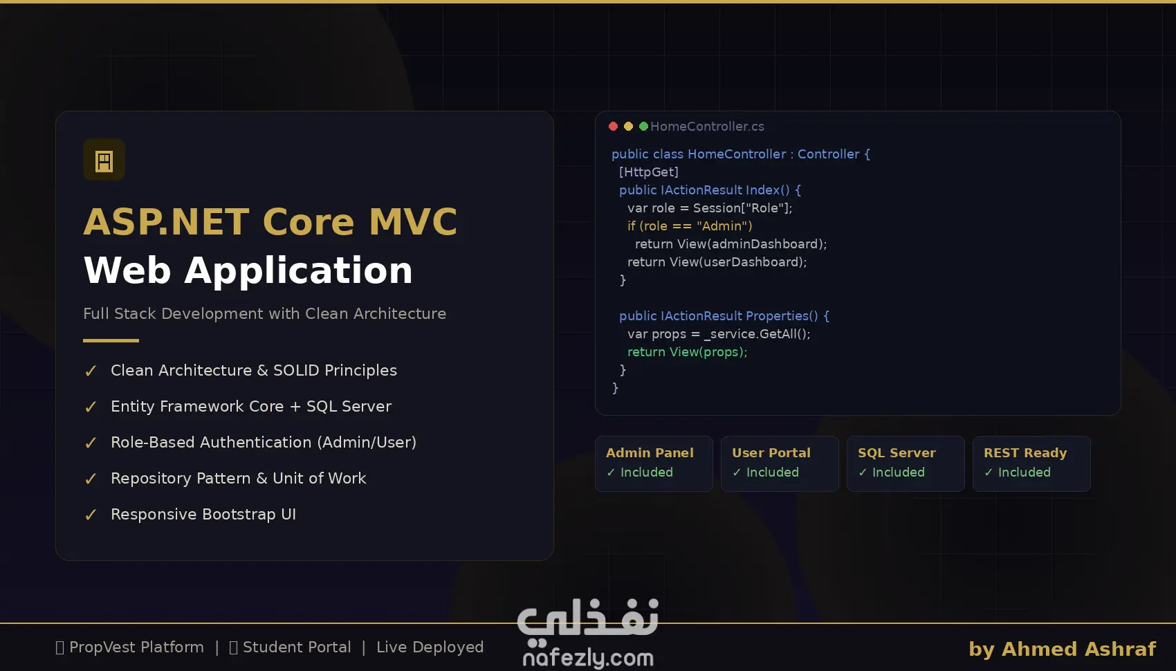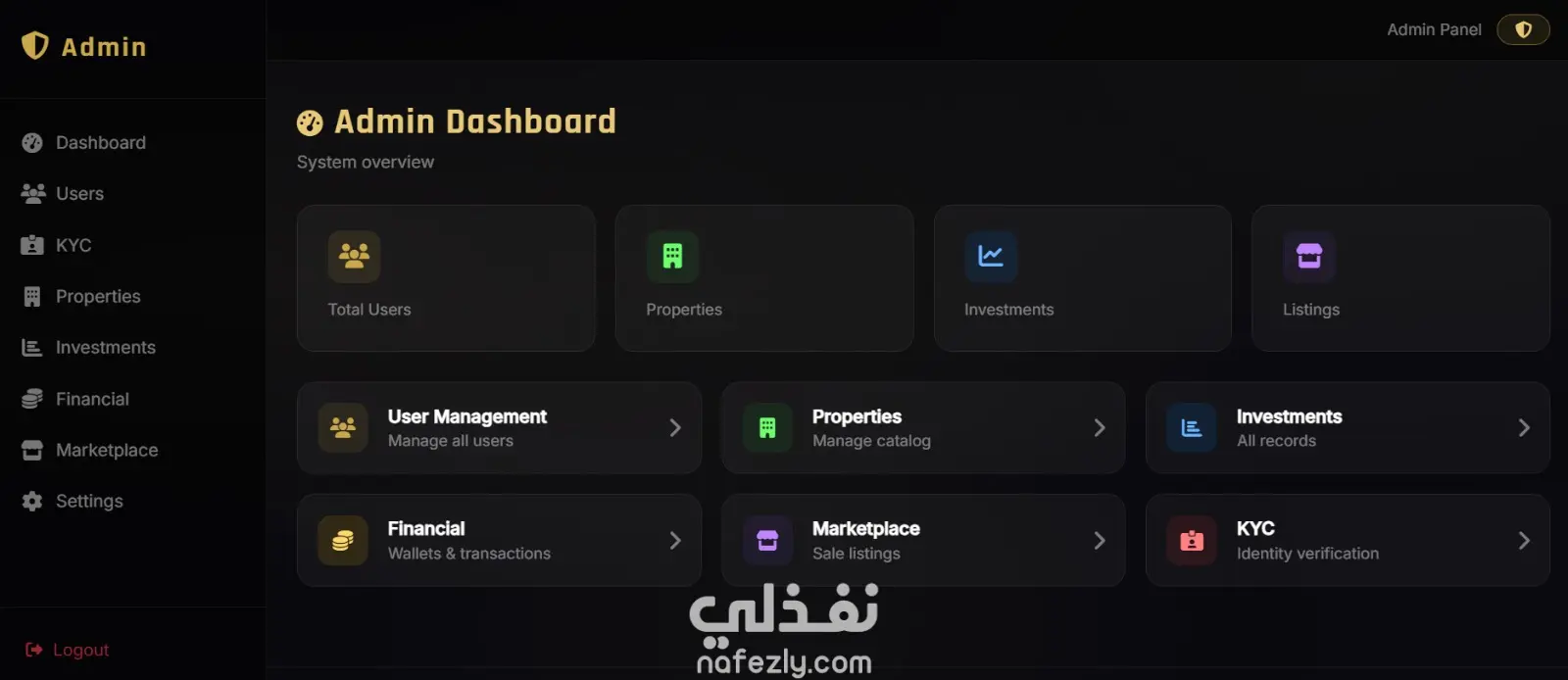 منصة استثمار عقاري متكاملة تتيح للمستخدمين تصفح العقارات والاستثمار في الأسهم وإدارة المحفظة والمحفظة المالية. تشمل لوحة تحكم للأدمن لإدارة المستخدمين والعقارات والاستثمارات وقوائم البيع. مبنية بـ ASP.NET Core MVC و Clean Architecture و Identity Framework مع تصميم عصري داكن.
