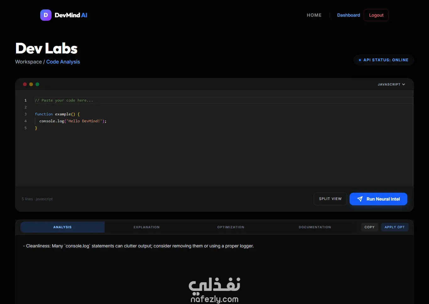 نصة DevMind AI مصممة لتمنح المطورين والشركات أفضل تجربة في تحليل الأكواد وإدارة المشاريع البرمجية. باستخدام أحدث تقنيات الذكاء الاصطناعي، توفر المنصة أدوات دقيقة لاكتشاف الأخطاء، اقتراح تحسينات للأداء، وتسهيل كتابة أكواد نظيفة واحترافية. مع واجهة سهلة الاستخدام وسرعة تنفيذ عالية، يتيح لك DevMind AI التركيز على الإبداع وتطوير مشاريعك بثقة وكفاءة، مع تجربة مستخدم سلسة ونتائج ملموسة.