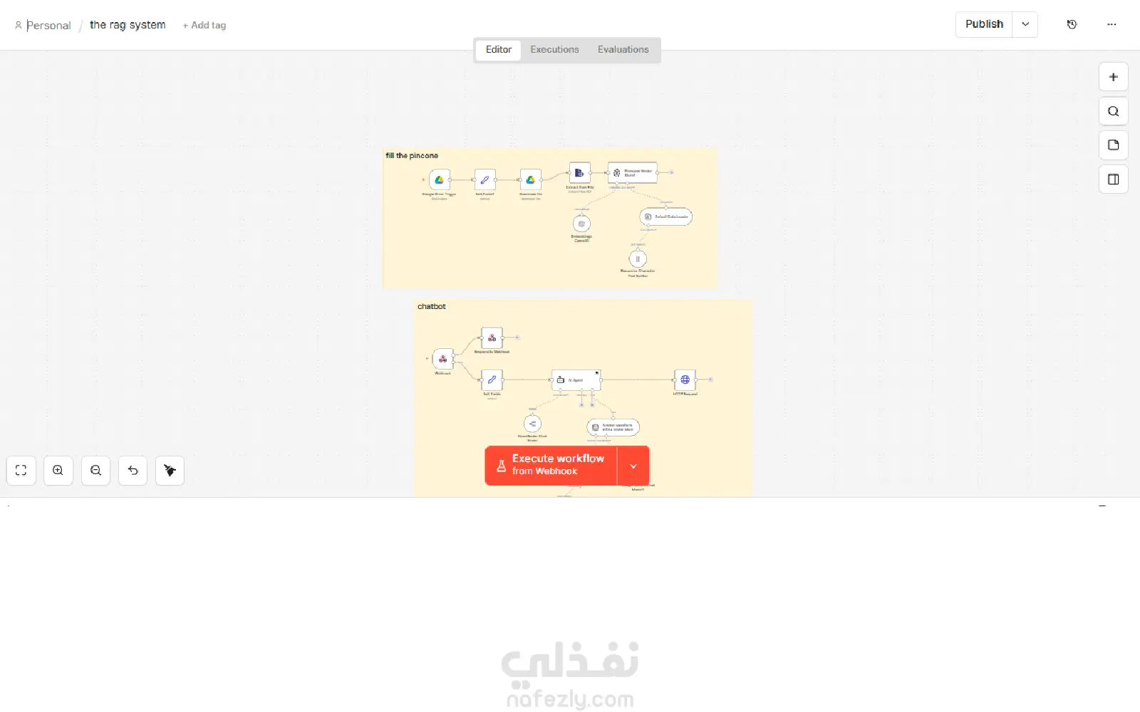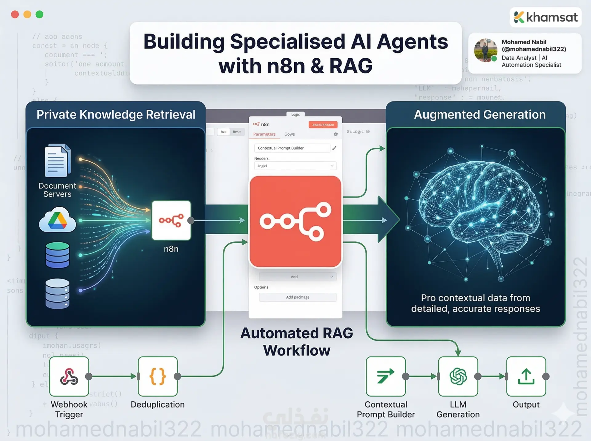 بنيت نظام متكامل بيخلي الذكاء الاصطناعي "يفهم" ملفاتك الخاصة وبيانات البيزنس بتاعك عشان يرد على الأسئلة بدقة ومن غير "تأليف". النظام ده مش مجرد شات بوت عادي، ده مساعد بيقرأ اللي "بين السطور" في ملفاتك. مميزات النظام: ربط آلي: بيسحب الملفات والـ PDFs من Google Drive ويحدث نفسه تلقائياً. دقة عالية: بيعتمد على تقنية RAG عشان يضمن إن الإجابات تكون من قلب ملفاتك بس. ذاكرة قوية: بيستخدم قاعدة بيانات Pinecone عشان يوصل للمعلومات في ثوانٍ. أتمتة كاملة: المشروع مبني بالكامل على n8n، مما يعني إنه سهل يتربط بأي منصة تانية. النظام ده مثالي لأي شركة عندها ملفات كتير ومحتاجة مساعد ذكي يجاوب الموظفين أو العملاء بناءً على البيانات دي بس.