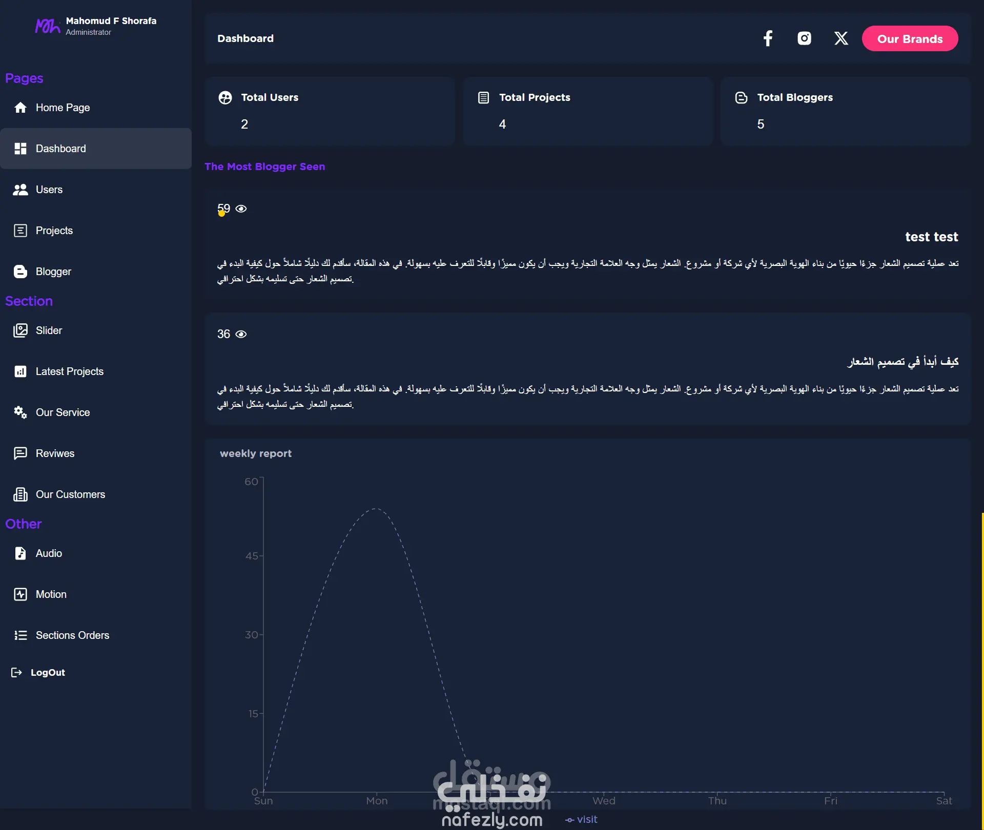 قمت ببناء موقع Dashboard حديث ومتطور يتميز بواجهة مستخدم بديهية وسهلة الاستخدام، مما يمكن المستخدمين من إدارة البيانات والمعلومات بكل سهولة وكفاءة. الموقع يستخدم أحدث التقنيات لضمان الأداء الأمثل والمرونة في التعامل مع البيانات. الميزات الرئيسية: واجهة مستخدم تفاعلية: تصميم بسيط ومرتب يسهل عملية التنقل وإدارة المعلومات. إدارة البيانات بسهولة: يمكن للمستخدمين إضافة وتعديل وحذف البيانات مباشرة من الـ Dashboard. السحب والإفلات (Drag and Drop): يسمح للمستخدمين بإعادة ترتيب المكونات أو البيانات بشكل مرن وسهل باستخدام تقنية السحب والإفلات، مما يوفر تجربة مستخدم سلسة وديناميكية. تحديثات في الوقت الحقيقي: يعرض الموقع البيانات المحدثة بشكل فوري بفضل التكامل المباشر مع قاعدة بيانات MongoDB. أمان البيانات: تم تطبيق أفضل ممارسات الأمان لحماية البيانات وضمان سرية المعلومات. صفحة رئيسية ديناميكية: تتكيف الصفحة الرئيسية بناءً على التحديثات والبيانات المضافة، مما يتيح للمستخدمين تخصيص وتجربة مرنة للمعلومات والبيانات المعروضة الوظائف الأساسية: لوحة تحكم متكاملة: توفر نظرة شاملة على البيانات والإحصائيات. إدارة المستخدمين: إضافة وتعديل وحذف المستخدمين وصلاحياتهم بسهولة. تقارير وتحليلات: عرض تقارير مفصلة وتحليلات بيانية تساعد في اتخاذ القرارات. إشعارات فورية: نظام إشعارات ينبه المستخدمين بالتحديثات الهامة والأحداث الجديدة. صفحة رئيسية ديناميكية: تتكيف وفقاً للمحتوى والتحديثات المستمرة لتوفير تجربة مخصصة للمستخدم. الأمان والأداء: مصادقة المستخدمين: باستخدام تقنيات حديثة مثل JSON Web Tokens (JWT) لضمان تسجيل دخول آمن. إدارة الجلسات: لضمان استمرار تجربة المستخدم دون انقطاع. تحسين الأداء: باستخدام تقنيات التحميل الكسول (Lazy Loading) والتخزين المؤقت (Caching) لتسريع أداء الموقع.