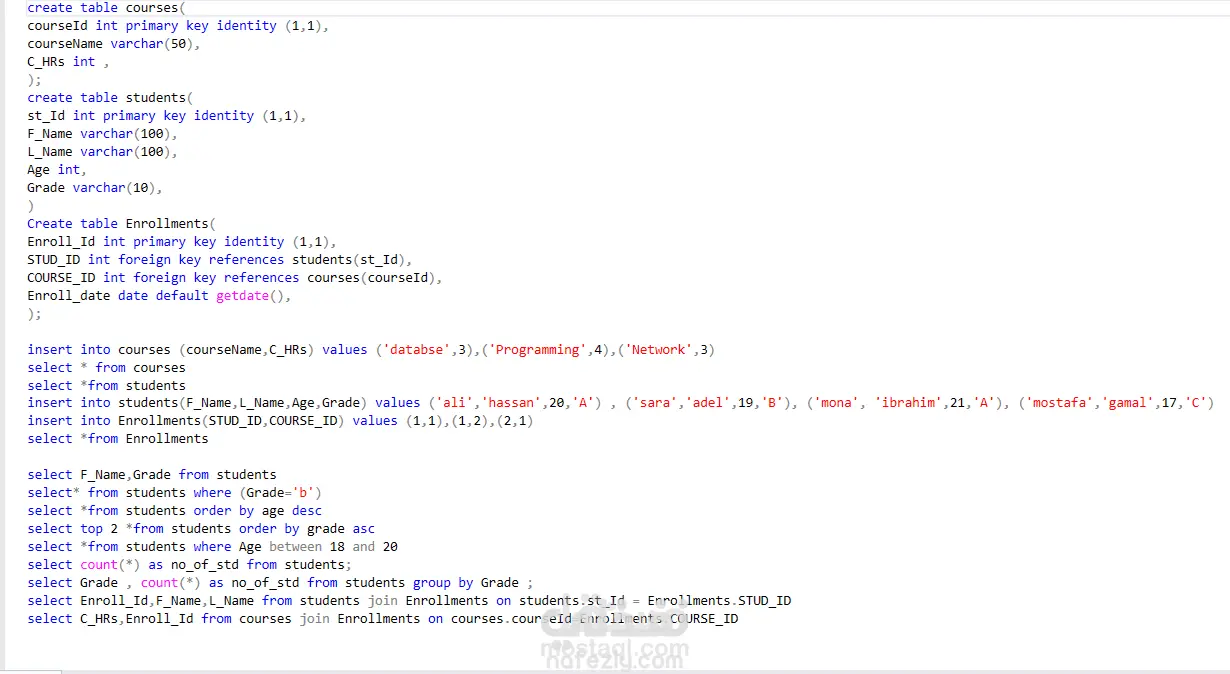 الكود بيعمل 3 جداول مترابطة: Courses: للمواد الدراسية (زي البرمجة والشبكات) وساعاتها المعتمدة. Students: لبيانات الطلاب (الاسم، السن، والتقدير). Enrollments: ده جدول "الربط" اللي بيسجل أي طالب دخل في أي كورس، وفيه تاريخ التسجيل بيتحط تلقائياً.