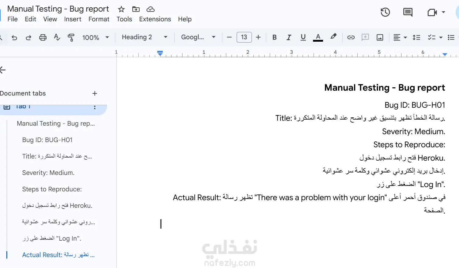 توثيق تقرير الثغرات (Bug Report): رصدت ثغرة برمجية (Bug ID: BUG-H01) تتعلق بظهور رسالة خطأ غير منسقة عند تكرار المحاولة، ووثقت "درجة الخطورة" و "خطوات إعادة الإنتاج" و "النتيجة الفعلية" (Actual Result).