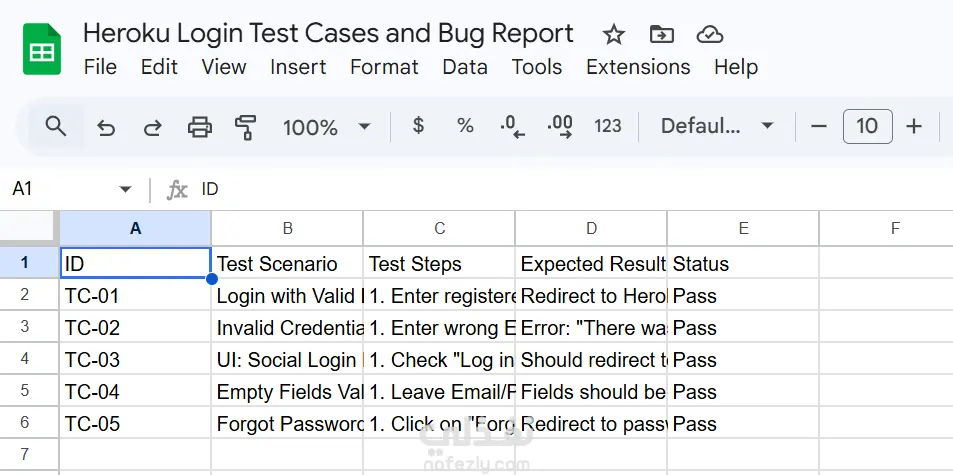 تصميم مصفوفة حالات الاختبار (Test Cases Matrix): إعداد جدول تفصيلي يتضمن 5 سيناريوهات أساسية (TC-01 إلى TC-05) تشمل الدخول بالبيانات الصحيحة، الخاطئة، الحقول الفارغة، واستعادة كلمة المرور.