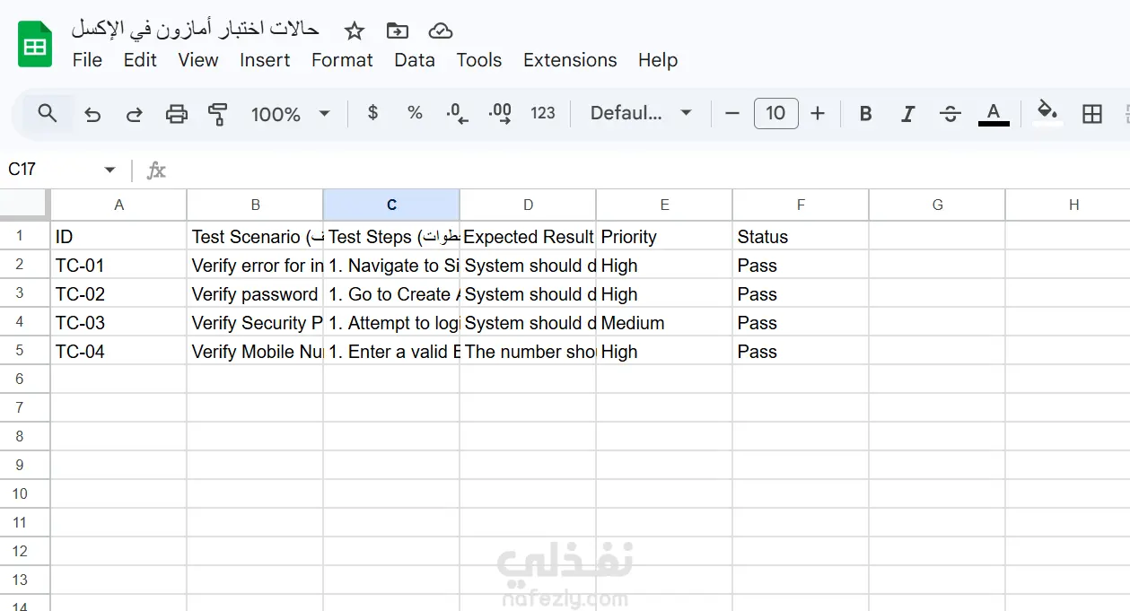 توثيق النتائج: إعداد جدول يوضح الخطوات (Test Steps)، النتيجة المتوقعة (Expected Result)، وحالة الاختبار (Status).
