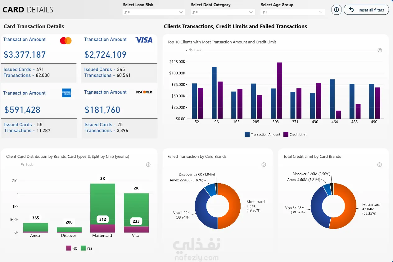 1️⃣ Financial Health Dashboard – Power BI لوحة معلومات لتحليل الوضع المالي للعملاء تشمل تحليل الديون، مؤشر المخاطر المالية، ونسبة الدين إلى الدخل مع تقارير تفاعلية حسب الفئات العمرية. 2️⃣ Card Transactions Dashboard – Power BI لوحة معلومات لتحليل معاملات بطاقات الائتمان تعرض حجم المعاملات وحدود الائتمان وأعلى العملاء استخدامًا للبطاقات. 3️⃣ Blinkit Sales Dashboard – Power BI لوحة معلومات لتحليل المبيعات تعرض إجمالي المبيعات ومتوسط التقييم وعدد المنتجات مع تحليل الأداء حسب نوع المتجر والموقع. 4️⃣ Sales & Profit Dashboard – Power BI لوحة معلومات لتحليل المبيعات والأرباح تعرض الأداء السنوي للمبيعات وأفضل المنتجات والمبيعات حسب الولايات.
