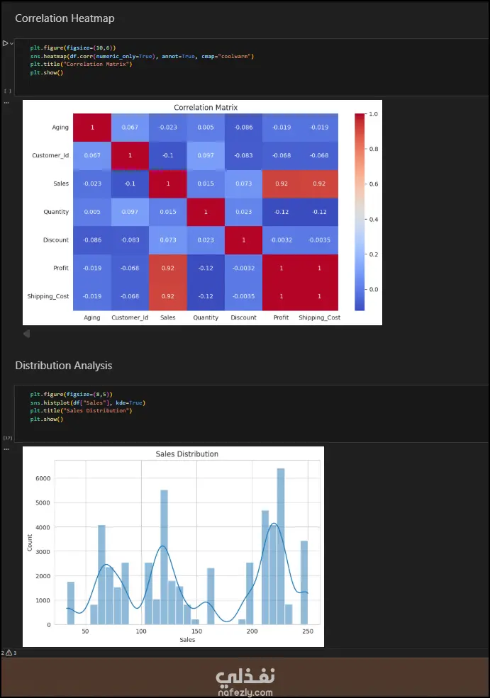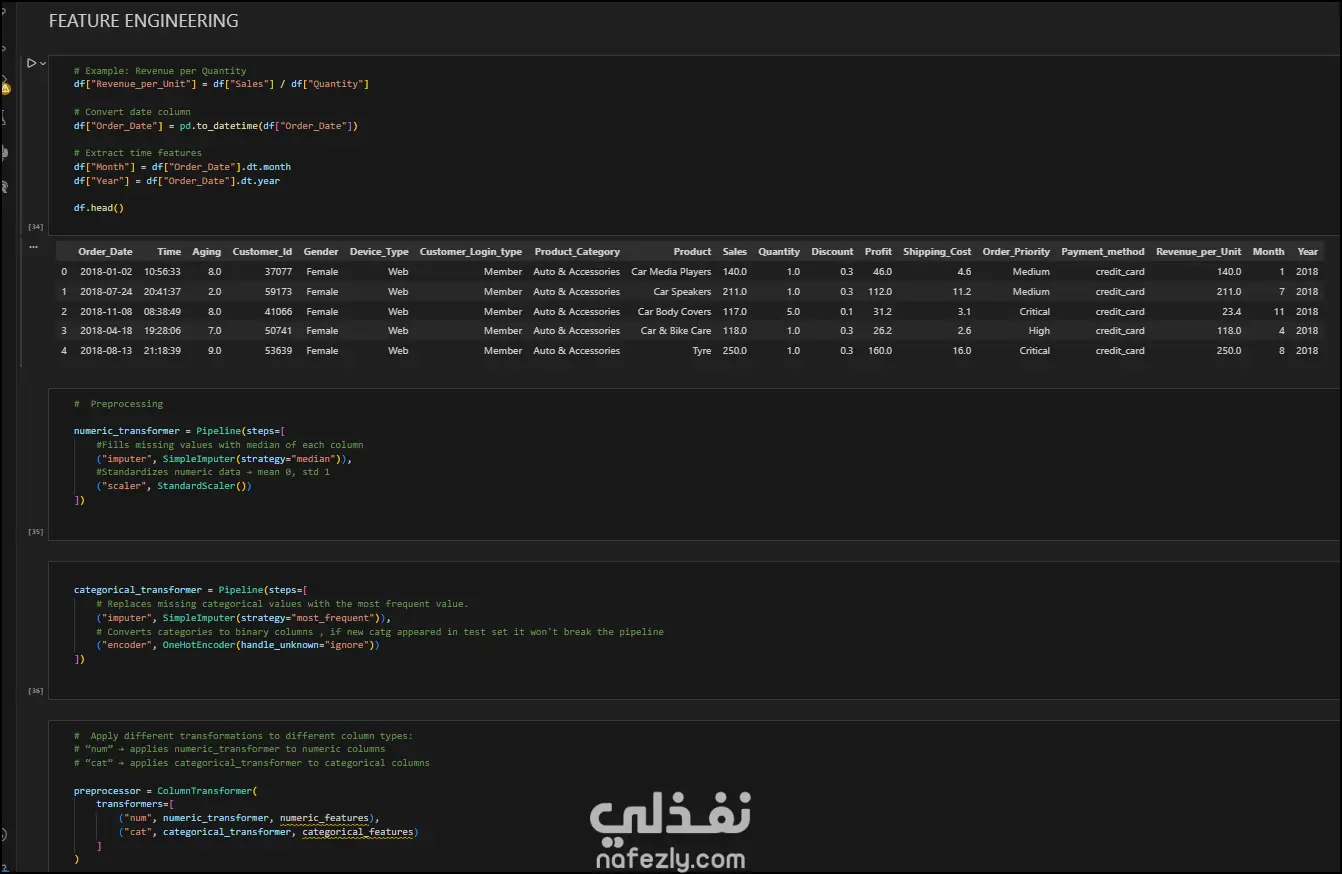 هذا المشروع يهدف إلى تحليل شامل لبيانات متجر إلكتروني يضم أكثر من 51,000 عملية بيع، لاستخراج رؤى بيعية وتجهيز البيانات للنماذج التنبؤية. المشروع مقسم إلى عدة مراحل تقنية متطورة: التحليل الاستكشافي الآلي (Automated EDA): استخدام أدوات تقارير احترافية لفحص إحصائيات البيانات، أنواع المتغيرات، ونسبة القيم المفقودة (التي كانت 0% في هذا المشروع). تحليل الارتباطات والتوزيع (Visual Analysis): دراسة العلاقة بين المتغيرات مثل (الربح، المبيعات، وتكلفة الشحن) باستخدام Heatmaps، وتحليل توزيع المبيعات باستخدام Histograms. هندسة الميزات (Feature Engineering): إضافة أعمدة جديدة ذكية مثل "Revenue per Unit" واستخراج بيانات زمنية (الشهر والسنة) من تاريخ الطلب لفهم الأنماط الموسمية. خطوط المعالجة (Preprocessing Pipelines): بناء نظام معالجة متكامل باستخدام Scikit-Learn يقوم بـ: معالجة القيم الرقمية (Scaling & Imputing). تشفير المتغيرات الفئوية (OneHot Encoding) لضمان جاهزية البيانات لأي موديل ذكاء اصطناعي. الأدوات المستخدمة (Tech Stack): Pandas & Polars: للتعامل مع البيانات الضخمة بكفاءة. Seaborn & Matplotlib: للتمثيل البياني المتقدم. Scikit-Learn: لبناء الـ Pipelines و الـ Transformers.