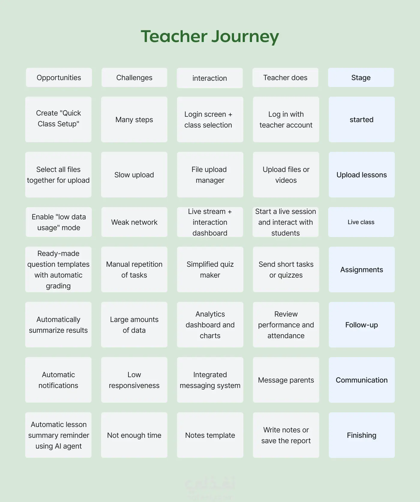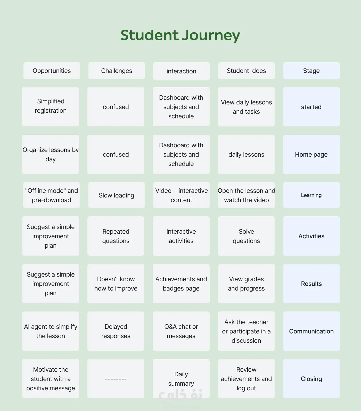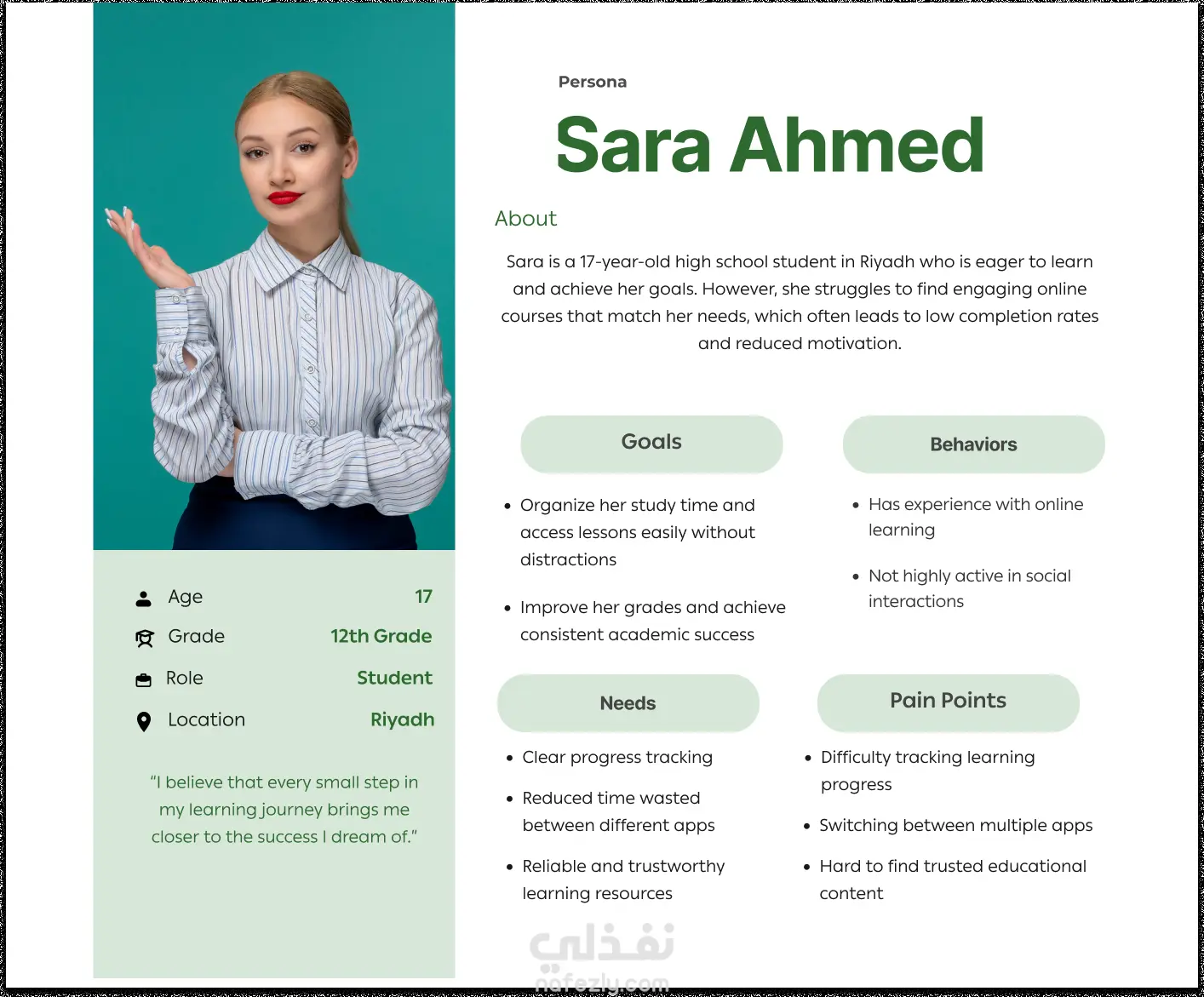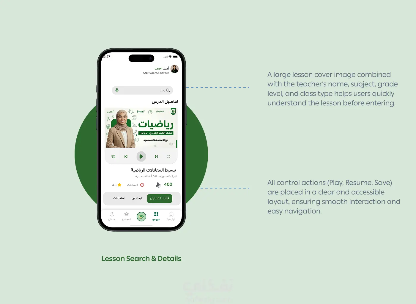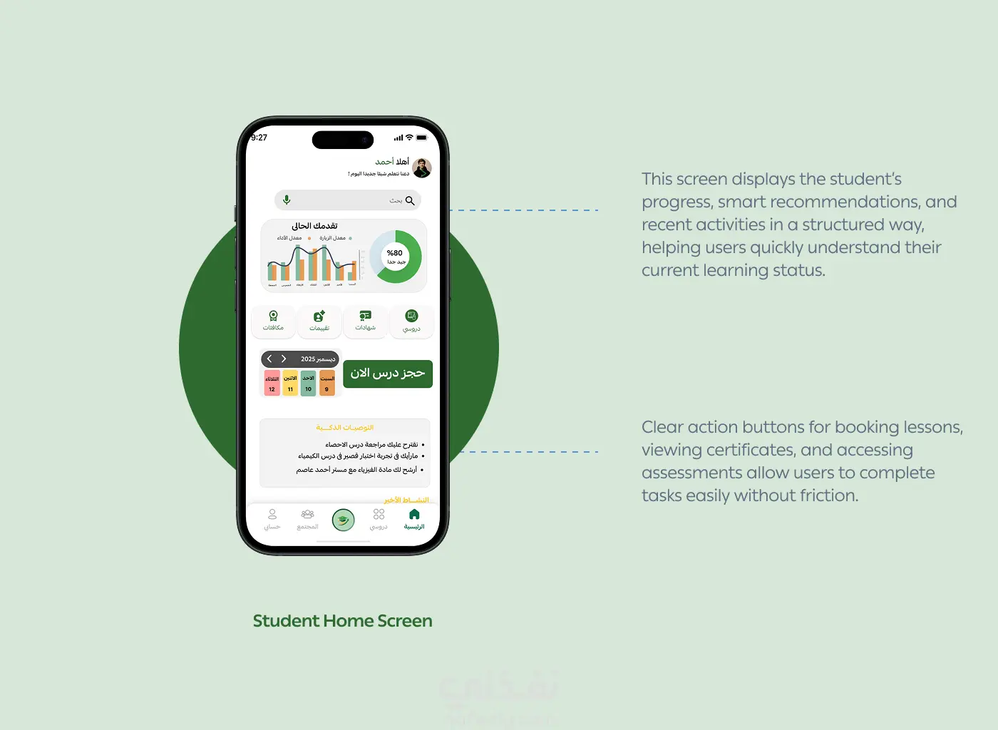 تصميم منصة تعليمية ذكية تساعد الطلاب على متابعة تقدمهم، والحصول على توصيات مخصصة، وحجز الدروس بسهولة. يعتمد المشروع على دراسة احتياجات المستخدمين وتقديم واجهات بسيطة وواضحة تسهّل التعلم وتوفّر تجربة حديثة للطلاب والمعلمين وأولياء الأمور.