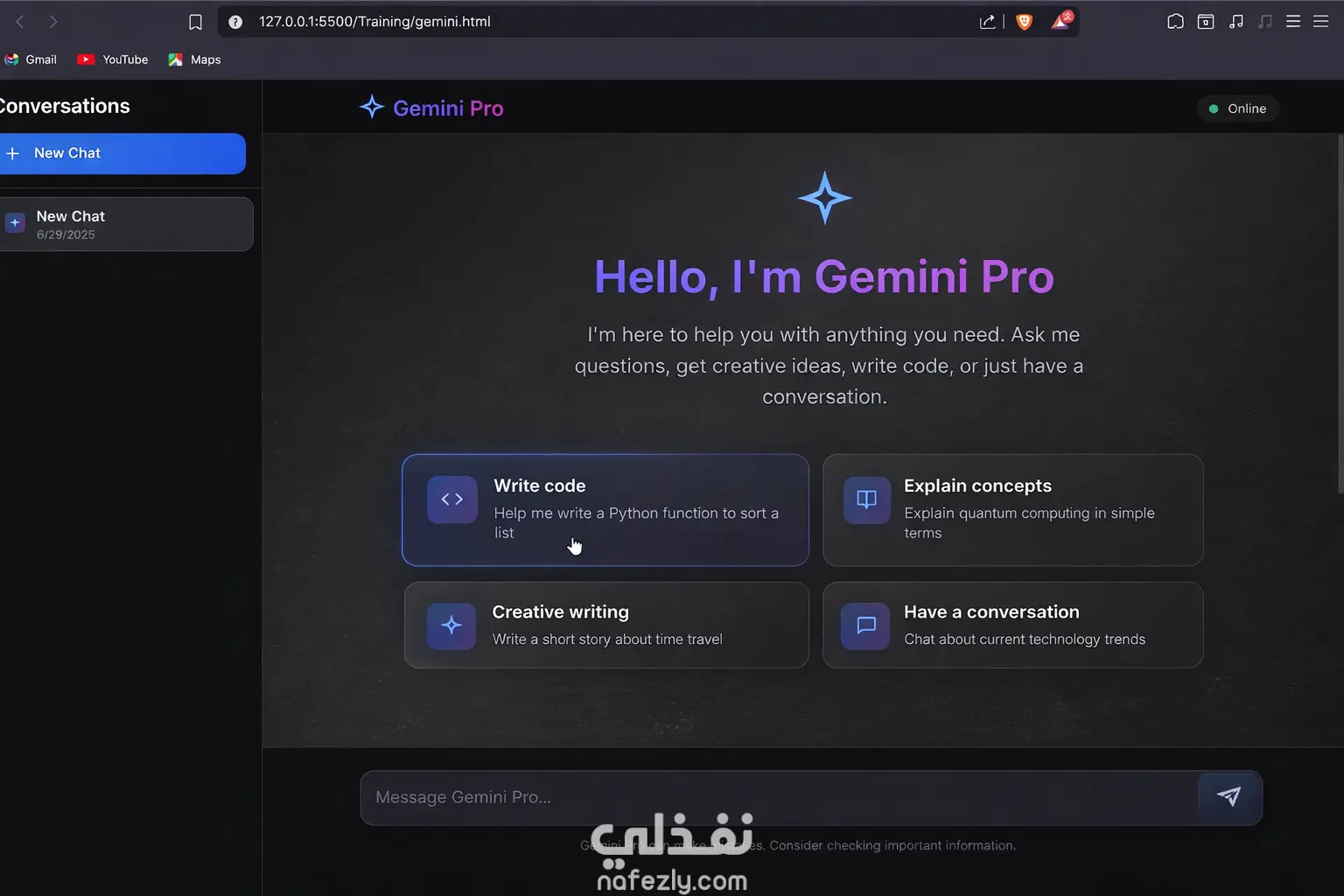 روبوت محادثة ذكي يعمل بالذكاء الاصطناعي مصمم لتقديم ردود دقيقة وواعية بالسياق مع واجهة استخدام حديثة وسهلة الاستخدام. يركز هذا المشروع على دمج قدرات الذكاء الاصطناعي المتقدمة مع تجربة مستخدم سلسة وبديهية لضمان تفاعل طبيعي وفعال مع المستخدمين. يتميز النظام بتوليد ردود ذكية، وتصميم واجهة نظيف ومتجاوب، وأداء سريع، وإدارة ذكية للمحادثات لتحسين تجربة المستخدم. يعكس Gemini Pro شغفي ببناء حلول تعتمد على الذكاء الاصطناعي تجمع بين القوة التقنية والتصميم الجذاب، وأعمل باستمرار على تطوير ميزاته وتوسيع إمكانياته. يسعدني سماع آرائكم وملاحظاتكم حول المشروع.