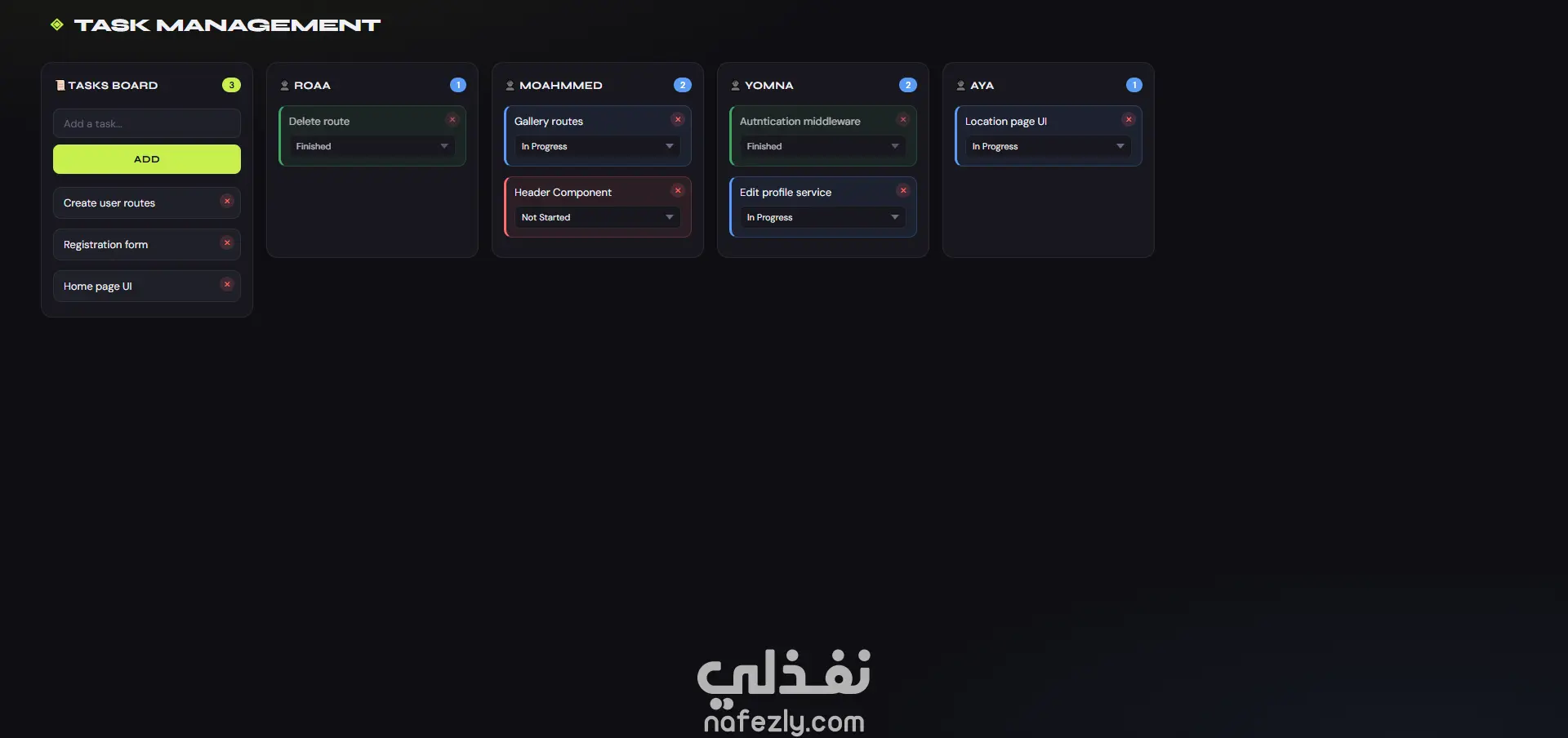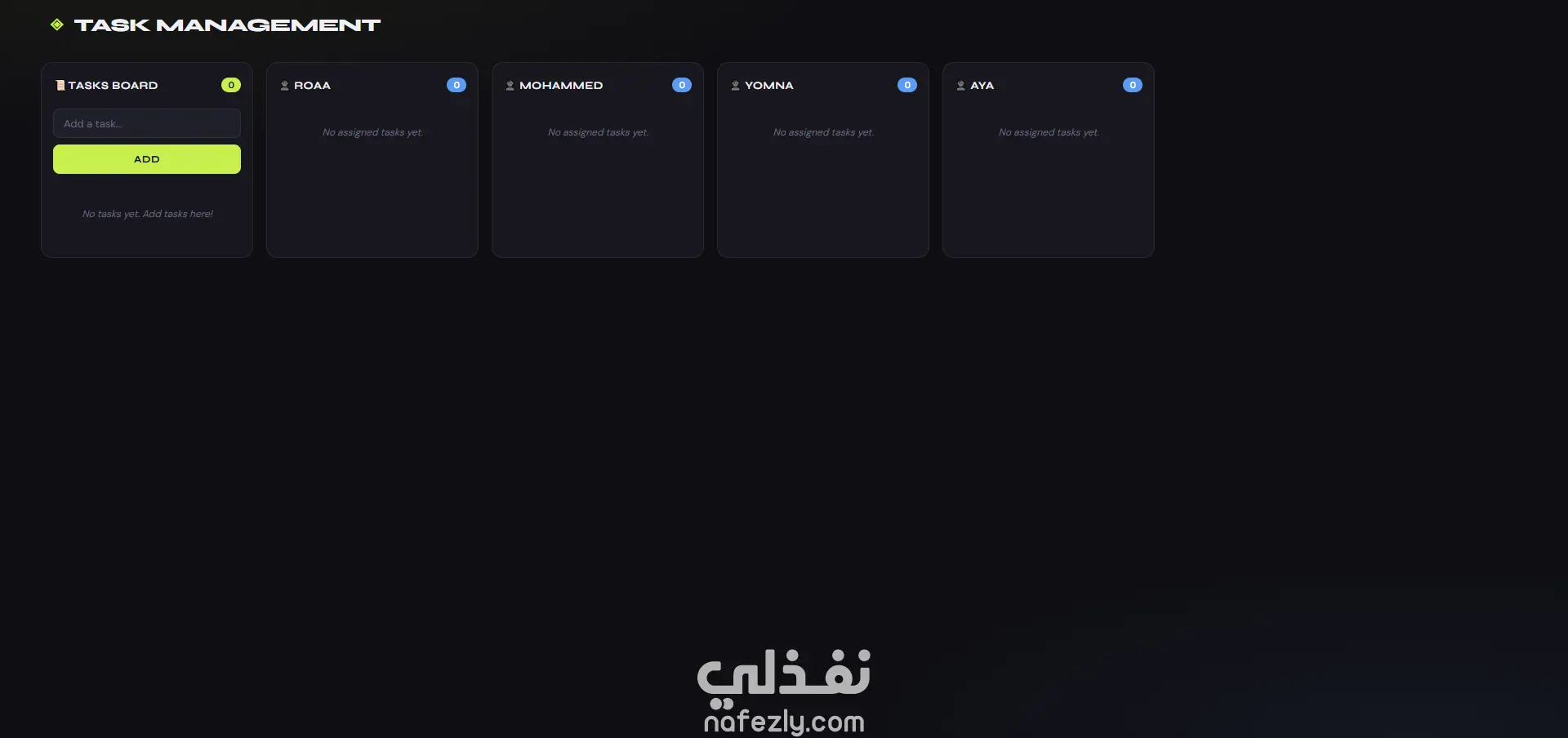 يتيح التطبيق إنشاء لوحة مهام مخصصة لكل عضو في الفريق، مع إمكانية سحب وإفلات المهام بين اللوحات بسهولة. لكل مهمة حالة قابلة للتغيير (لم تبدأ / قيد التنفيذ / مكتملة) مع تلوين تلقائي يعكس الحالة. يدعم التطبيق إضافة المهام وحذفها، وعرض عداد للمهام على كل لوحة، مع واجهة لإدخال أسماء أعضاء الفريق.