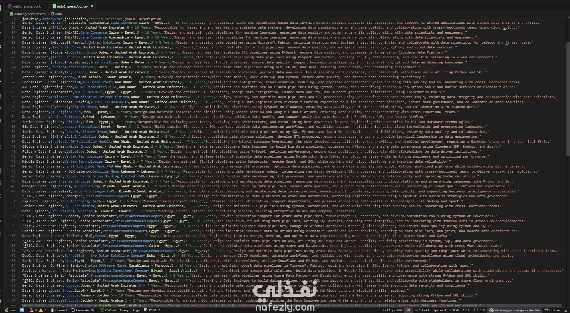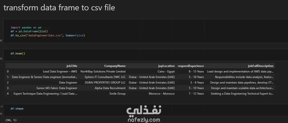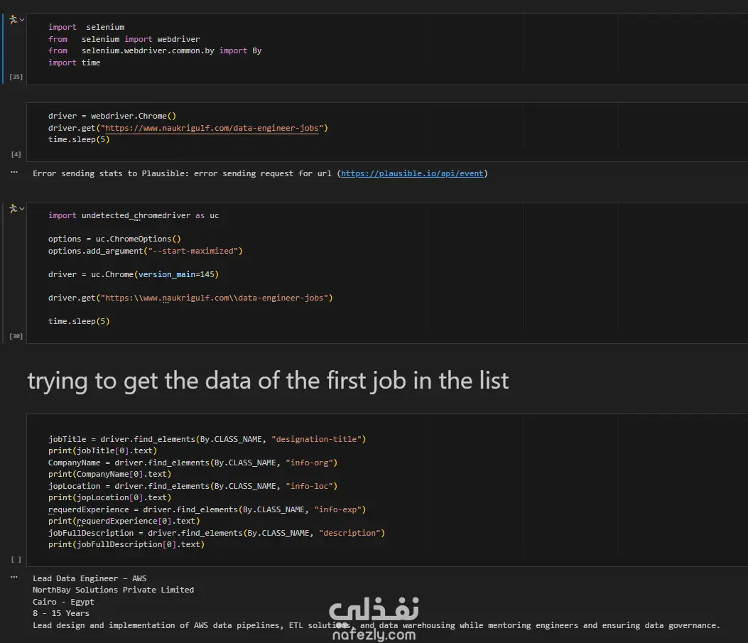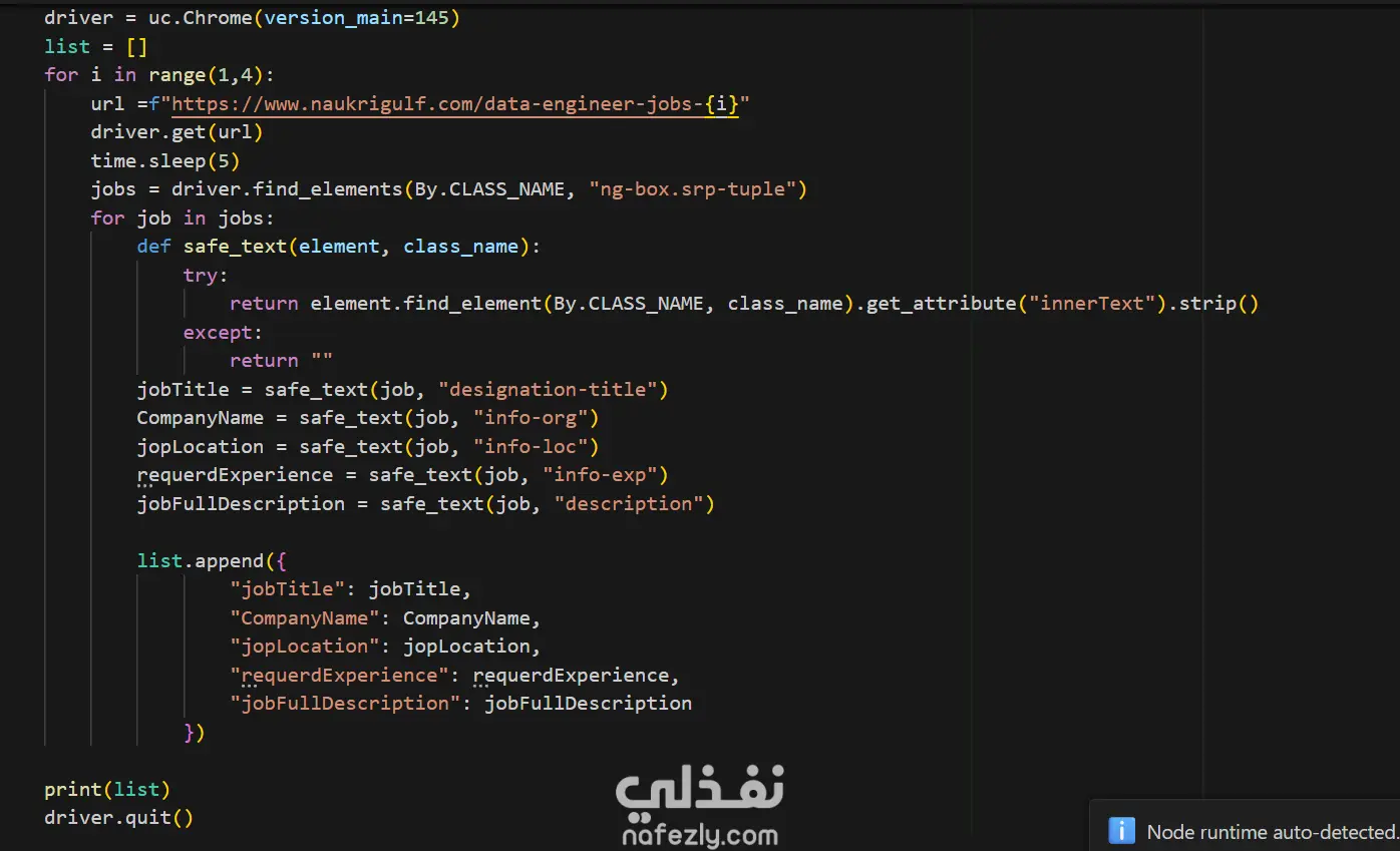 قمت بتنفيذ مشروع web scraping لاستخراج بيانات وظائف Data Engineer من موقع NaukriGulf، وهو من أكبر مواقع التوظيف في منطقة الخليج.