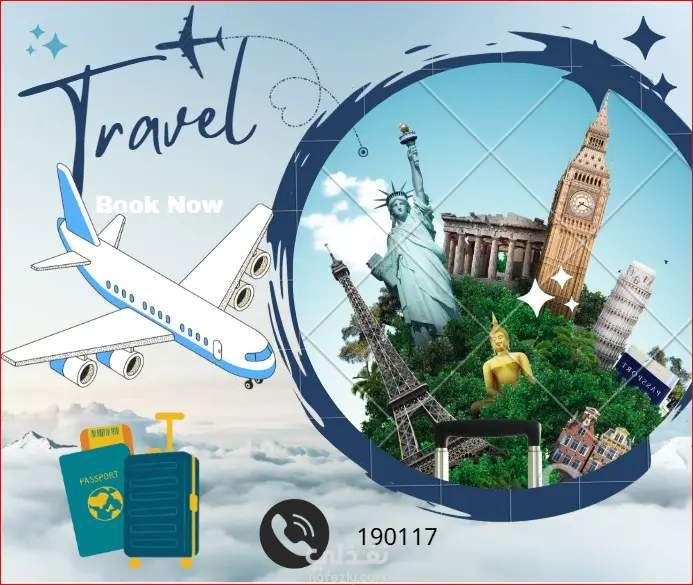اسم المشروع: تصميم الهوية الإعلانية لشركة سياحة وسفر (Travel & Tourism Poster). الهدف (Objective): تحفيز الجمهور على اتخاذ قرار السفر من خلال تقديم وجهات سياحية بأسلوب بصري ساحر يدمج بين الراحة والمغامرة. مفهوم التصميم (Visual Concept): تكوين الصور (Photo Manipulation): دمج صور عالية الجودة لوجهات عالمية مع عناصر طبيعية (مثل الطيور، السحب، أو المعالم الأثرية) لخلق عمق بصري (Depth) وتجربة غامرة للمشاهد. لوحة الألوان (Color Palette): استخدام ألوان الطبيعة؛ مثل الأزرق السماوي لتعزيز الشعور بالحرية، والأخضر للاستجمام، أو البرتقالي الدافئ لإيحاء بغروب الشمس الساحر. التايبوجرافي (Typography): استخدام خطوط عريضة (Bold) ومائلة قليلاً للكلمات المفتاحية مثل "Discover" أو "Travel" لإعطاء إيحاء بالحركة، مع خطوط نحيفة وأنيقة لتفاصيل الرحلة والأسعار. عناصر الجذب (Call to Action): إبراز أرقام التواصل أو رابط الموقع داخل "أيقونات" مرتبطة بالسفر (مثل طائرة ورقية أو دبوس خريطة) لضمان سهولة الوصول للعميل. الأدوات المستخدمة (Tools Used): Adobe Photoshop: لدمج المناظر الطبيعية (Compositing)، ضبط الإضاءة وتوحيد الألوان (Color Grading) لجعل البوستر يبدو كقطعة فنية واحدة. النتيجة (Result): بوستر إعلاني جذاب بصرياً، ينجح في نقل المشاهد ذهنياً إلى الوجهة السياحية بمجرد النظر إليه، مما يزيد من معدلات الاستفسار والحجز.