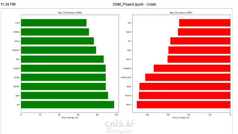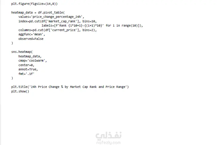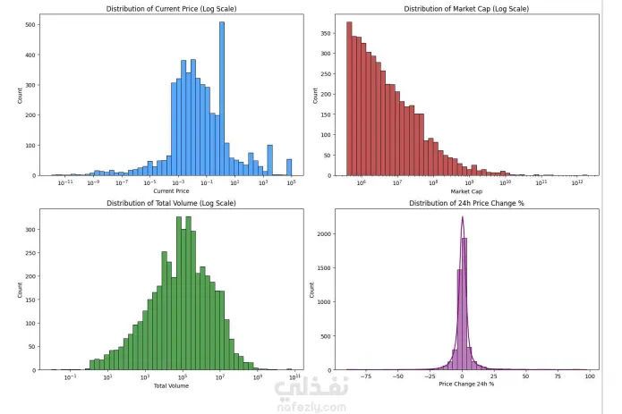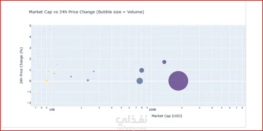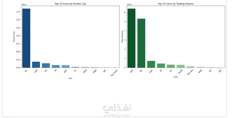قمت بتنفيذ مشروع تحليل بصري لبيانات سوق العملات الرقمية باستخدام Python بهدف فهم حركة السوق بشكل أوضح وتحويل البيانات الخام إلى نتائج قابلة لدعم اتخاذ القرار. فكرة المشروع اعتمدت على تحليل بيانات السوق الحالية للعملات الرقمية واستخدام تقنيات Data Visualization لعرض توزيع الأسعار باستخدام Log Scale لتوضيح الفروق الكبيرة بين العملات، وتحليل القيمة السوقية Market Cap لتحديد العملات المسييطرة، وتحليل حجم التداول Trading Volume لقياس السيولة، وعرض أفضل 10 عملات من حيث القيمة السوقية، وأعلى وأقل العملات أداءً خلال 24 ساعة، بالإضافة إلى إنشاء Heatmap لتحليل درجة التقلب، وتصميم Bubble Chart لعرض العلاقة بين القيمة السوقية والتغير اليومي وحجم التداول. الأدوات المستخدمة Python Pandas Matplotlib Seaborn Plotly ما يميز المشروع لم أكتفِ بعرض الرسوم البيانية فقط، بل ركزت على تفسير النتائج وربطها بحركة السوق الفعلية لاستخراج مؤشرات تساعد في تحديد العملات ذات السيطرة السوقية، وفهم مستوى السيولة، وقياس درجة التقلب، وتحديد أفضل وأسوأ أداء يومي.