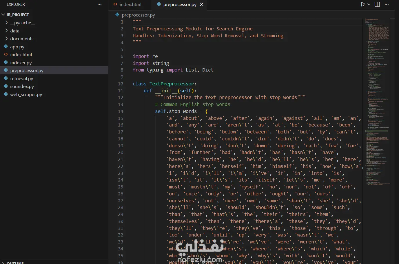 قمت ببناء محرك بحث بسيط يعتمد على تقنية الفهرس المعكوس (Inverted Index) للبحث السريع داخل مجموعة من المستندات النصية. شمل المشروع: معالجة النصوص (Tokenization – إزالة التوقف – التجذير) بناء الفهرس المعكوس تنفيذ خوارزمية البحث والاسترجاع ترتيب النتائج حسب الصلة تطوير واجهة بسيطة للبحث النتيجة: محرك بحث فعّال يسترجع النتائج بسرعة ودقة عالية من مجموعة بيانات نصية. الأدوات المستخدمة: Python – NLP – Flask / Streamlit – HTML / CSS